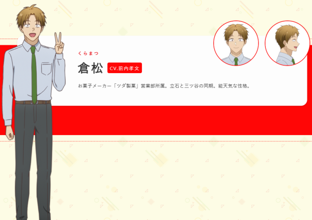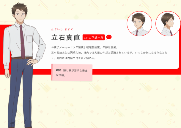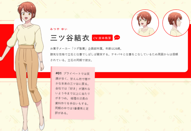 即使是祕密交往也不是因為公司規定不准許職場戀愛這類嚴肅的規則,僅僅只是因為有些害羞又擔心成為別人雜談笑鬧時口中閒聊話題的這種可愛理由,會讓旁邊的觀眾隨著兩人的互動而勾起姨母的笑容。