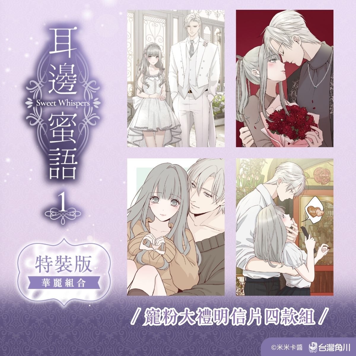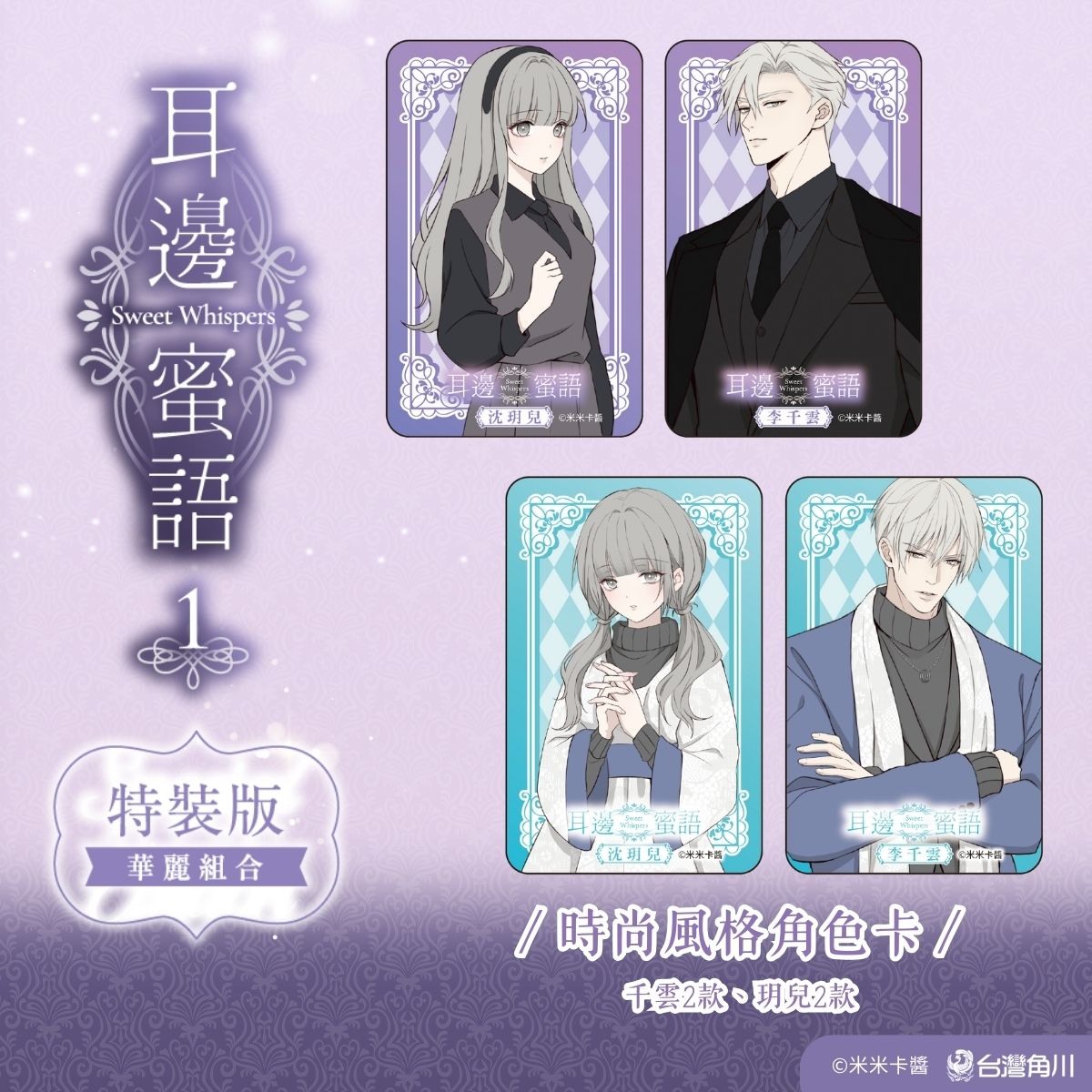 耳邊蜜語》(1)特裝版內含多項限定特典:「耳邊蜜語 IG 透卡」、「寵粉大禮明信片四款組」、「Q 版人物拭鏡布」、「千雲、玥兒拍立得簽名卡組」、「時尚風格角色卡:千雲 2 款、玥兒 2 款」以及漫畫單行本第一集。