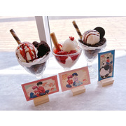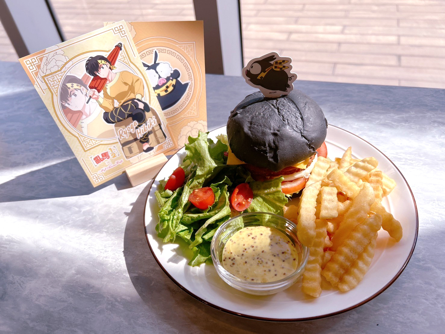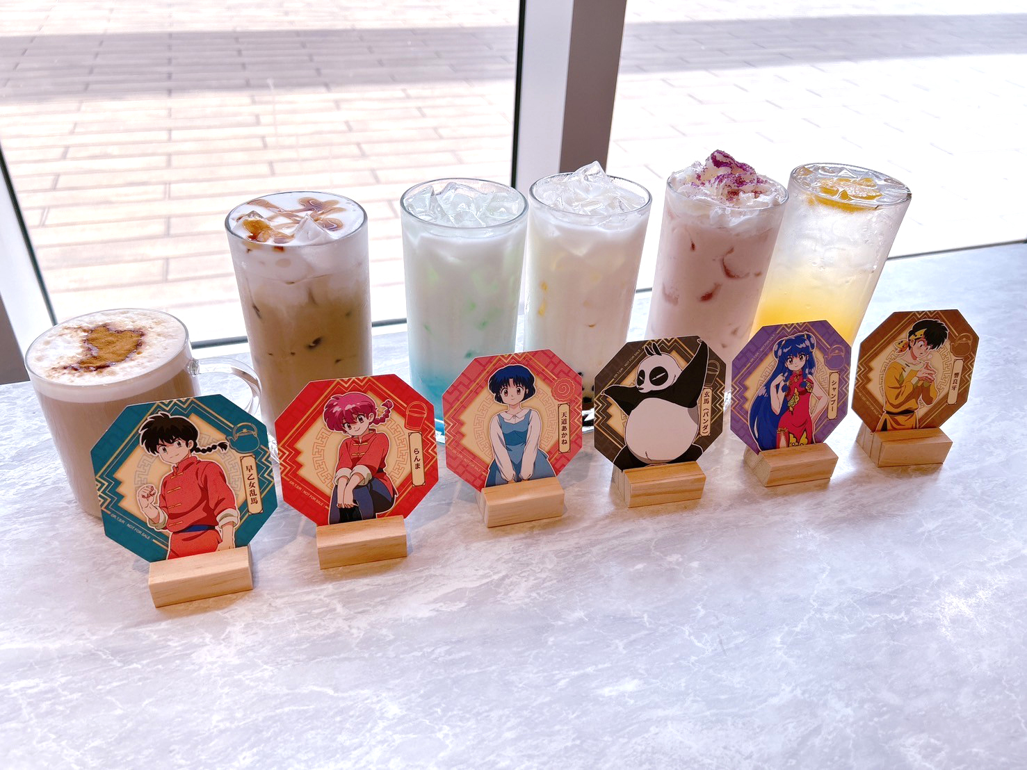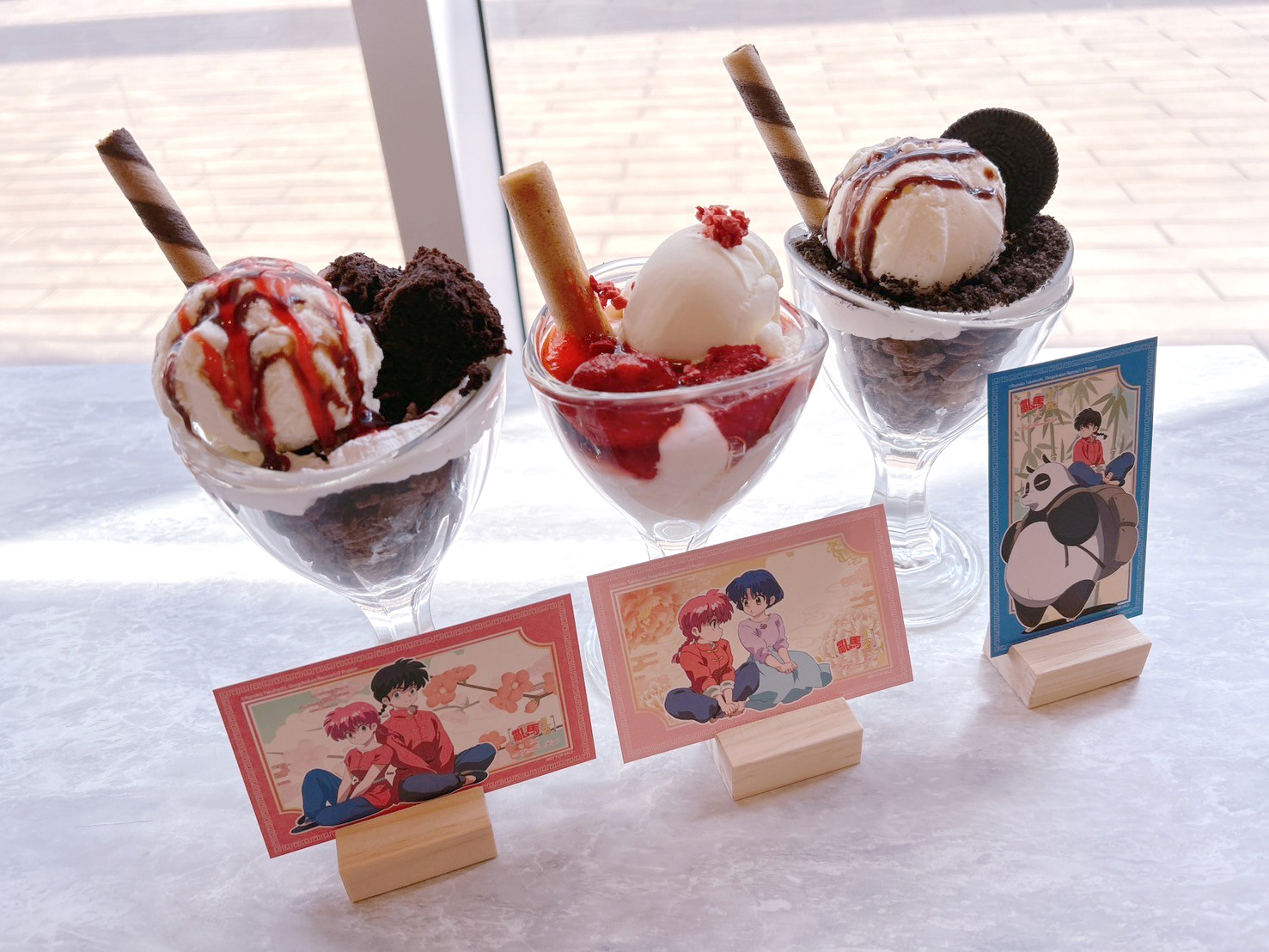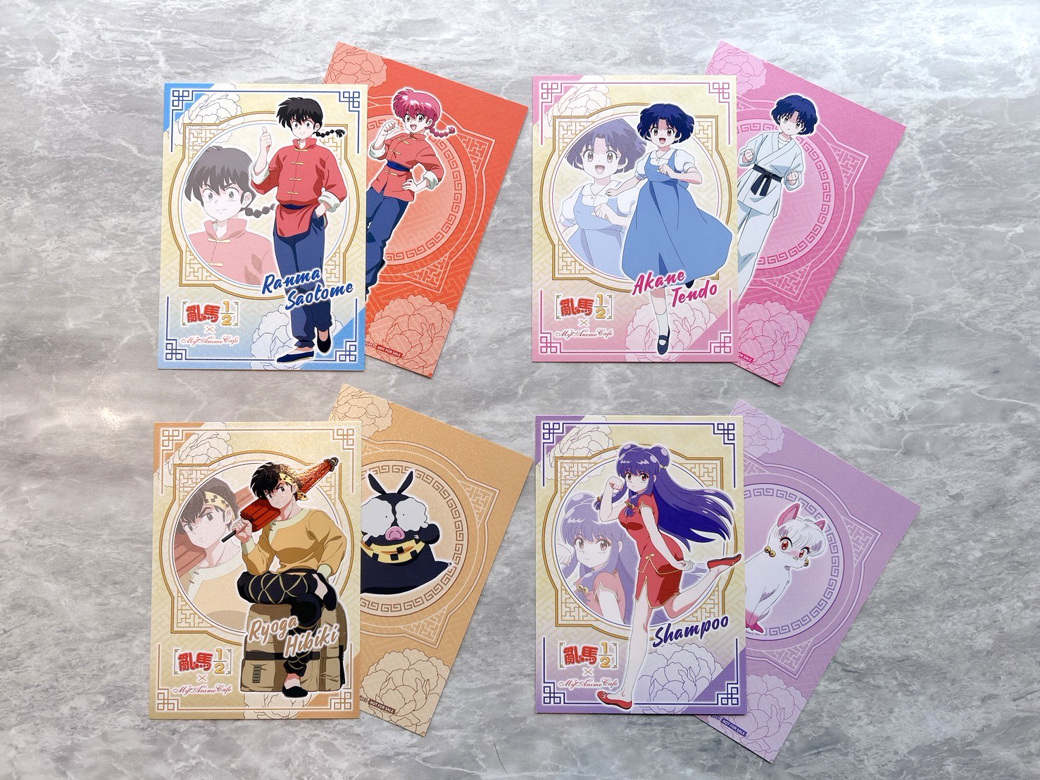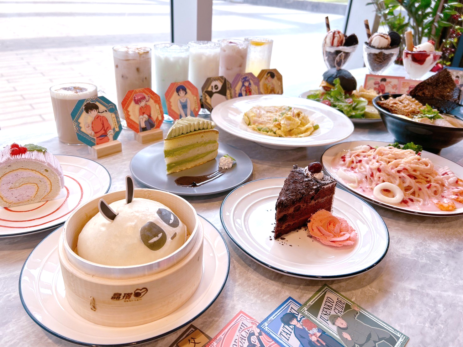 亂馬 1/2》主題 Café 推出以各重要角色設定的主題餐點,主餐推出亂馬、小茜、良牙、珊璞 4 位角色料理,以作品印象打造中華風料理以及貓飯店的拉麵,享用主餐可獲得角色雙面紀念卡。以角色印象設計的聖代,搭配美圖特典。4 款重要角色設定的甜點,包含以早乙女玄馬、九能兄妹,還有存在感貫穿全劇的咒泉鄉導遊設定的甜點,點餐即贈角色小卡;內用或外帶飲料,還可獲得隨機杯墊 1張。