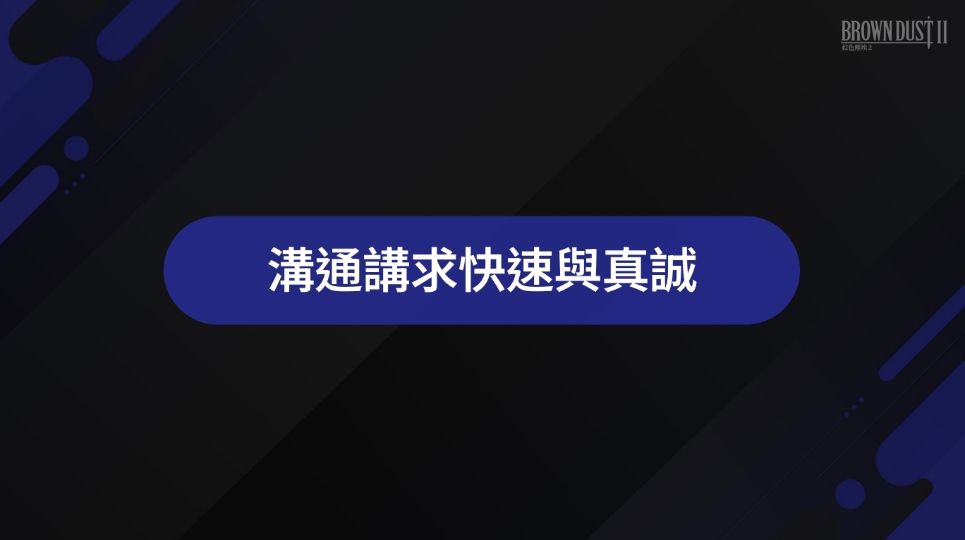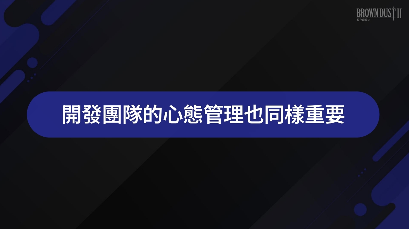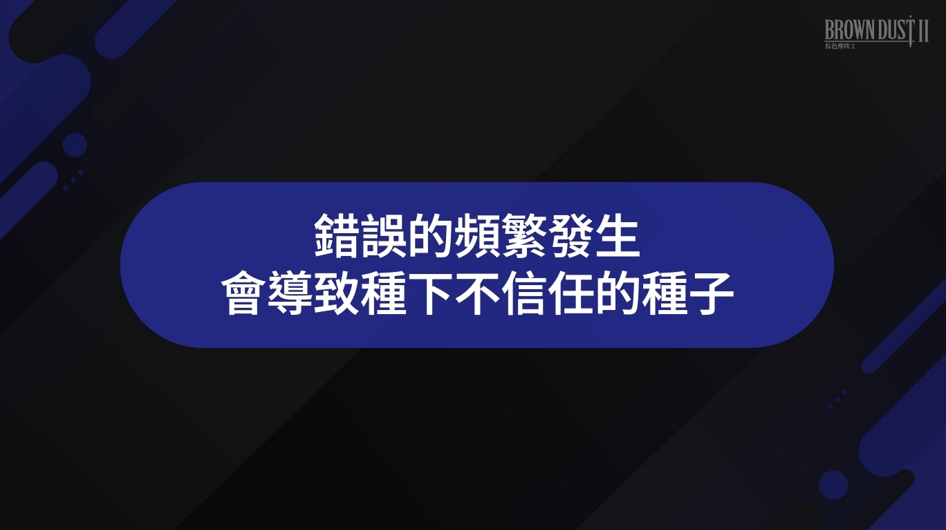 棕色塵埃 2》1.5 週年以來的服務歷程。如果遊戲從上市就能相當順利,自然沒有什麼問題,但如果是與我們碰到類似情況的開發者們,也希望能以此做為參考的版本。當遊戲指標持續下降時,最重要的就是轉型,最主要就是如何止跌回升,創造反彈的機會。我們必須站在用戶的立場,雖然 PD 需要有所堅持,但在遊戲營運的階段如何維護與玩家們的關係是更為重要的。此外,如果遊戲遭到玩家們冷落,這就是遊戲存在某種問題的訊號,必須循序漸進的改善。PD 的浪漫只有在基本功夫扎實的時候,才能夠大放異彩。」