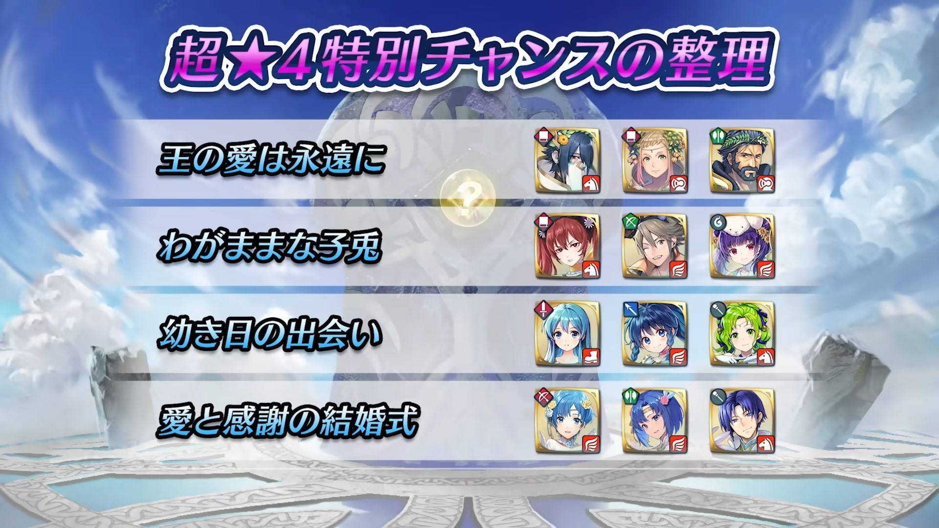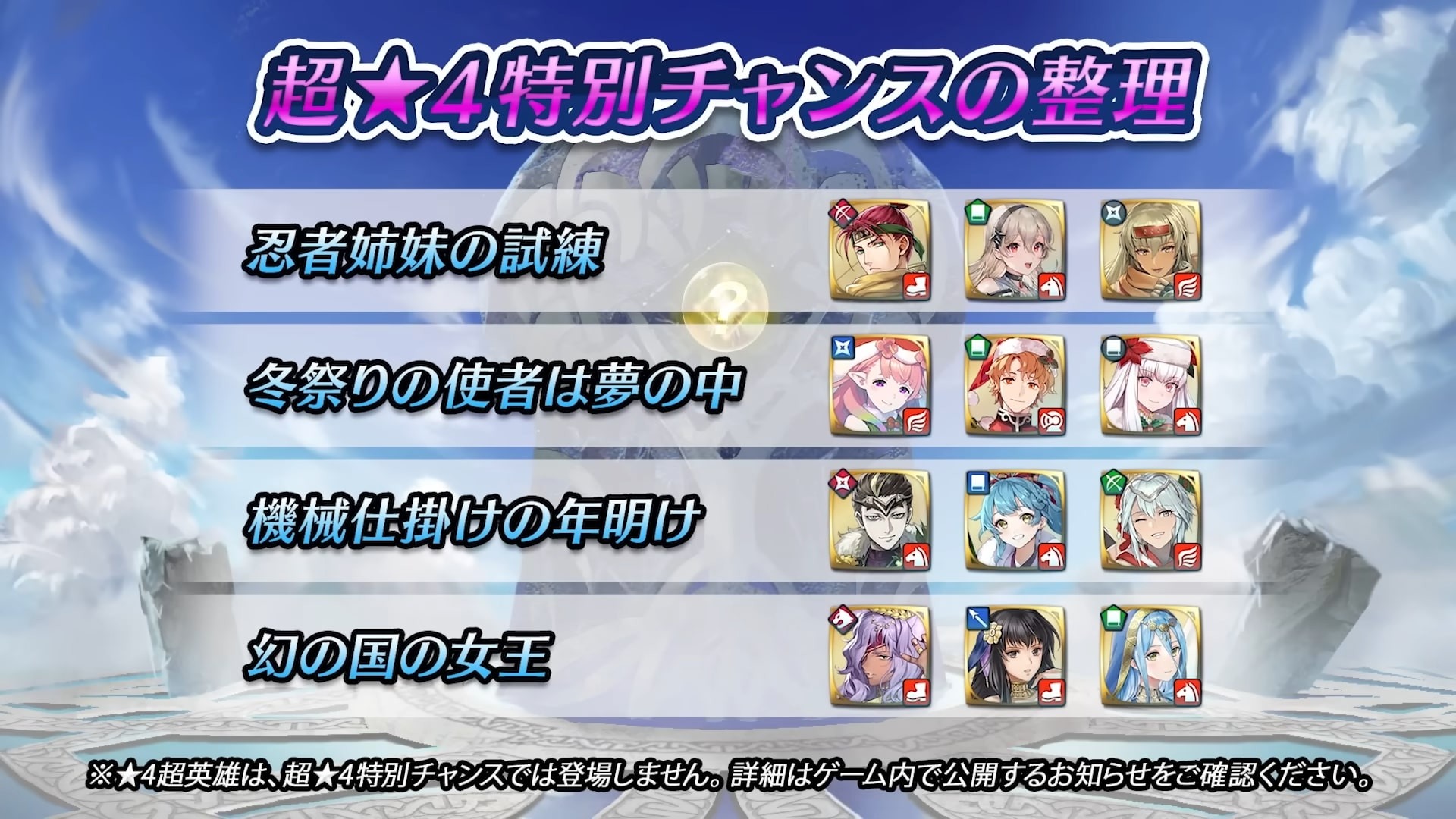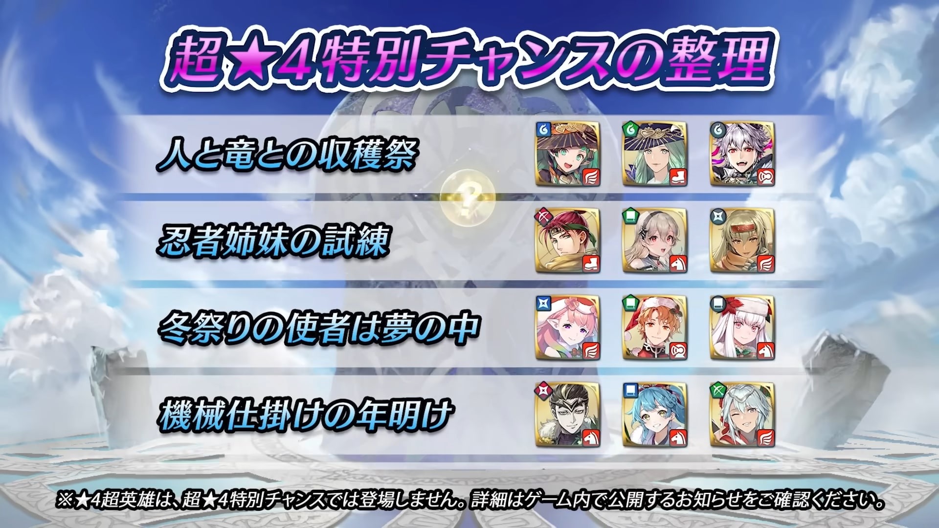 下次更新之後,於版本 5.2 至 6.1 為止登場的 39 位超英雄,將會以超★4 特別機會登場。在這些英雄登場的超英雄召喚活動中,也適用超★4 特別機會。