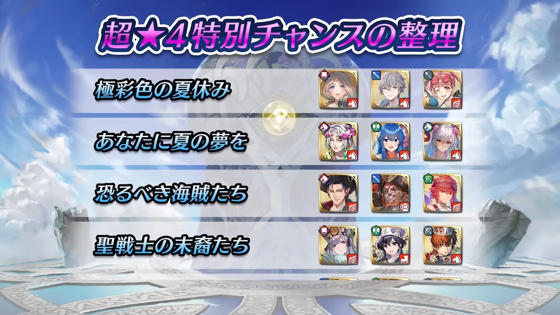 進行 40 次的召喚後, 任何玩家都可進行僅限 1 次的「任選召喚」,登場的傳承英雄為以上 15 位。