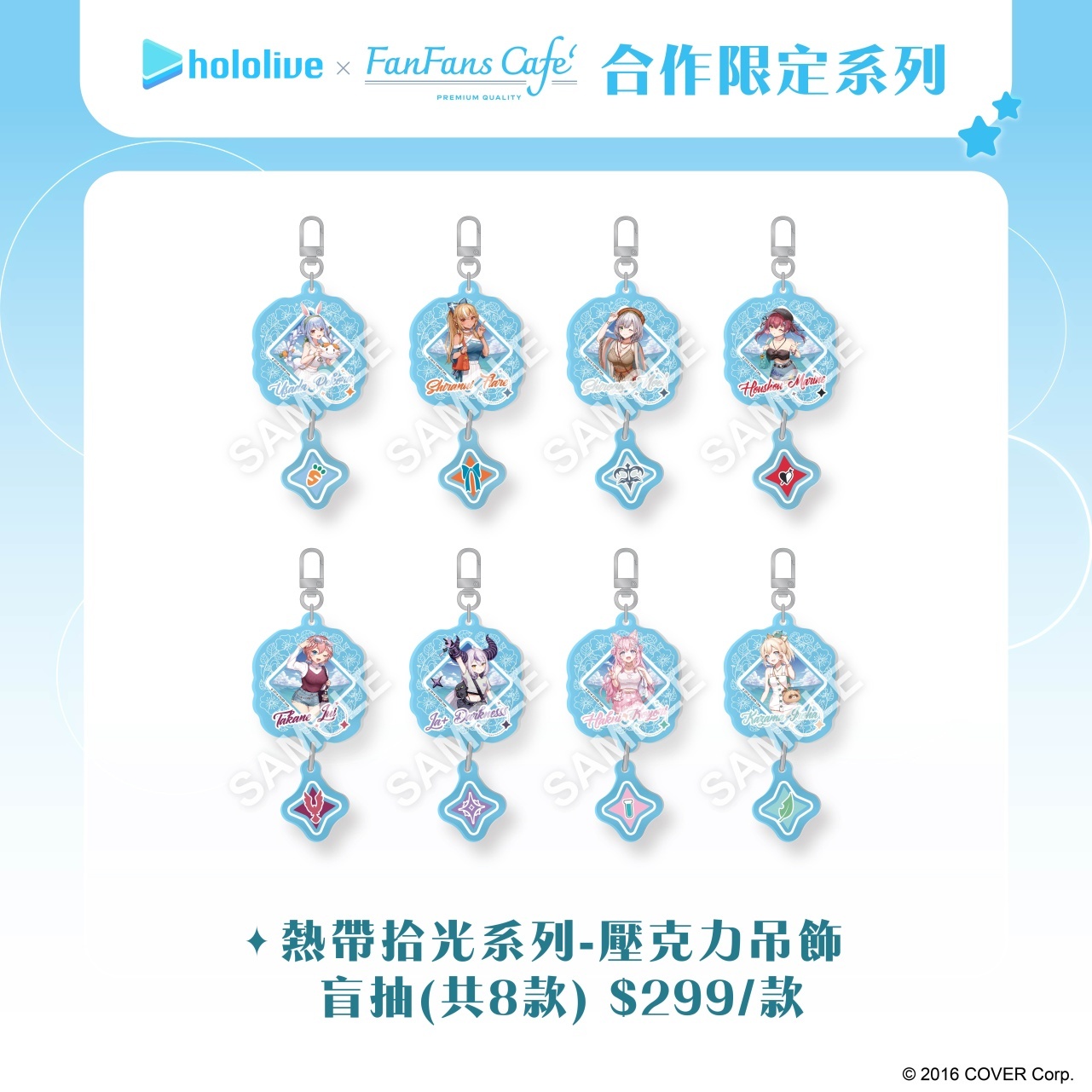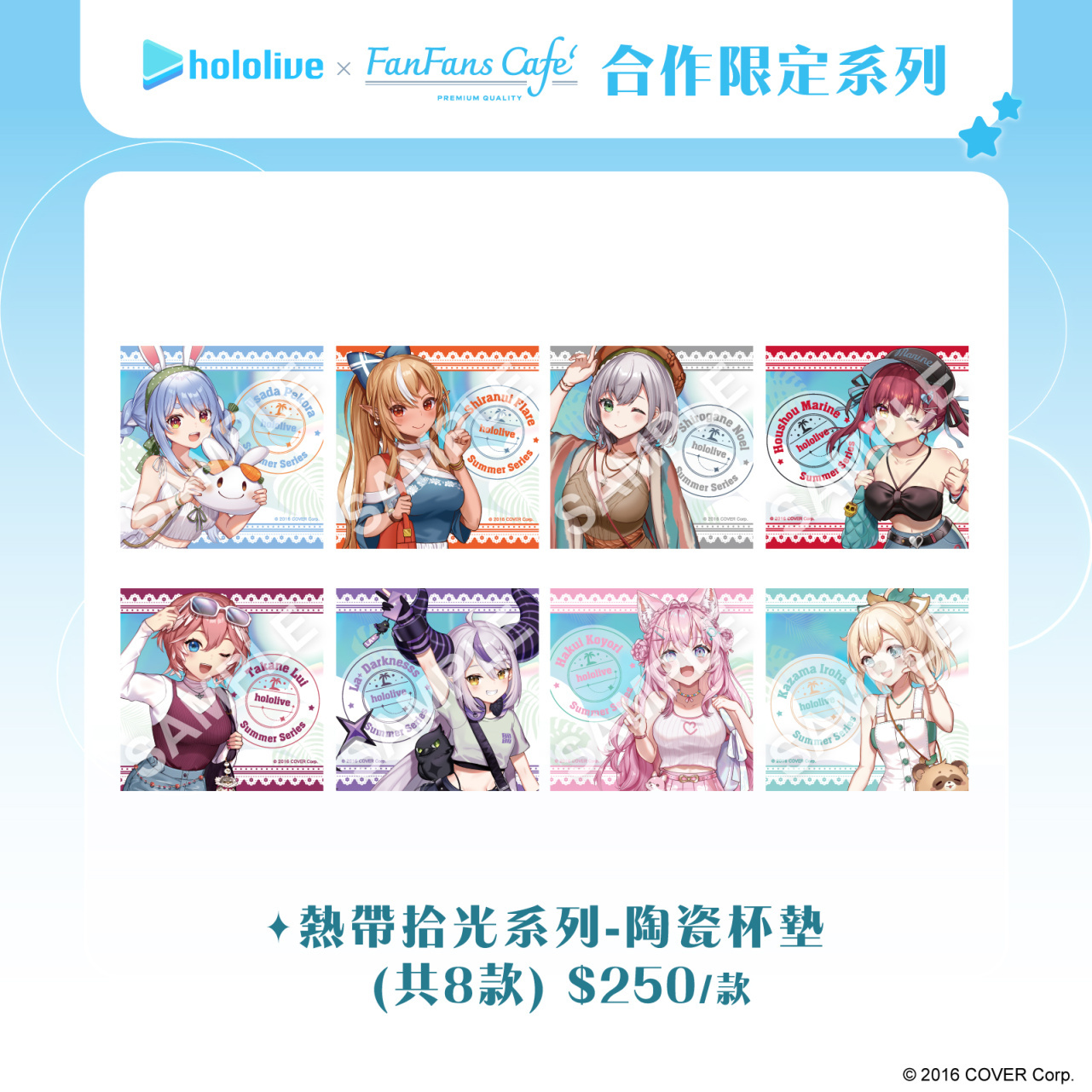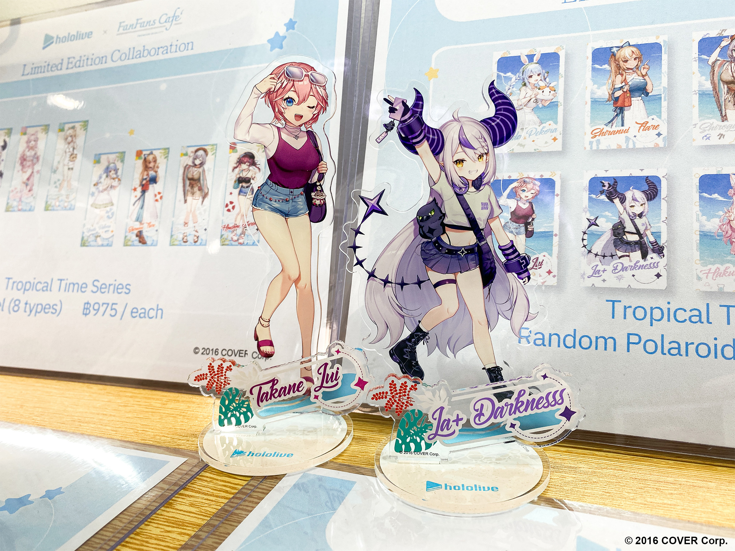除了在泰國推出主題咖啡廳外,本次的「熱帶拾光」系列限定商品也將同步在台灣販售,其中包含壓克力立牌及小卡,壓克力立牌特別模擬攝影機的畫面,小卡更是採用拍立得造型設計,彷彿親手在海邊紀錄每個成員甜美瞬間。更有立繪毛巾、陶瓷杯墊等實用型商品,讓成員們的可愛樣貌填滿周圍。本次更推出盲抽系列壓克力吊飾以及典藏徽章,粉絲們可以自由裝飾在包包或個人隨身物品上。