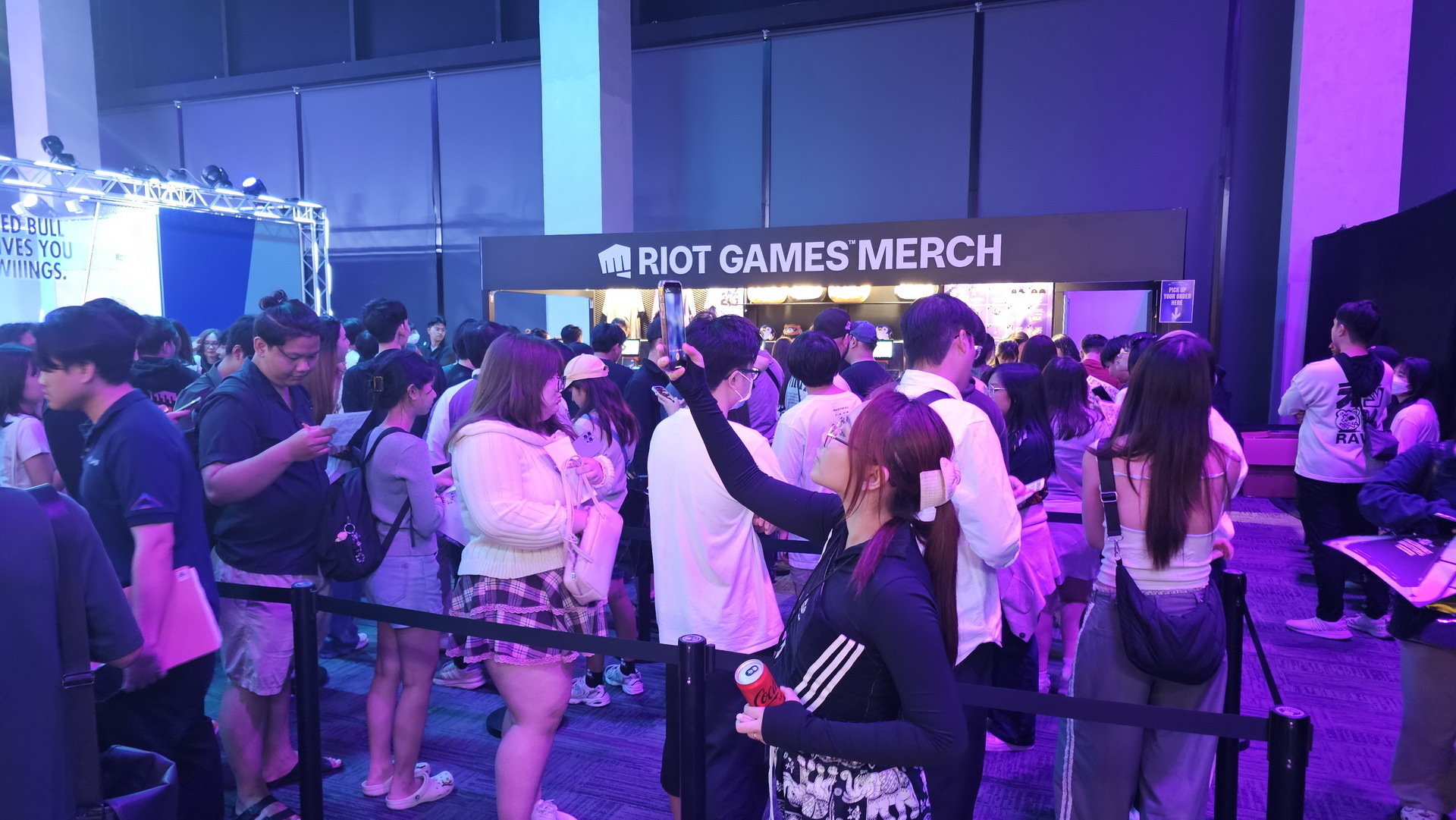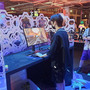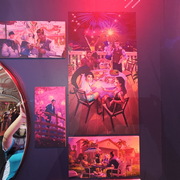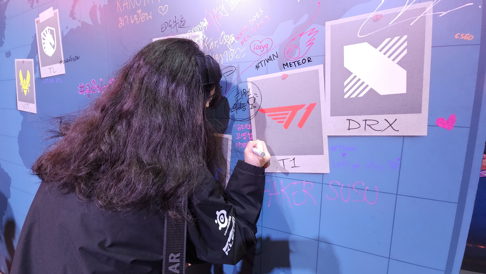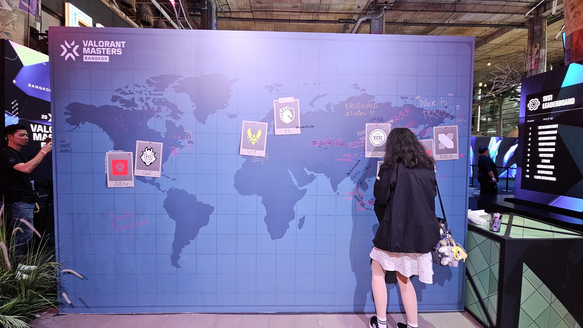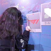 相較於 1 樓輕鬆的吃喝玩樂氛圍,5 樓則以紫色為主色展現了完全不同的風格,讓玩家可以更進一步感覺比賽的刺激。這裡還設置了一面大牆,玩家可以在上面簽名或者寫上想要對隊伍說的話。