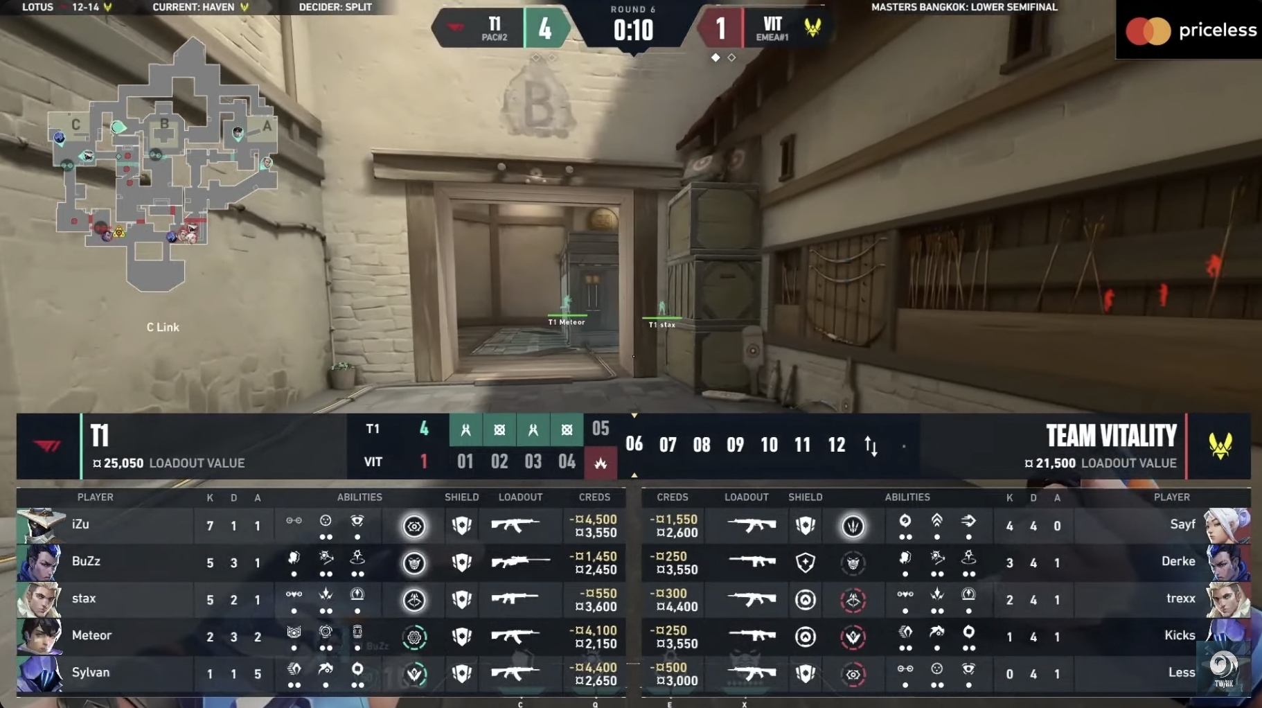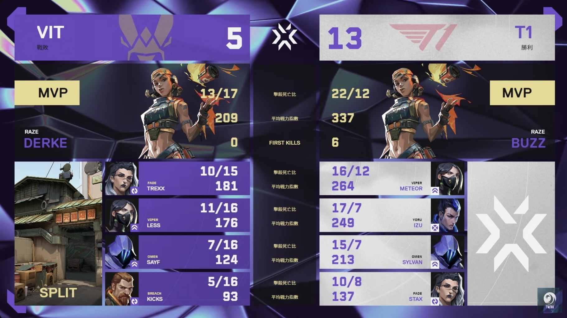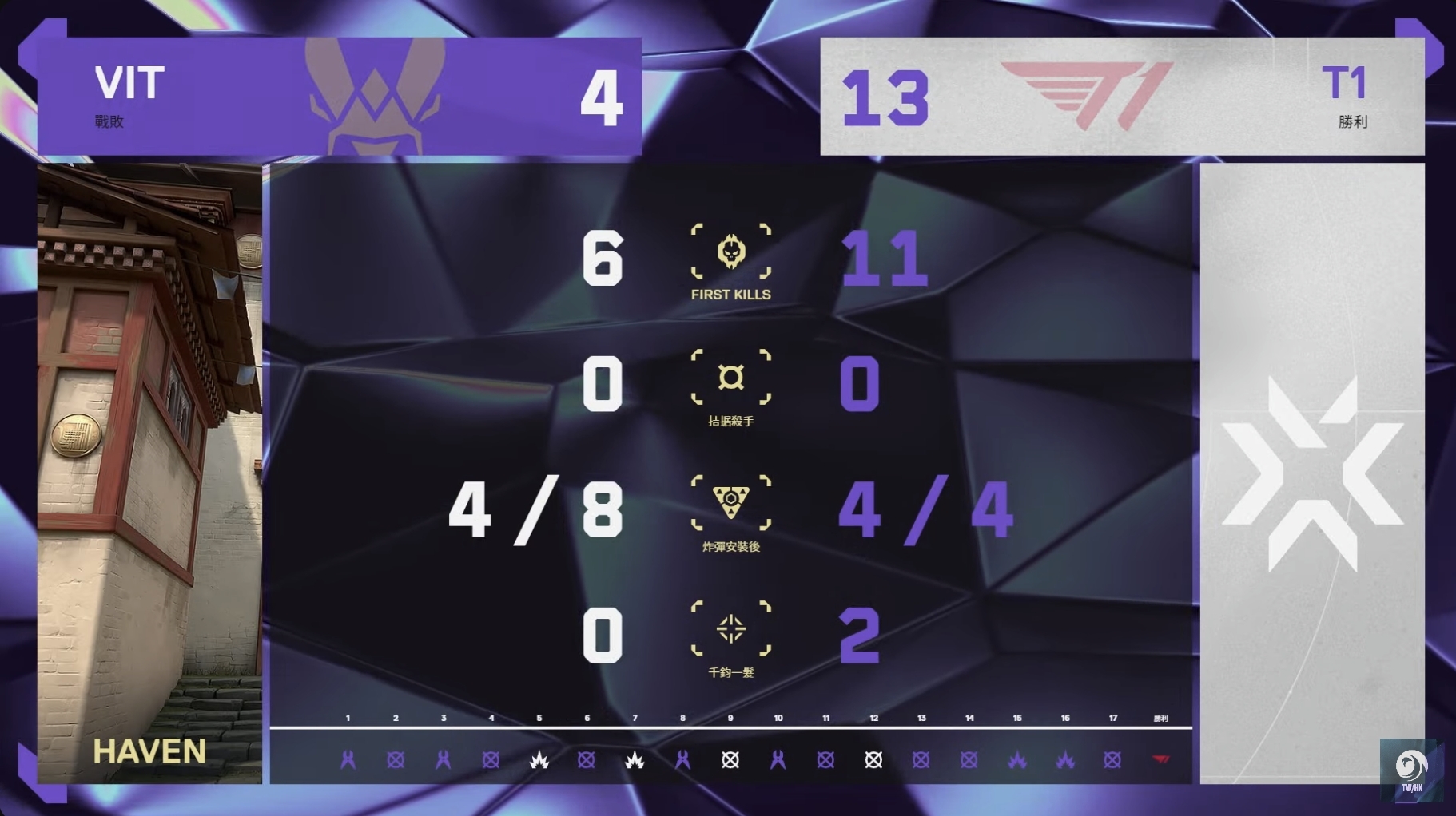 第二張地圖為「遺落境地」,T1 以 4:0 開局,VIT 暫停後終於因為人數優勢而破蛋,而下一局 T1 Meteor 一扛二守下第 5 分,再把比分差距拉開。T1 在 16 局拿下 12 分聽牌,並穩穩收下 13 分,取得這場比賽勝利。雙方戰成 1:1 平手。
