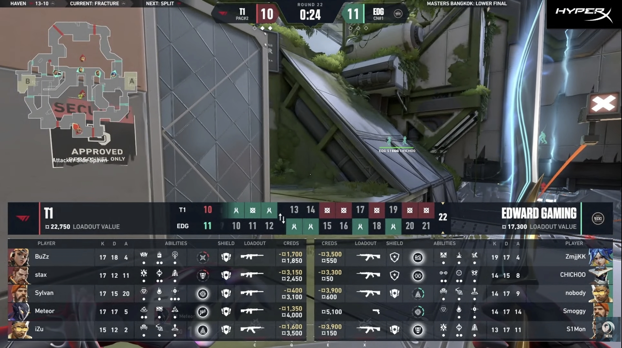 第二張地圖為「遺落境地」,EDG 找回了手感,不過 T1 也沒有因此亂了陣腳,雙方都打得十分謹慎。T1 在 21 回合反超 EDG,以 11:10 領先,壓力現在來到 EDG 身上。下一回合 T1 也順利拿下,而 23 回合殘局更驚險守下,T1 以 2:0 搶先聽牌。