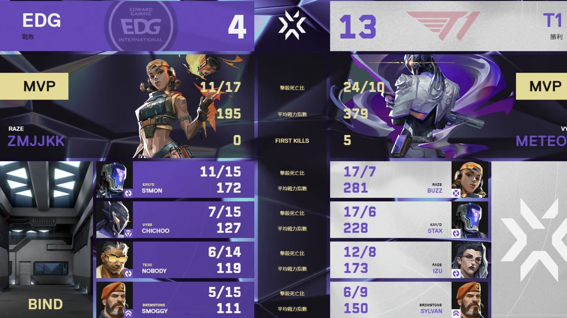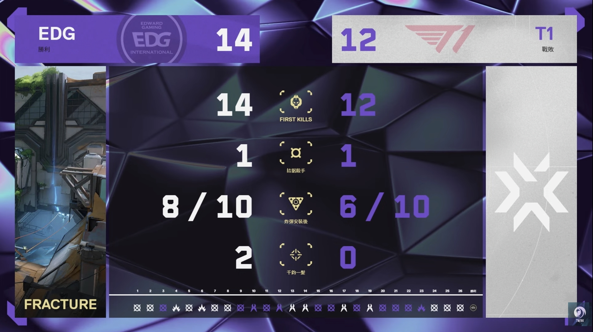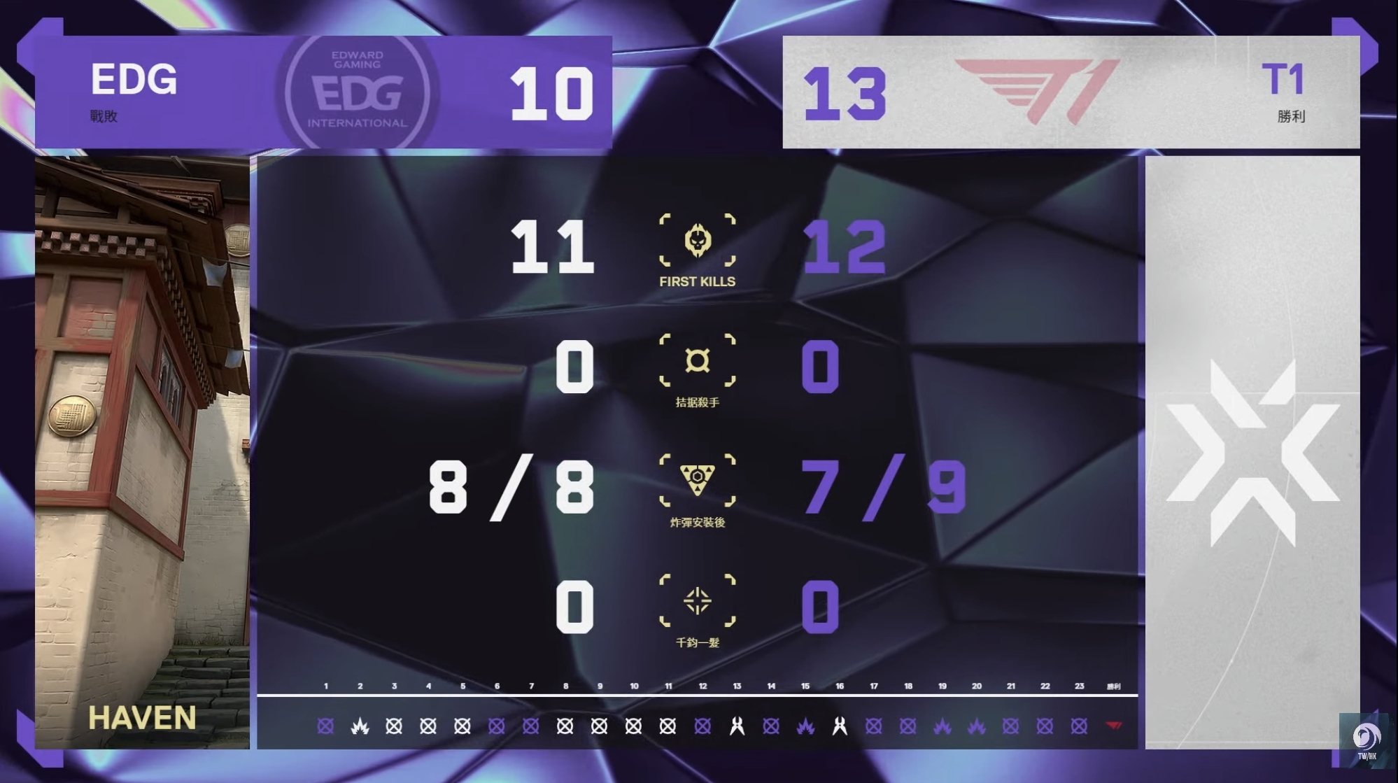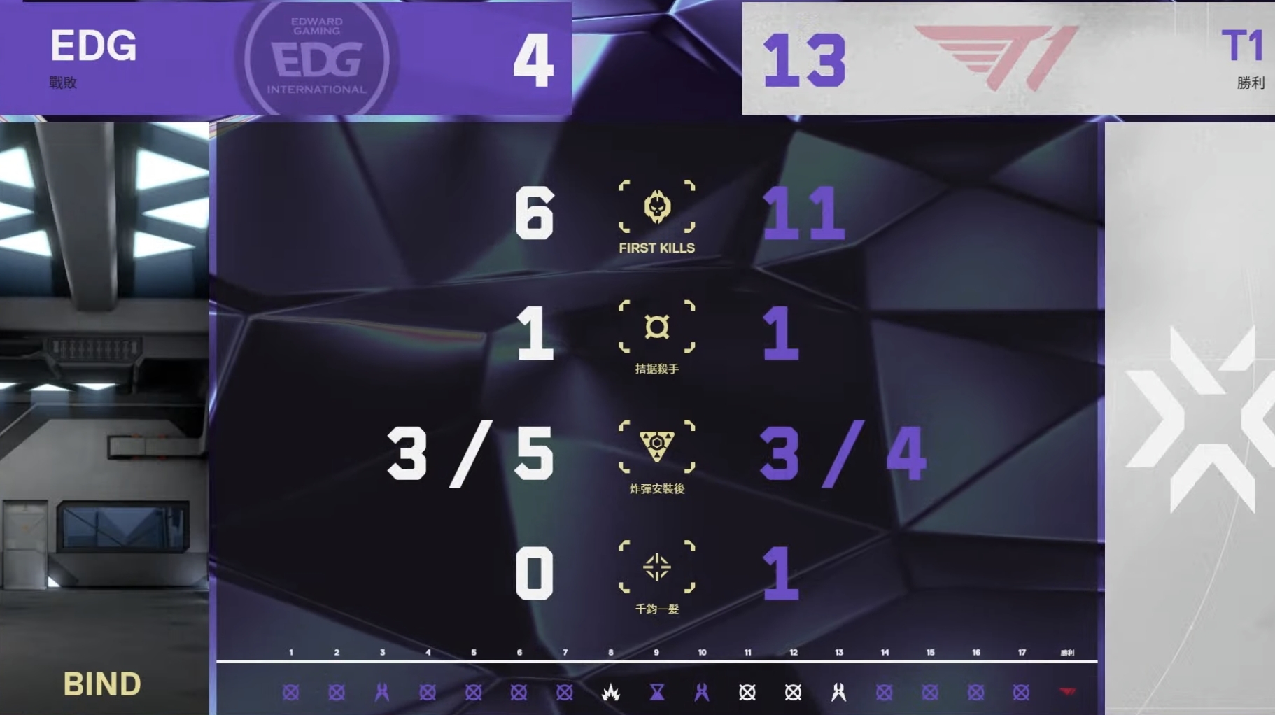 今日的比賽採五戰三勝制,第一張地圖在「劫境之地」,T1 開局就 ACE 拿下第一回合,之後更接連拿下兩分,以 3:0 領先。EDG 急喊暫停,但效果不彰,直到第八回合才終於破蛋。T1 持續以穩健攻勢得分,最終順利以 13:4 拿下首場比賽勝利。
