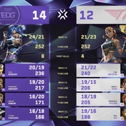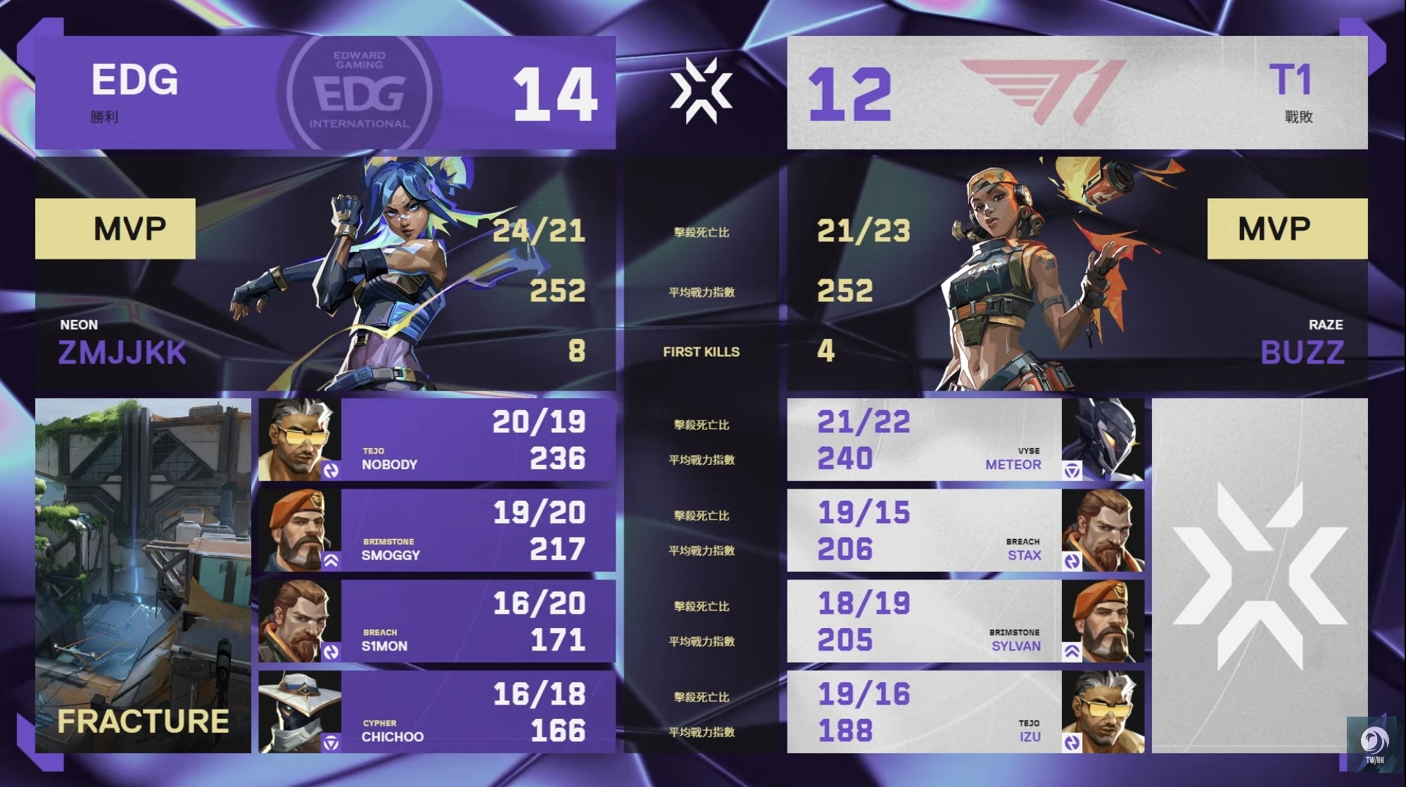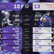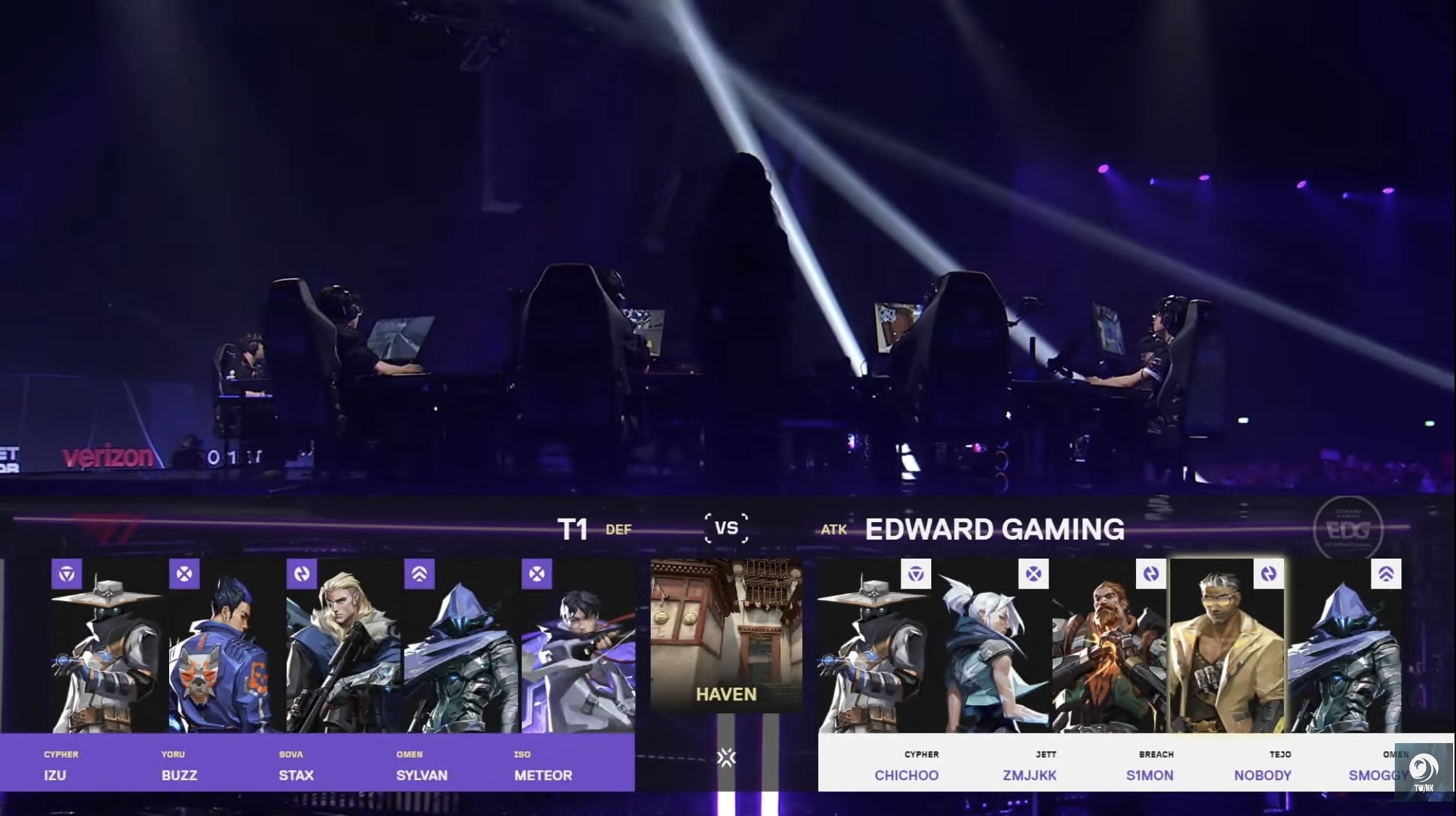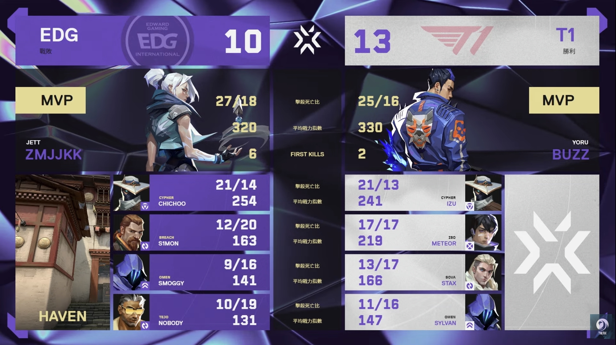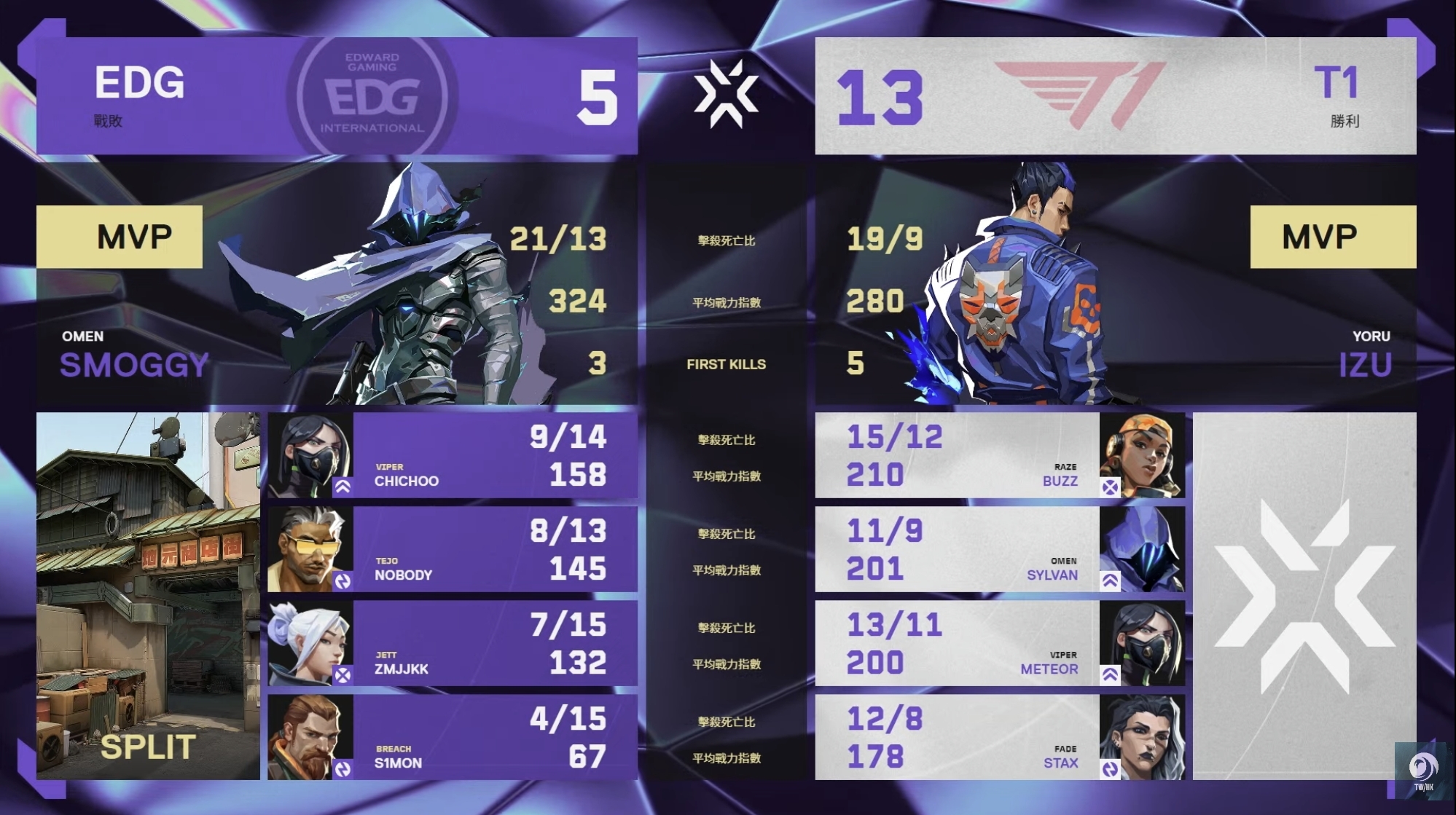 今日的比賽採五戰三勝制,第一張地圖在「劫境之地」,T1 開局就 ACE 拿下第一回合,之後更接連拿下兩分,以 3:0 領先。EDG 急喊暫停,但效果不彰,直到第八回合才終於破蛋。T1 持續以穩健攻勢得分,最終順利以 13:4 拿下首場比賽勝利。