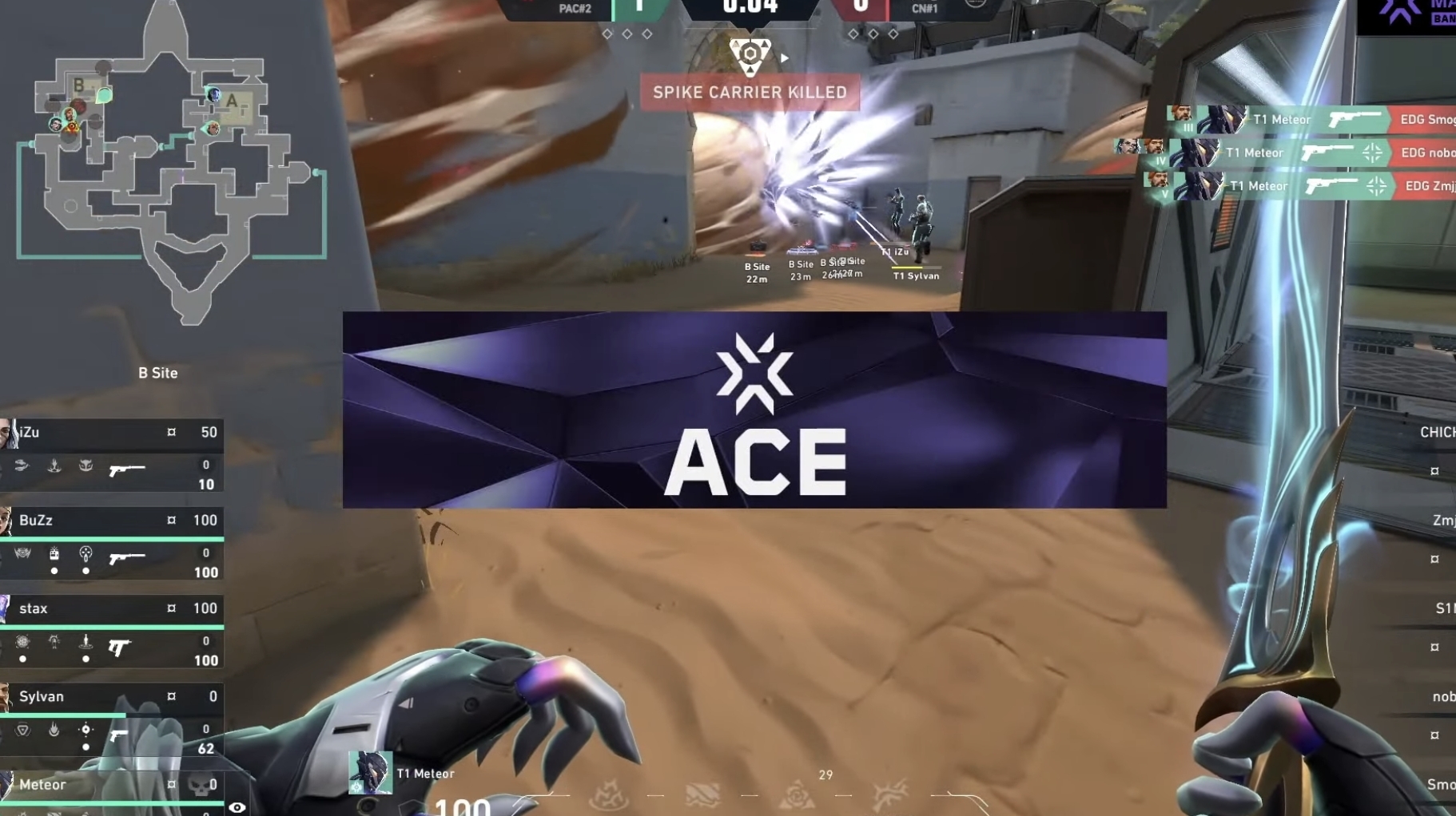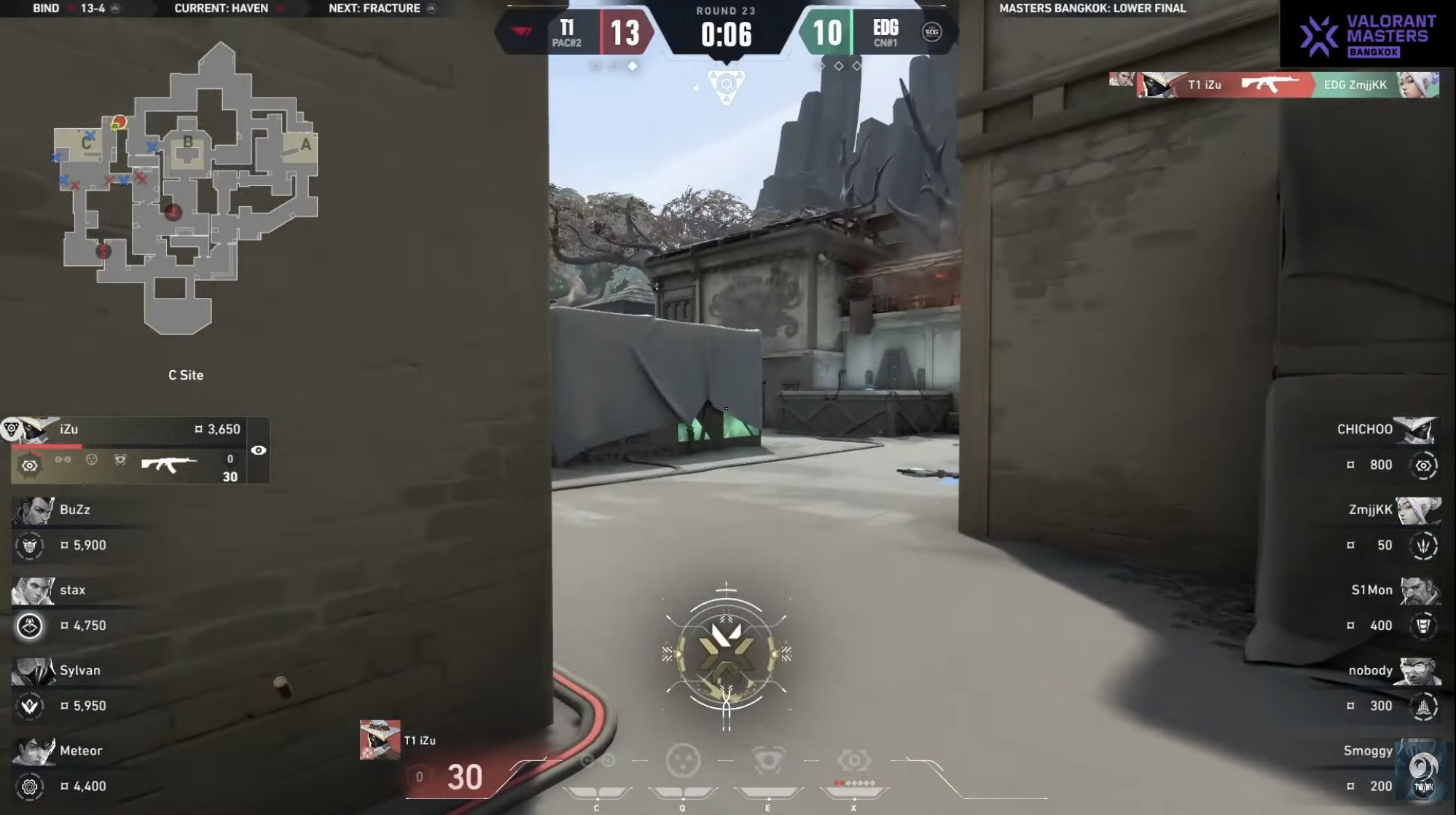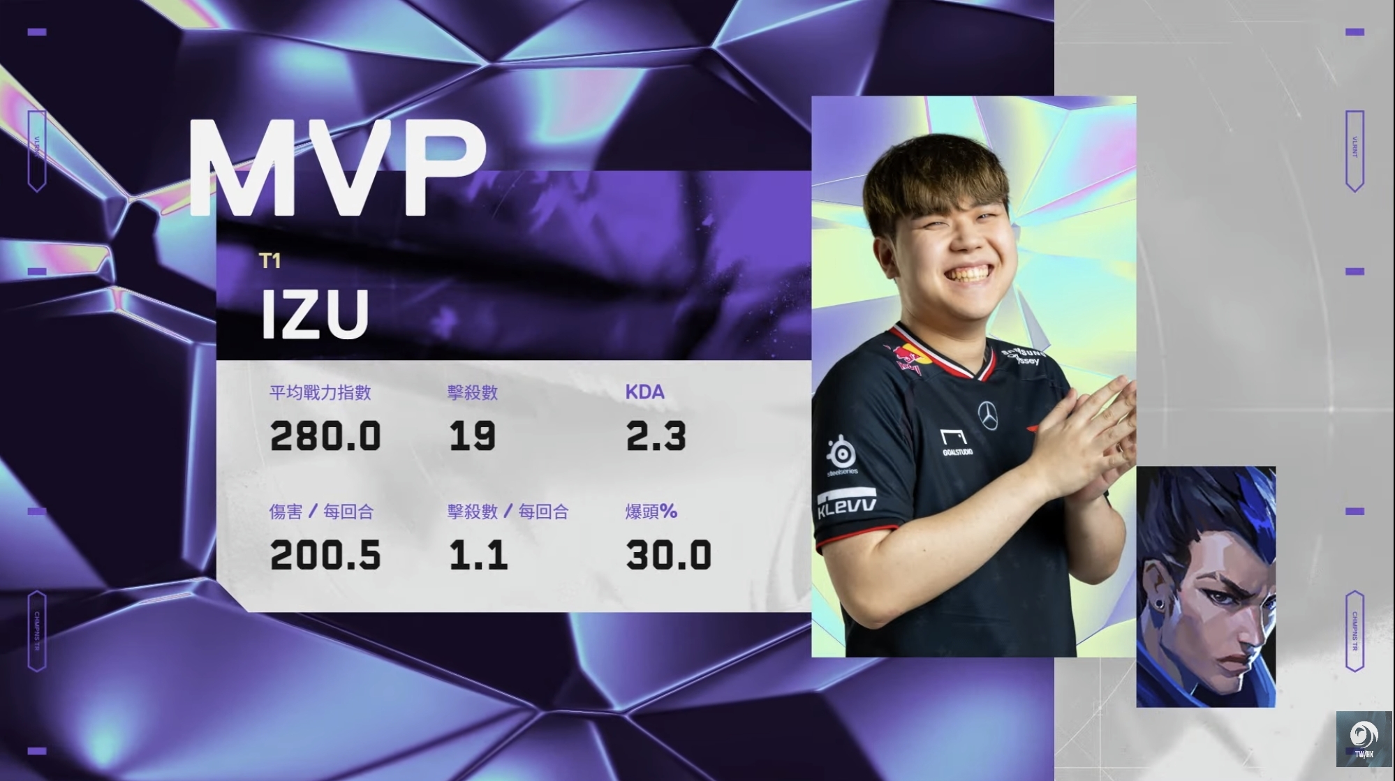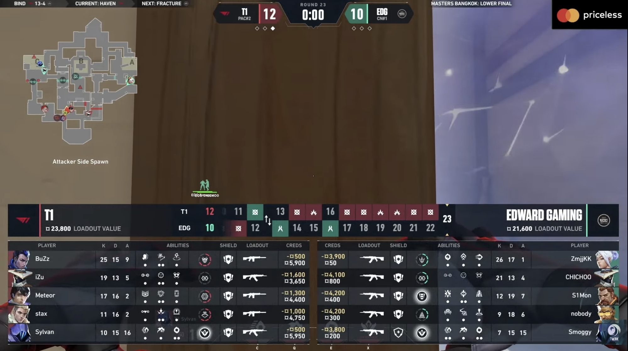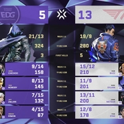今日的比賽採五戰三勝制,第一張地圖在「劫境之地」,T1 開局就 ACE 拿下第一回合,之後更接連拿下兩分,以 3:0 領先。EDG 急喊暫停,但效果不彰,直到第八回合才終於破蛋。T1 持續以穩健攻勢得分,最終順利以 13:4 拿下首場比賽勝利。