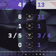 第三張的交戰發生在「天漠之峽」,EDG 前半場掌握了節奏,不過 T1 扛住了 EDG 的攻勢,開始連續追分。戰況十分激烈,處於劣勢的 T1 不斷與 EDG 拉扯,並在 21 局時將比數拉到一分之差的落後。下一回合,T1 再次化解 EDG 的攻勢,將比數追平至 11:11,更在下一回合反超比數,以 12:11 拿下賽末點。EDG 也不是省油的燈,在 25 回合時反超以 13:12 聽牌。EDG 扛住壓力,在生死關頭抓到 T1 的想法,以 14:12 取得第三場勝利。目前雙方戰積以 2:1,由 T1 領先。