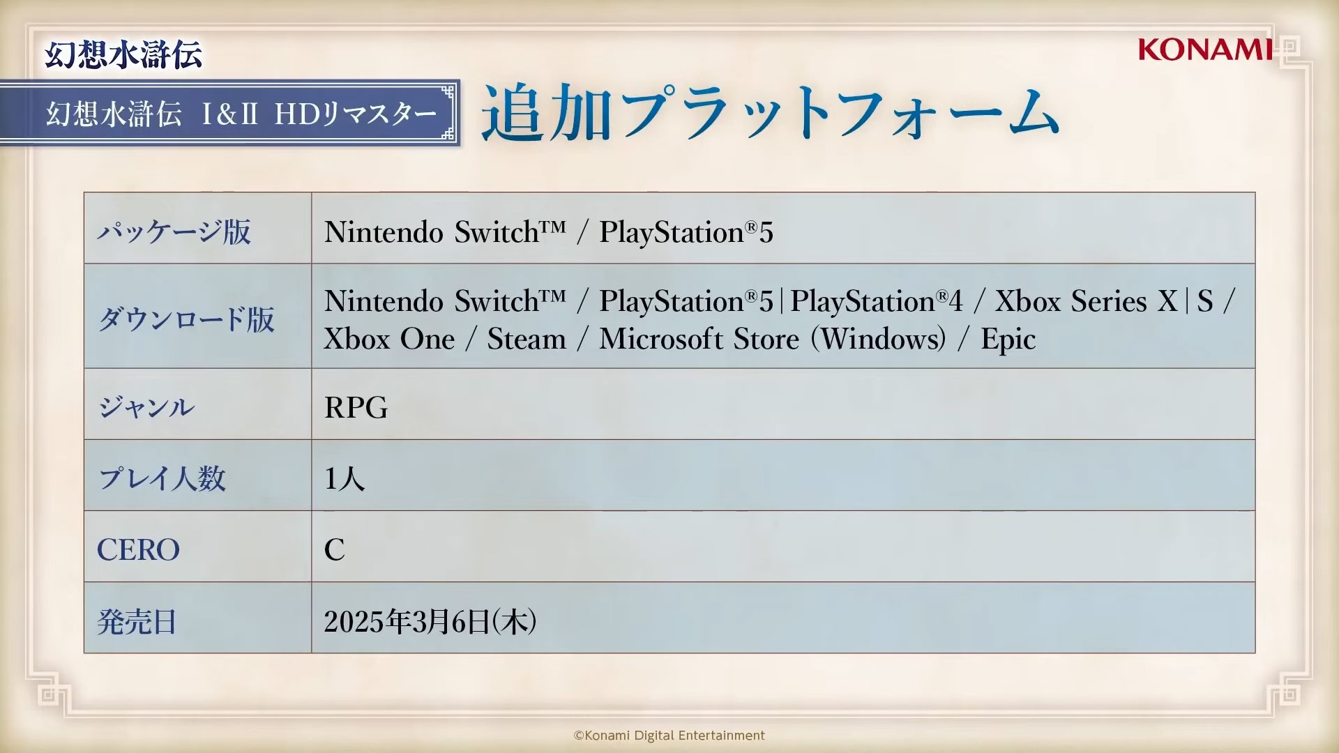 幻想水滸傳 I&II HD Remaster》(Switch / PS5 / PS4 / Xbox Series X|S / Xbox One / PC),在今日(3/4)上午舉辦的直播節目「幻想水滸傳 Live」中,公開了上市宣傳影片,同時揭露追加發行平台與追加新功能的資訊。