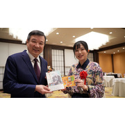 漫畫家左萱(中)手持獎狀及獎座,與外務省副大臣藤井比早之(左)、審查委員長里中滿智子(右)合影