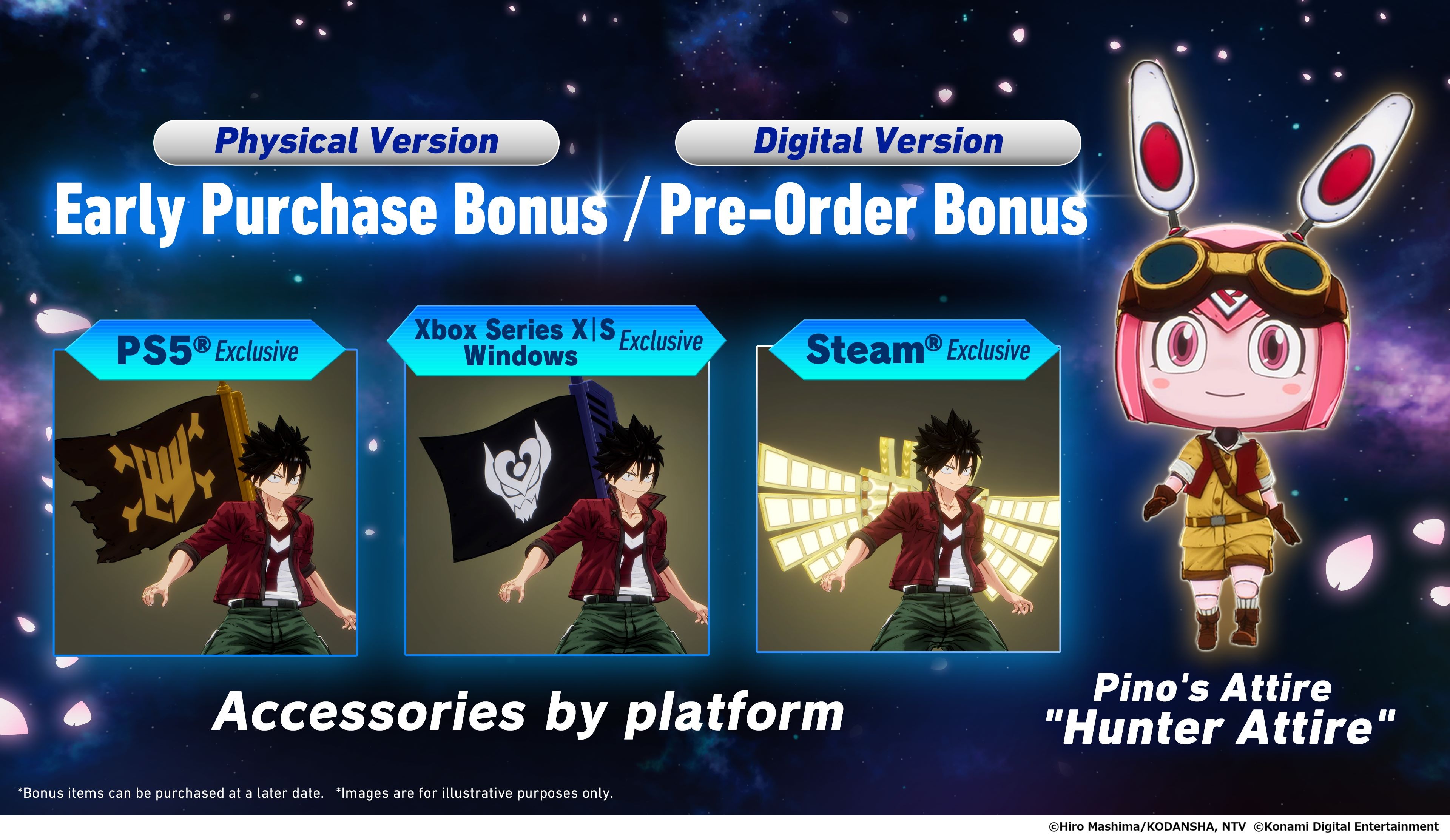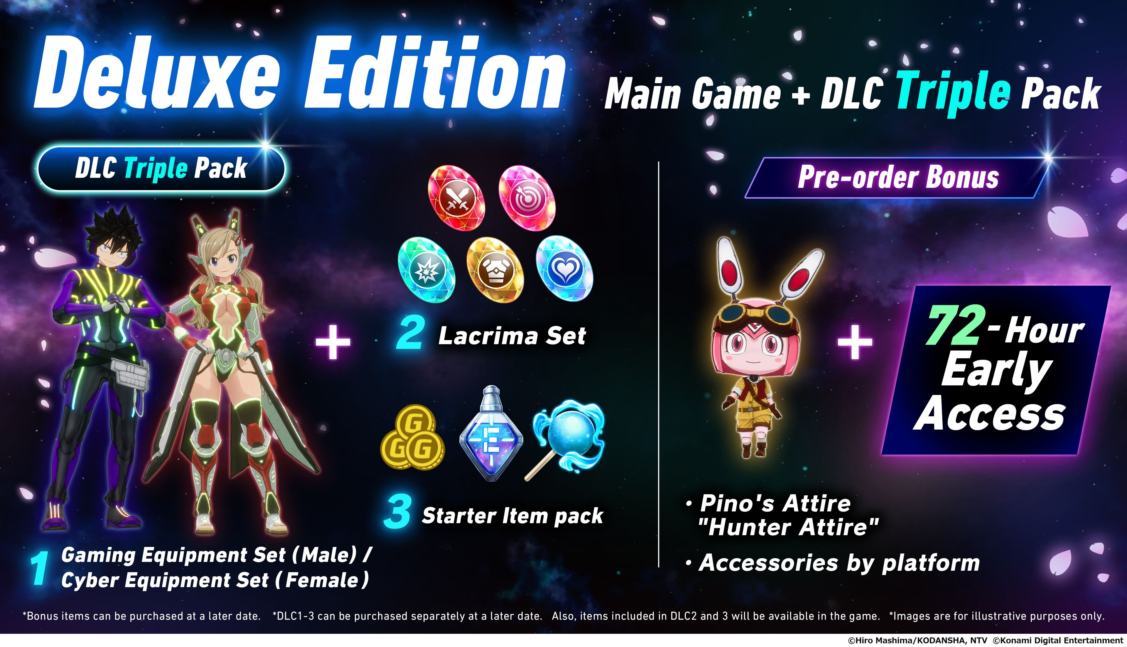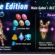 早鳥 / 預購特典包括琵諾的服裝「獵人裝」和依據對應平台不同的配件。預購豪華版 ※ 將可獲得 72 小時提前搶鮮遊戲權、星水晶套裝、新手道具包,男性裝備「電競系列」或女性裝備「電馭系列」等特典。