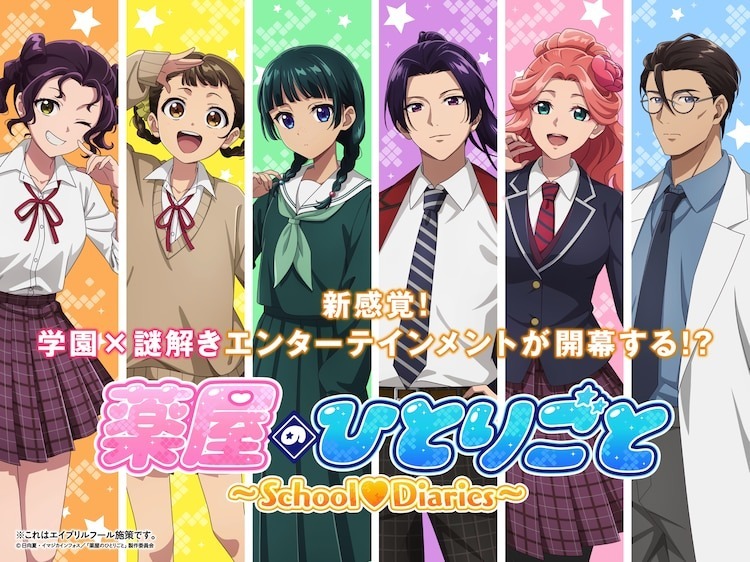 ~School♡Diaries~》的故事背景在一所私立學園,講述立志成為藥劑師的轉學生貓貓,在學園內解決各種棘手事件的冒險故事。除了貓貓之外,壬氏化身為君臨於學園頂點的的學生會長,玉葉擔任學生會會計,高順則是暗中支撐學園的物理老師,小蘭是一名天真爛漫、喜愛八卦的學妹,而子翠則是貓貓的同班同學。在視覺圖中,貓貓等主要角色穿著水手服或西裝外套,展現學園風格。此外,在預告中還能聆聽到包括貓貓、壬氏等人配音演出的遊戲版角色語音。