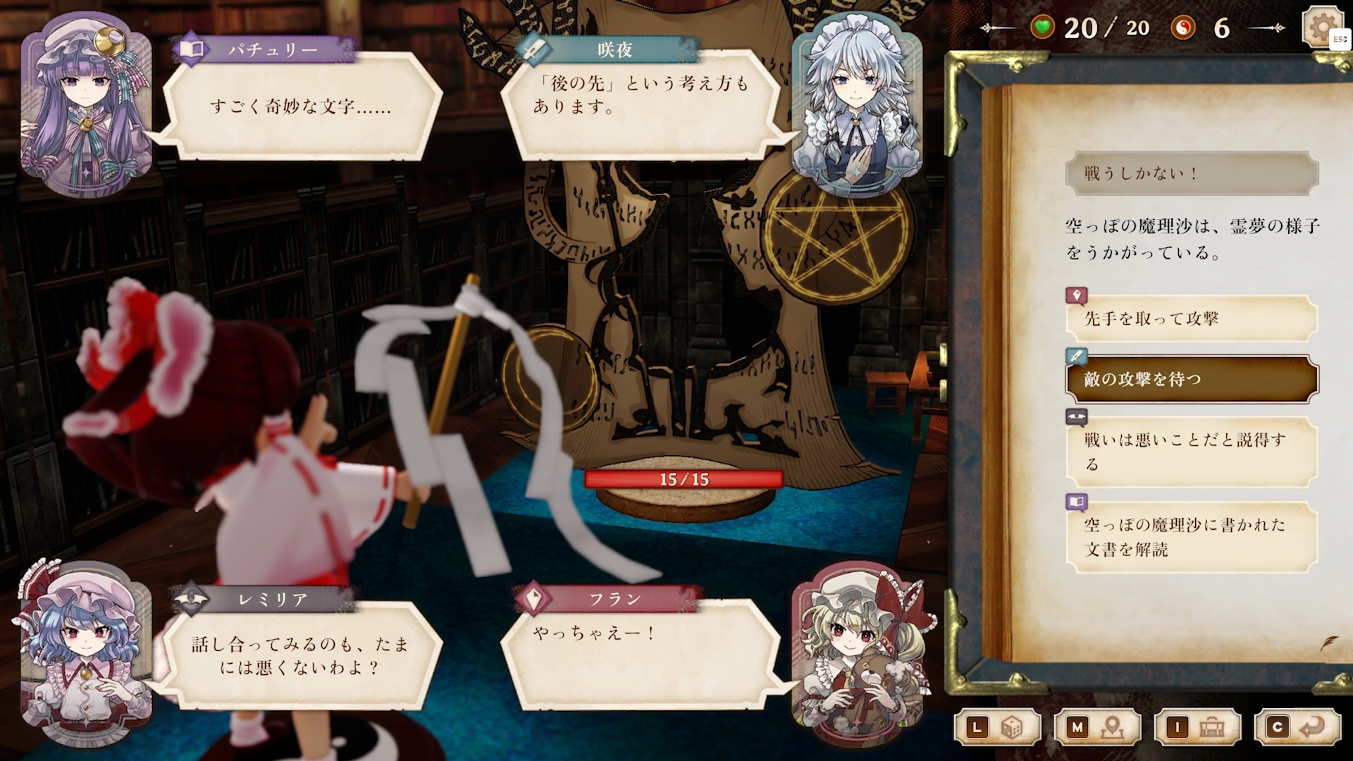 的,則是蕾米莉亞、芙蘭朵露、咲夜、帕秋莉四人。她們會隨意對書中的劇情發表意見,無論是傾聽她們的聲音,或是相信自己的判斷,玩家將可以用自己的方式引導靈夢找回魔理沙。