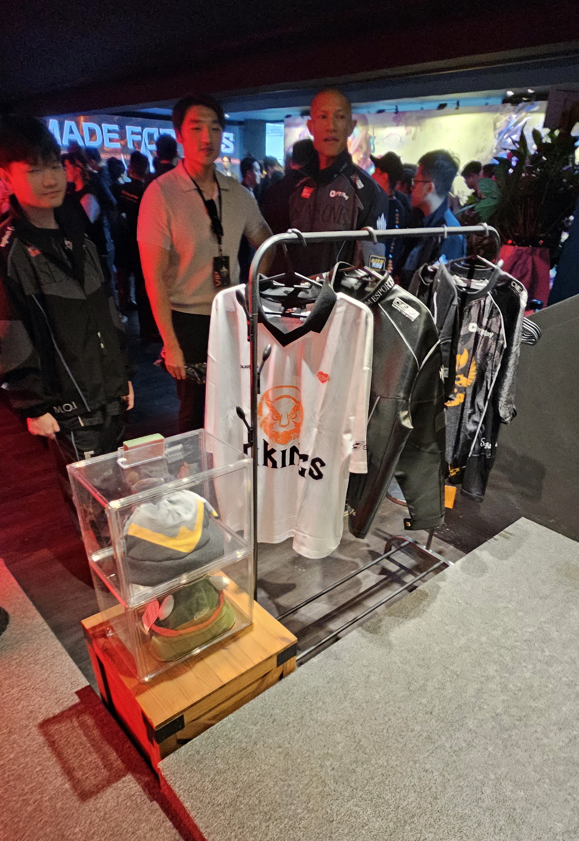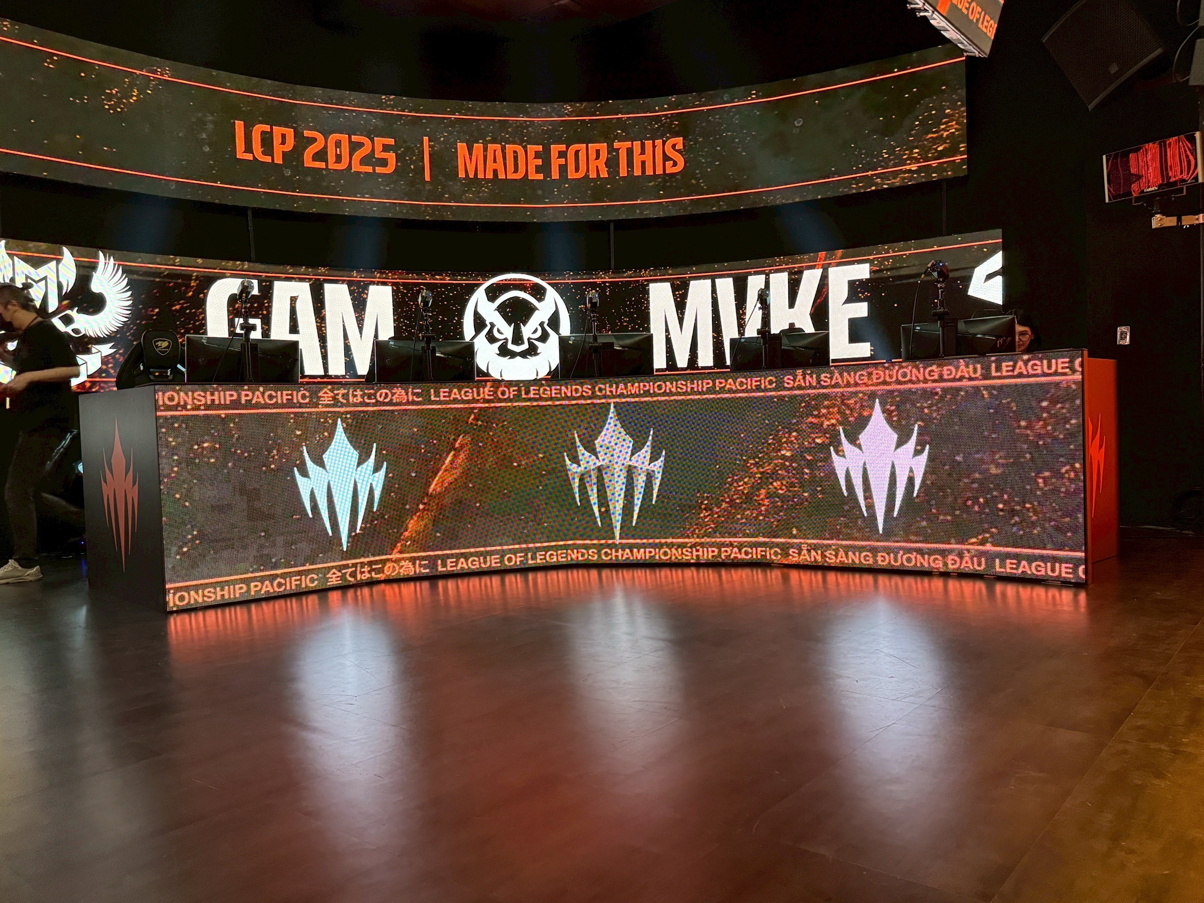 除了一般觀眾可以看到的大廳接待區、主舞台區域外,現場也開放台灣、日本、越南等地媒體一窺後勤與戰隊使用的區域,像是在四樓有著兩間戰隊準備區、這是等待上場的隊伍專用空間,每間都有電腦還有衛浴設備等;兩間隊伍討論室則是由正在比賽的隊伍與教練團使用,在此可以聽取舞台上職業選手的即時語音通訊,還有教練觀戰電腦等配備,以便讓教練團可以監控遊戲賽況。