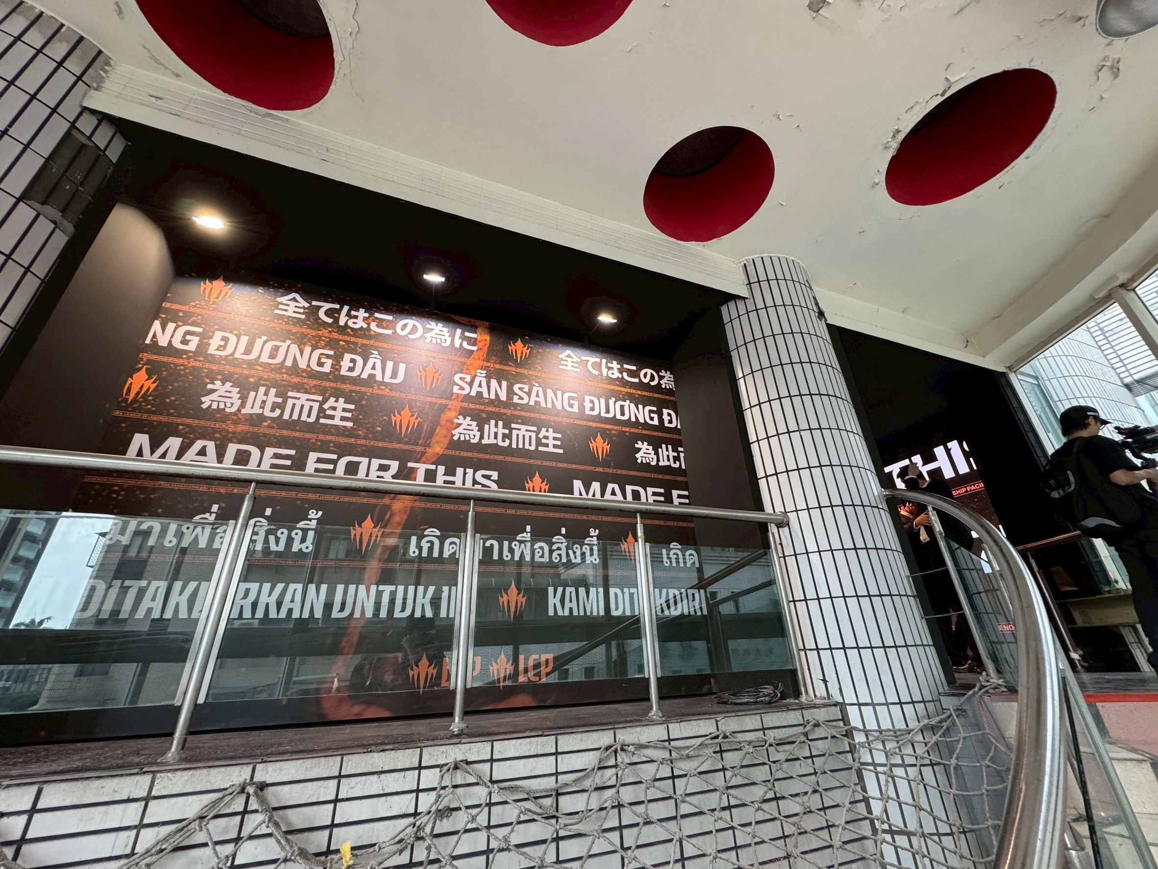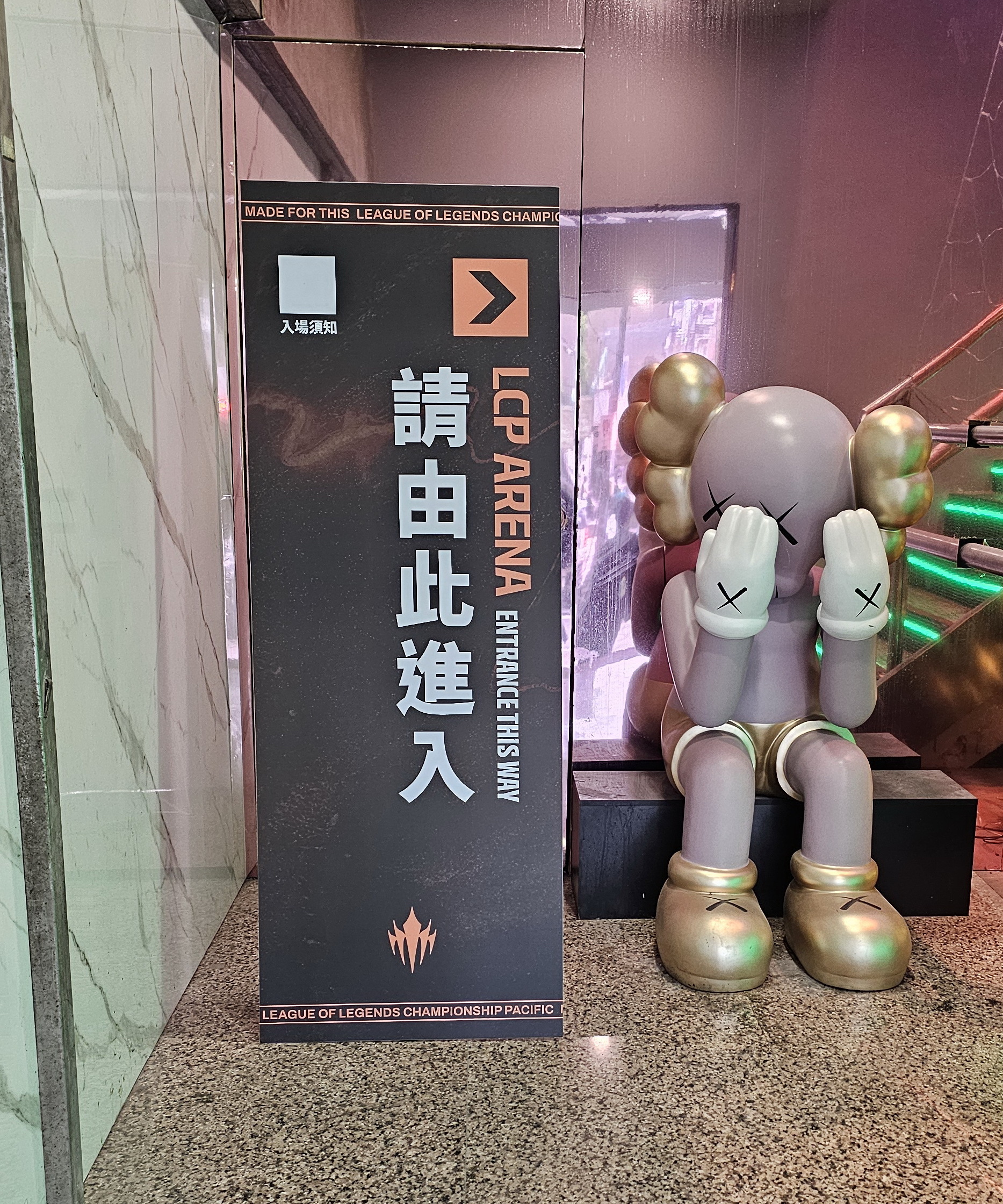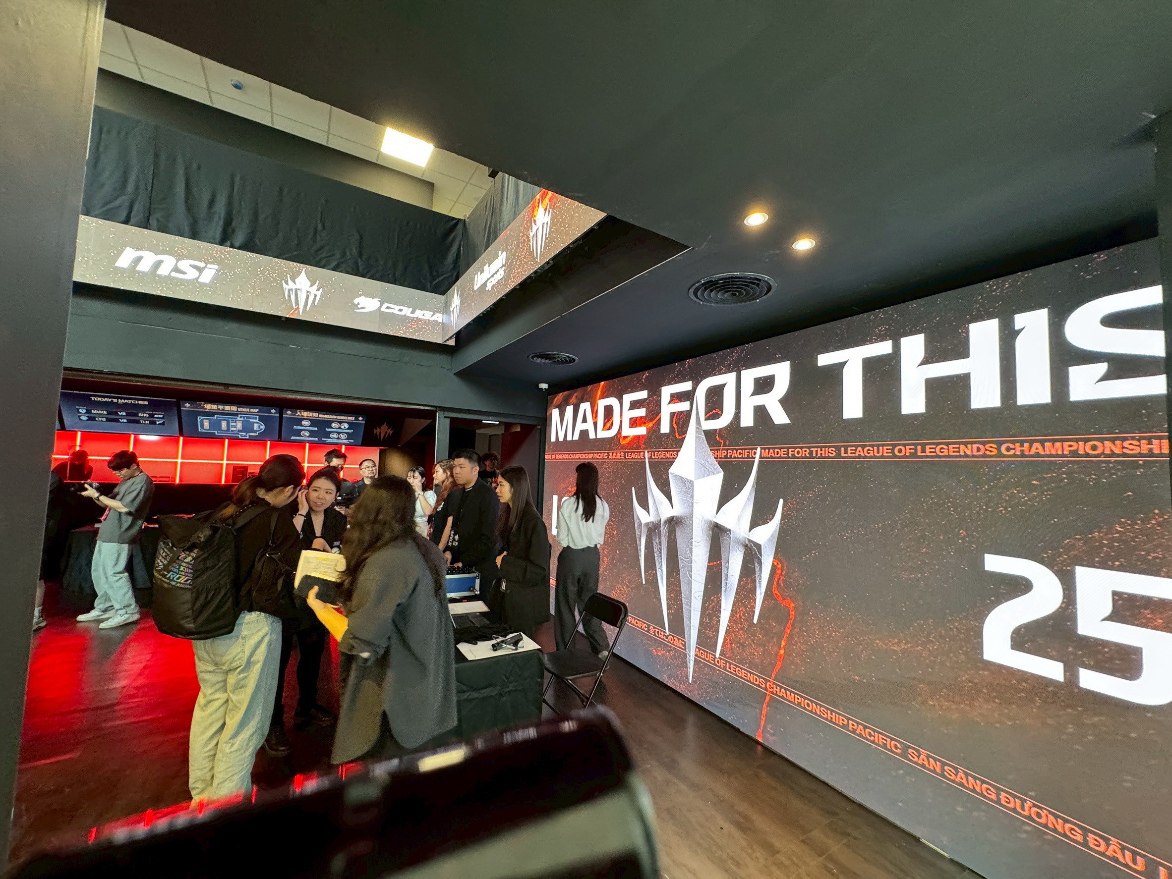 LCP 電競館位於台北市大同區民權西路 136 號 4 樓,現場距離民權西路捷運站約 290 公尺。玩家從入口就可以看到指引前往 LCP 電競館的看板,跟隨指示來到四樓後,映入眼簾的會場大廳接待區,是開放給大眾,此處有著看板可供拍照,還有官方 Riot 原廠周邊商品店與飲食販售區,前者除了《