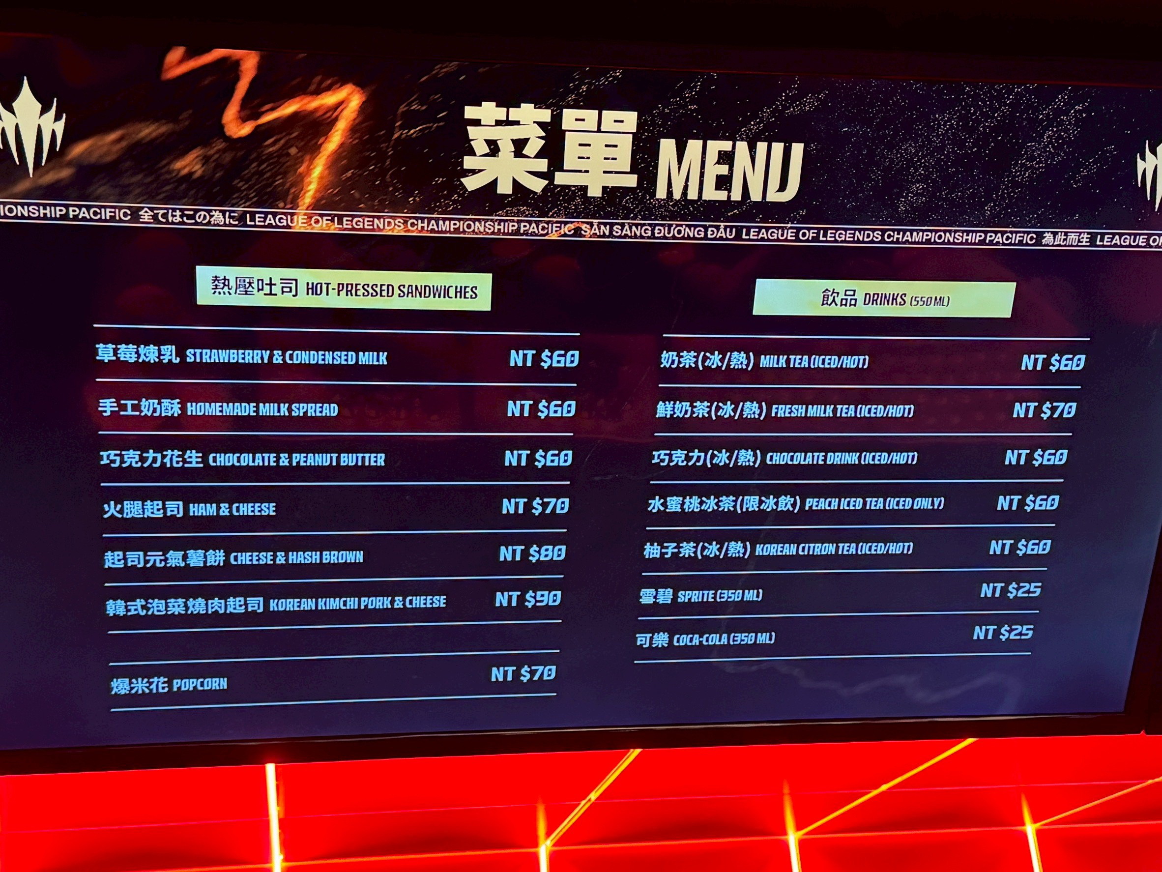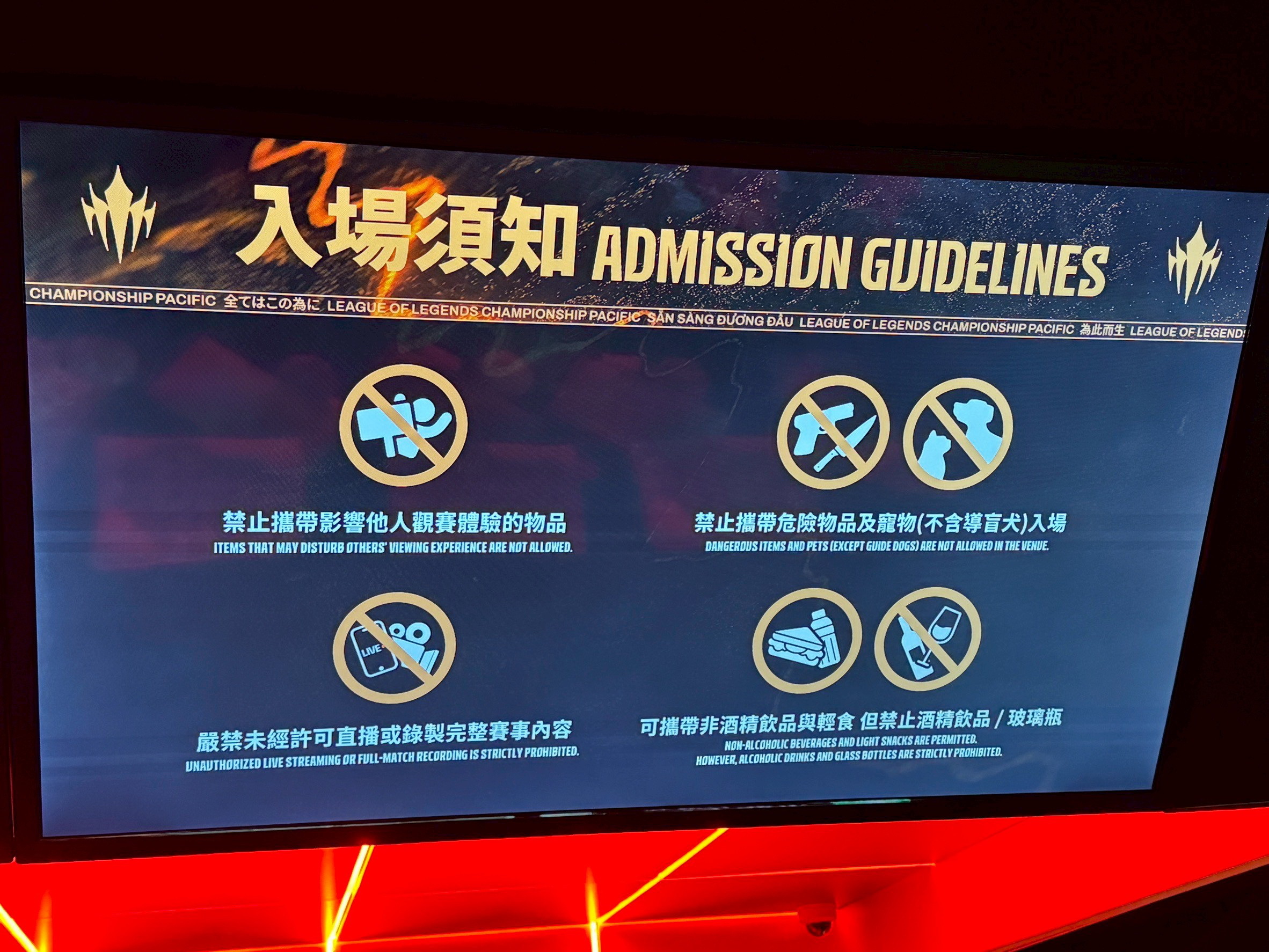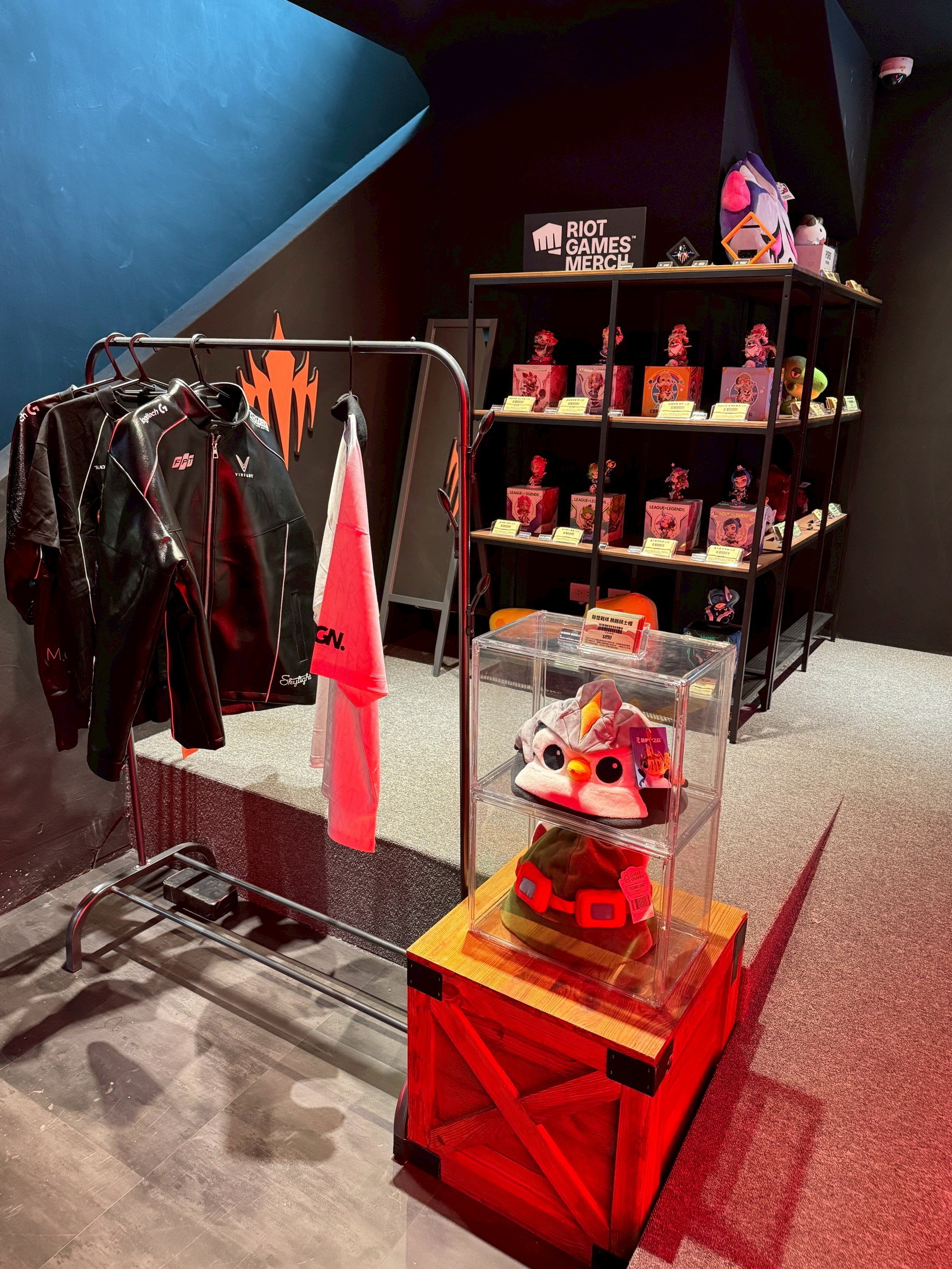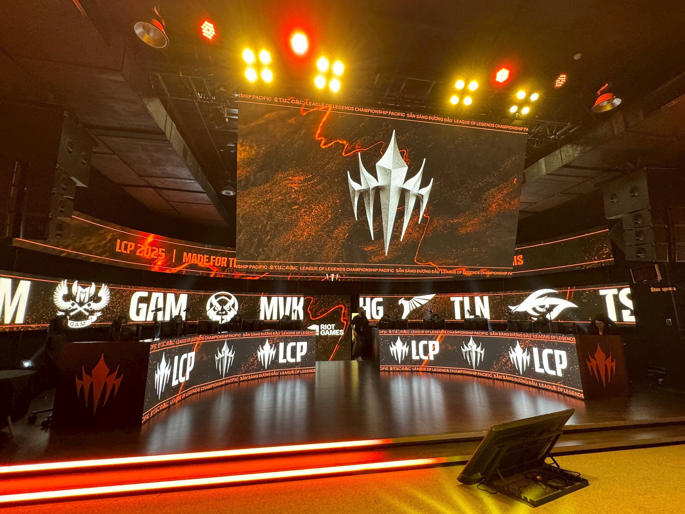 LCP 電競館位於台北市大同區民權西路 136 號 4 樓,現場距離民權西路捷運站約 290 公尺。玩家從入口就可以看到指引前往 LCP 電競館的看板,跟隨指示來到四樓後,映入眼簾的會場大廳接待區,是開放給大眾,此處有著看板可供拍照,還有官方 Riot 原廠周邊商品店與飲食販售區,前者除了《