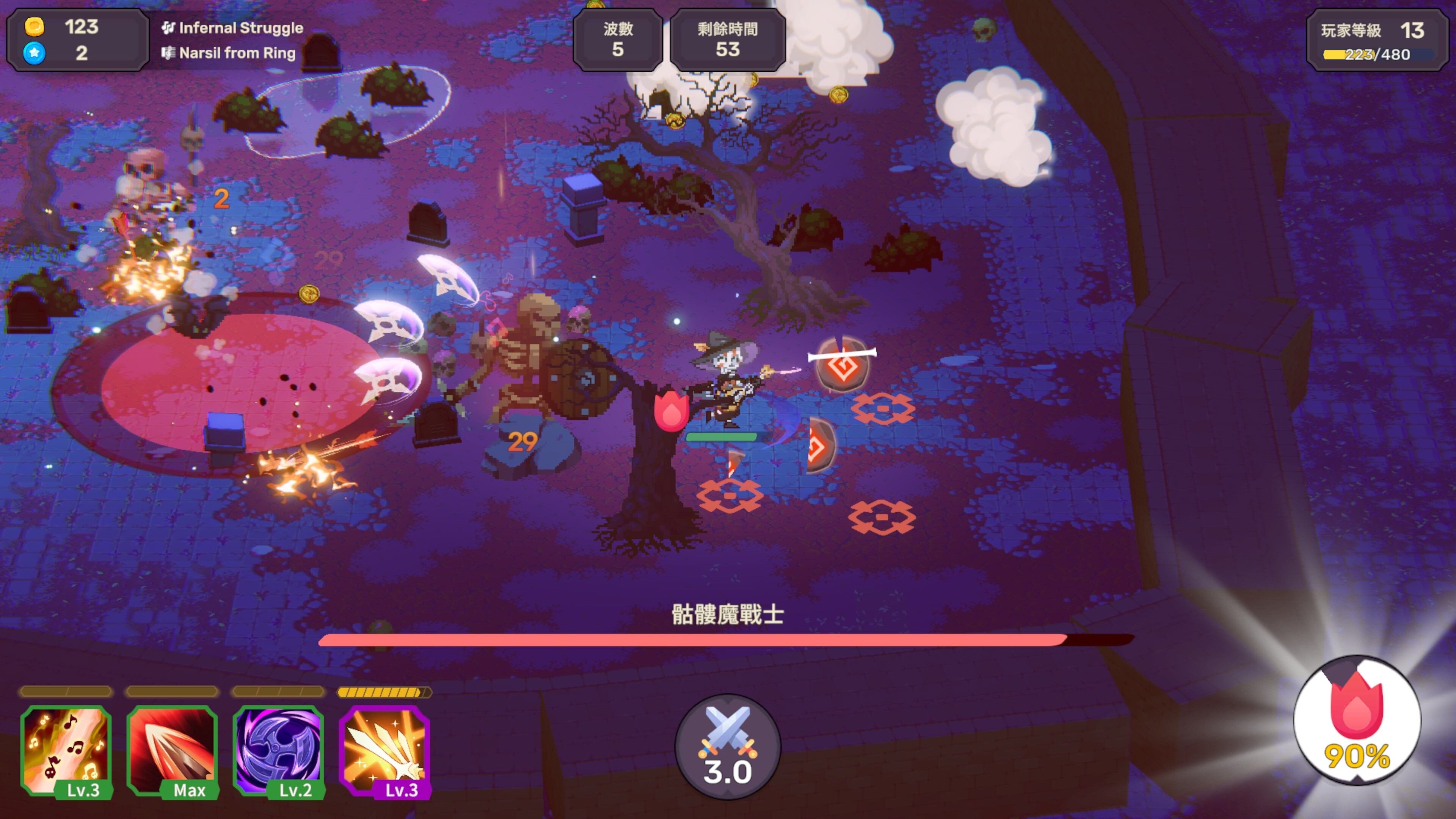《節奏魔女 舞動的骷髏》是一款結合類倖存者與音樂節奏的遊戲,玩家將扮演死靈法師「西蓓兒」以及她召喚的骷髏,隨著音樂拍點展開攻擊與閃避。面對不斷湧現的怪物,你可以透過精準節奏輸出來累積狂熱能量,進而啟動爆發模式。遊戲中起伏的節拍不僅驅動戰鬥節奏,也將帶給玩家不同的連擊體驗。