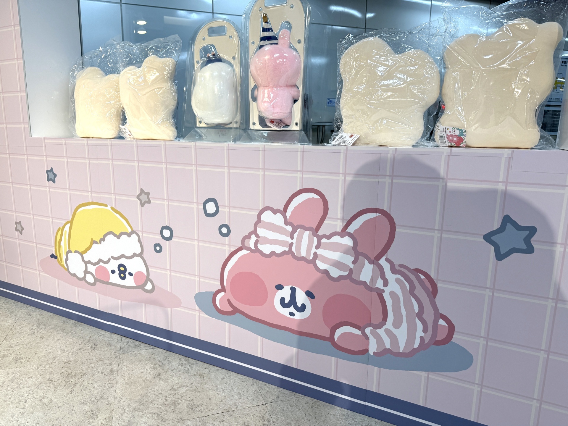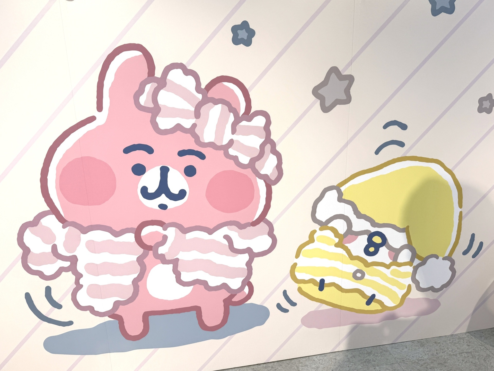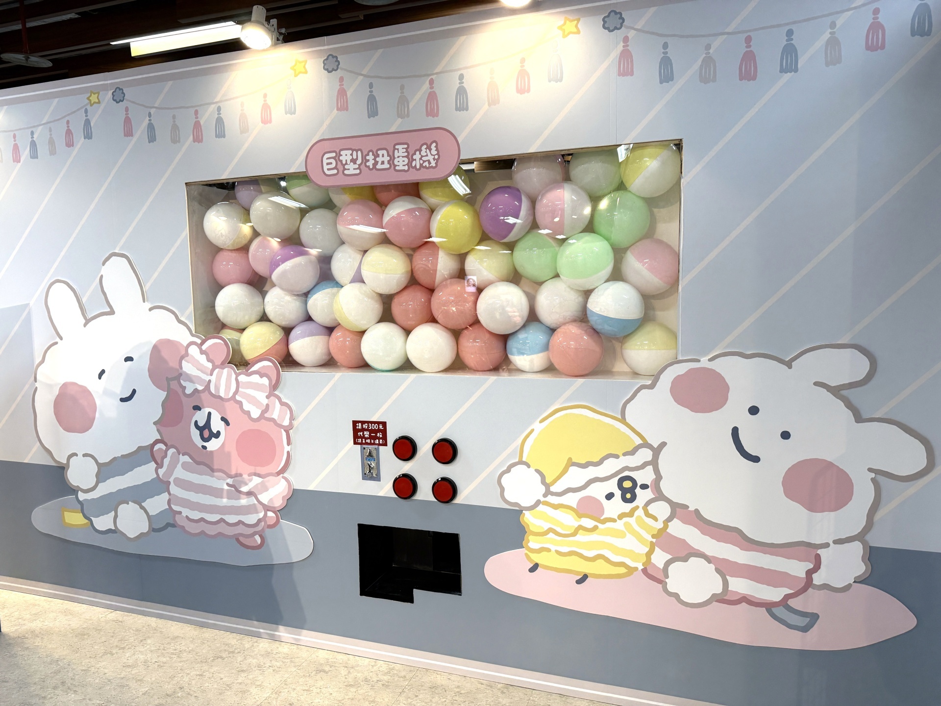 在拍照打卡點的部分,一到門口就可以看到 P 助與粉紅兔兔已經換上睡衣的「主視覺」在迎接大家,另外還有像是「睡前晚安故事」、「不想睡五連拍」、「熱熱晚安茶」、「好眠扭扭體操」、「星空派對開起來」、「窗前看月亮」、「卡娜赫拉的小動物拍照牆」等拍照牆等候粉絲到來。而在本次的快閃活動中,同樣有著可以挑戰運氣的「好夢連連巨型扭蛋區」登場