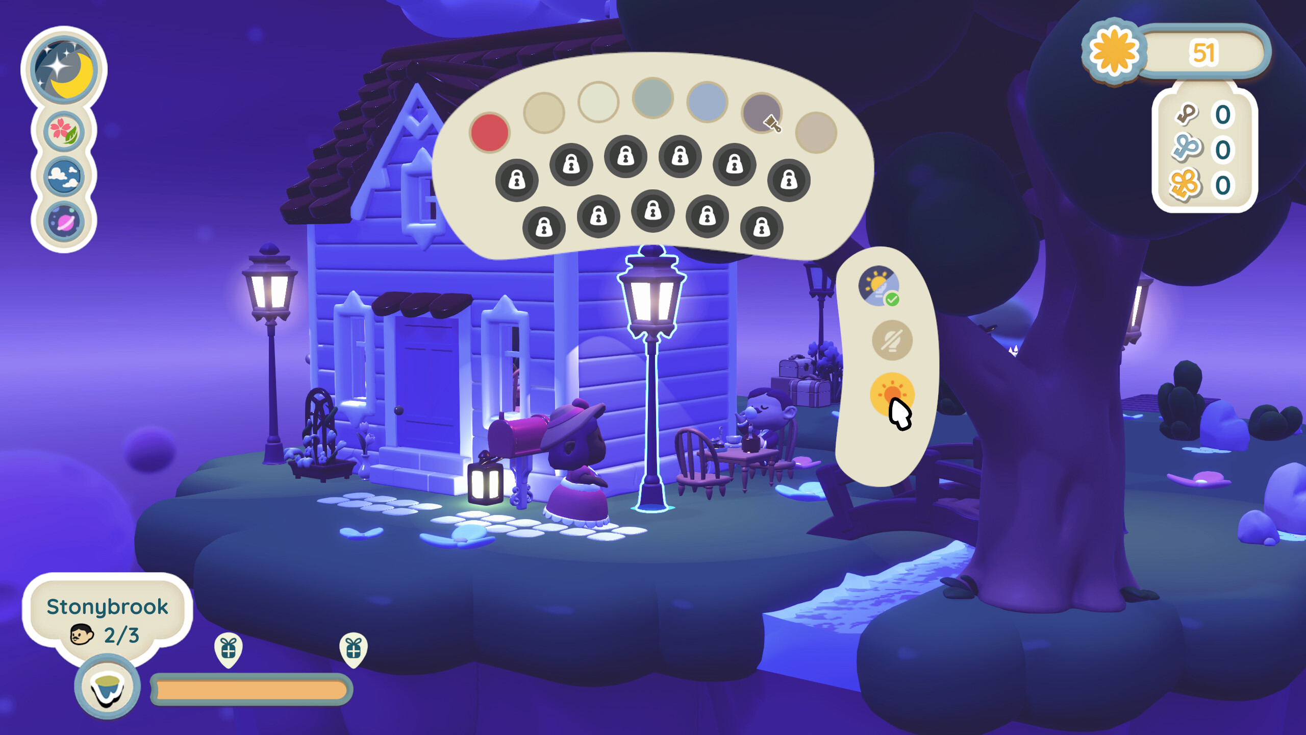 汀可鎮》的地圖上前進,玩家可以解鎖並建造新的島嶼,同時收集地圖碎片,發現途中的隱藏島嶼。透過收集「星幣」,玩家可以在莫里根的古董店中購買你喜歡的物品。利用你在遊戲中獲得的物品,裝飾各種浮空島嶼,豐富你的收藏,並使用天氣、季節和背景來編排你的微縮景觀背景音樂。玩家為前來的旅行者們裝飾小屋並幫助他們,他們便會回報你。