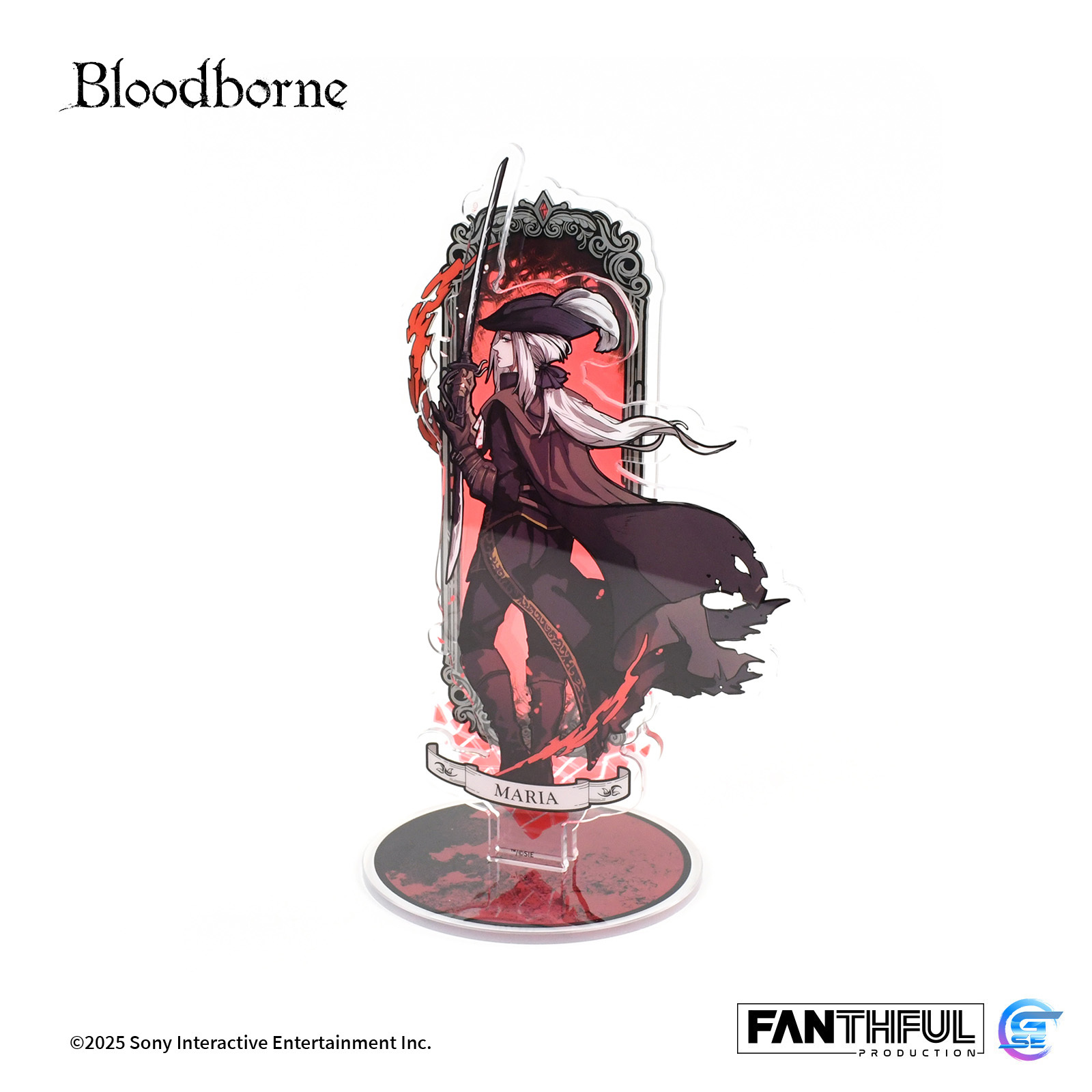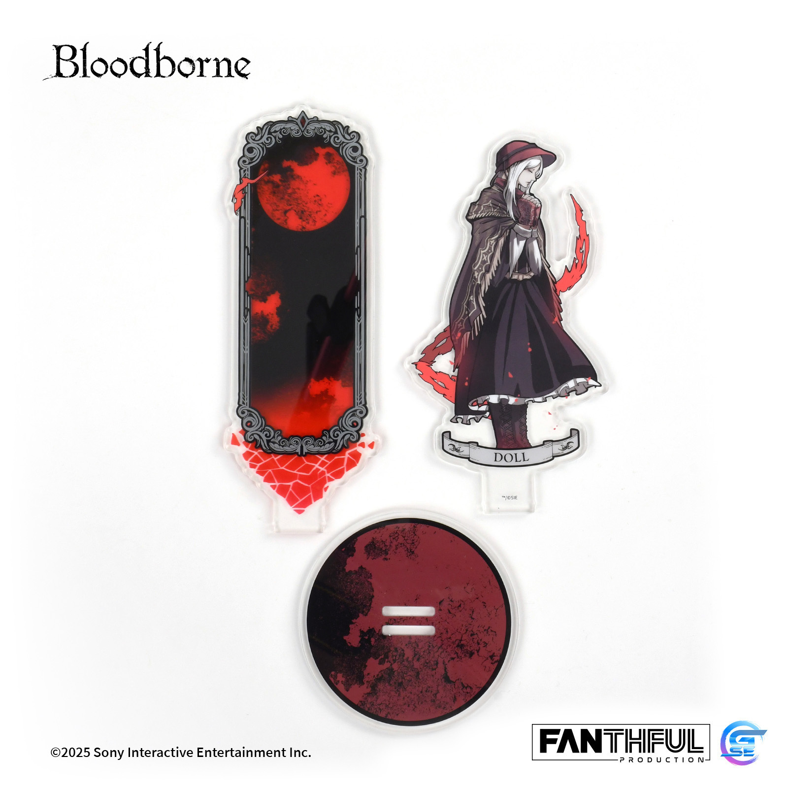 Doll 閉上雙眼雙手緊握,紅色的滿月背景板,彷彿立於獵人夢境祈禱,猶如絕望中的希望之光,感染力十足。而 Maria 則是手持變形後的洛陽,側目而立,背景板象徵血紅的星辰鐘塔,長髮與披風隨風而舞。