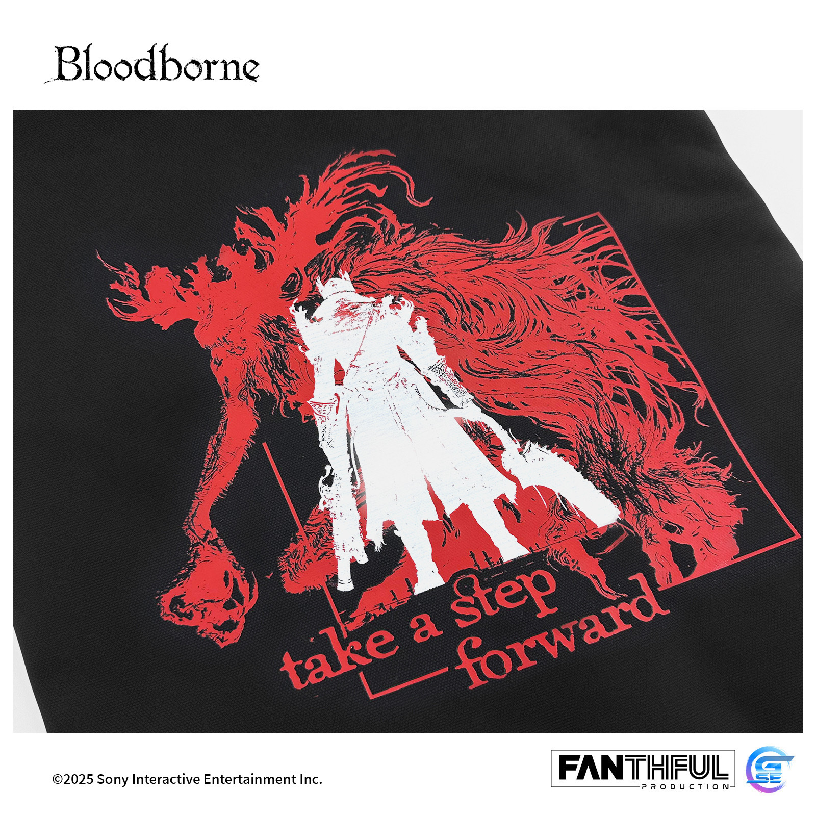 獵人的背影與神職人員怪獸的剪影,紅與白、血與獸的碰撞,前後站位相互映襯,彷彿回到了亞楠的那座橋頭。下方則是「take a step forward」的字樣,邁過它才開始真正的狩獵之夜!