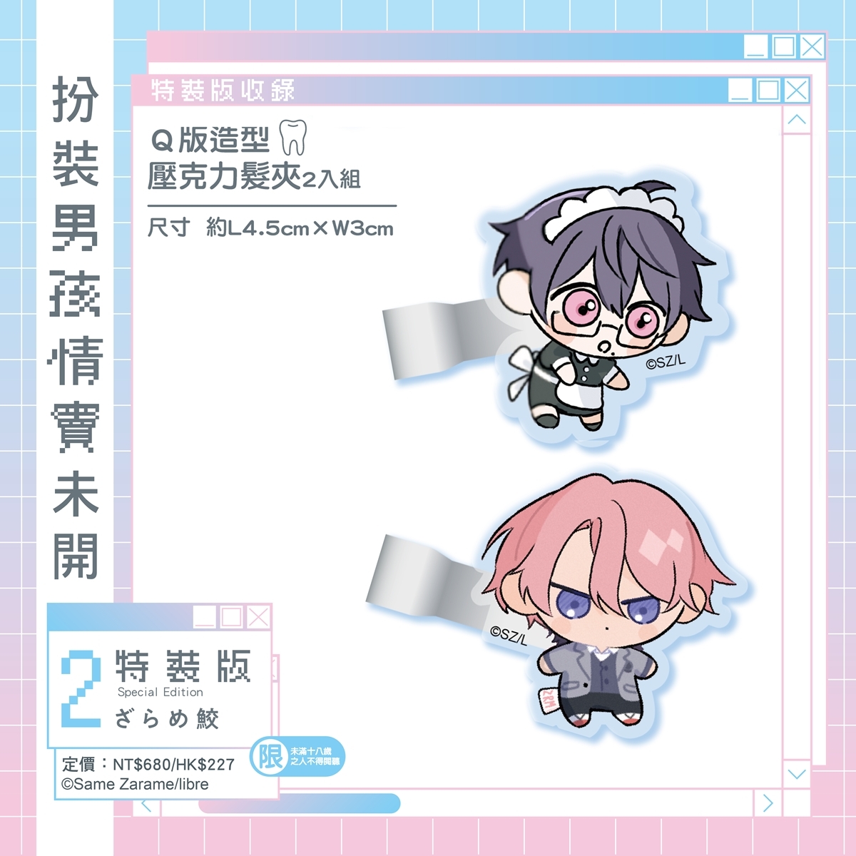 扮裝男孩情竇未開(2)》隨書附贈首刷特典「精美典藏書卡」;特裝版包含多款限定特典:「Q 版造型壓克力髮夾 2 入組」、「摺疊手機風壓克力鑰匙圈」、「特裝版限定贈品約會圖卡」等周邊,全數收錄於專屬戀愛氛圍滿點設計的「特裝版珍藏書盒」中。即日起可於台灣角川官網與全台指定實體書店進行限期預購,預購時間至 6/26(四)截止,2025 年 8 月正式上市。凡於台灣角川官網完成預購者,再加碼贈送 100 元官網滿額優惠券。