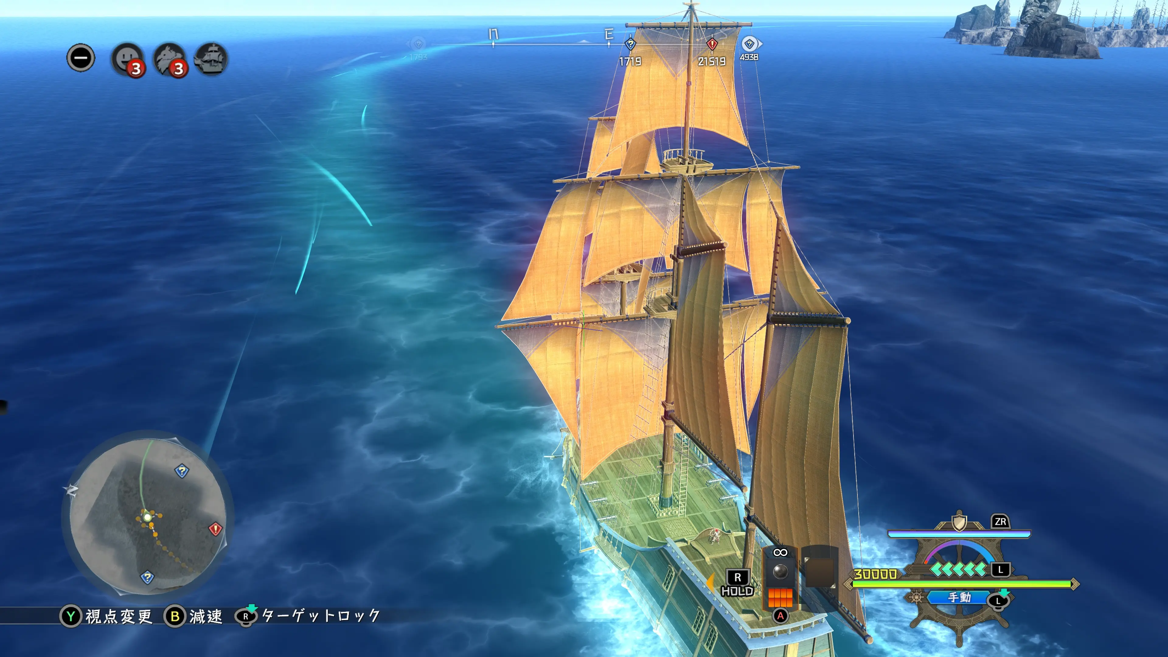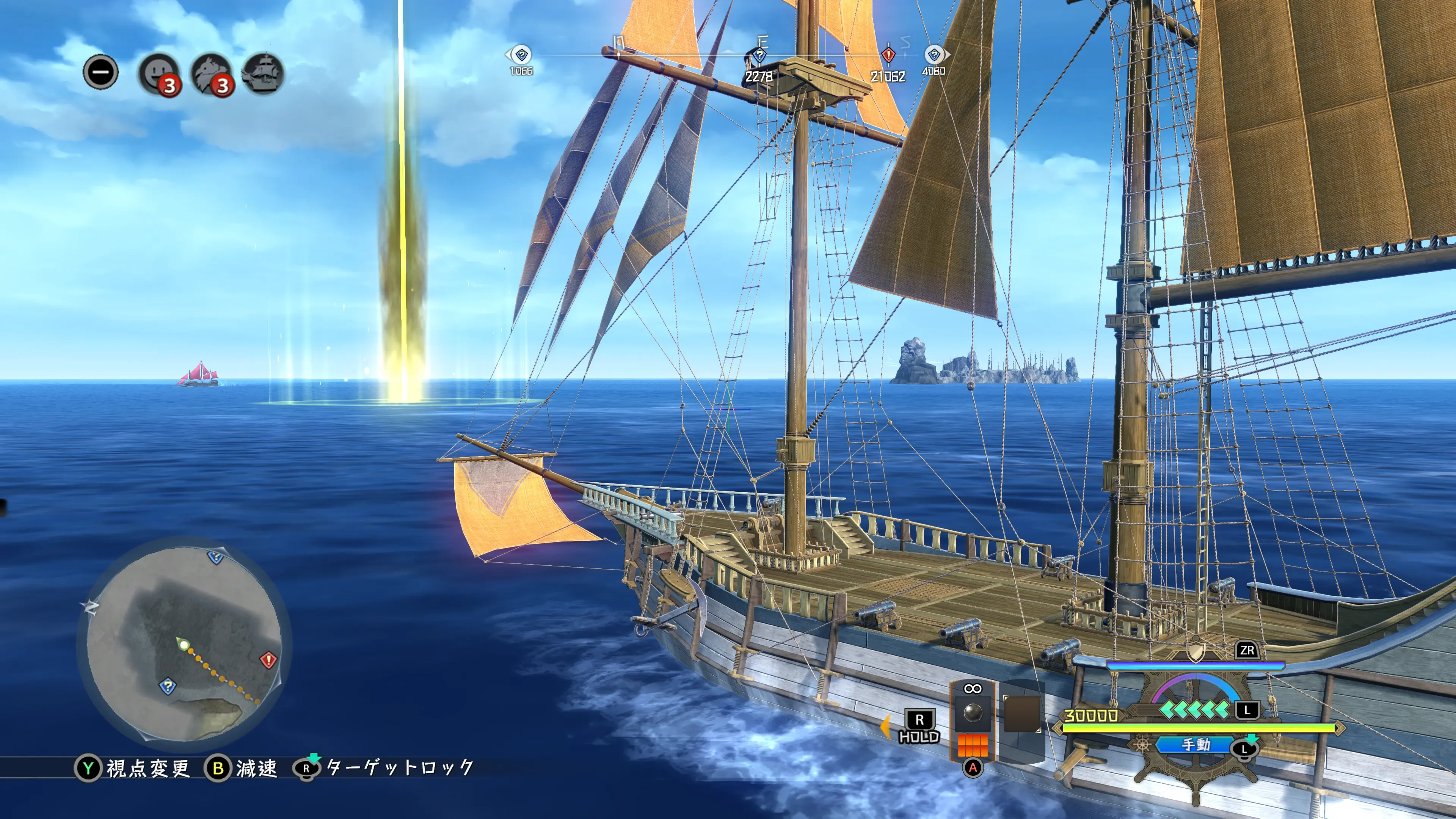 乘坐帆船《桑德拉斯號》進行探索時,海上可能會出現「黃金圖示」。 衝入「黃金圖示」觸發「海戰」並勝利後,可解鎖新的「海上之風」。