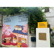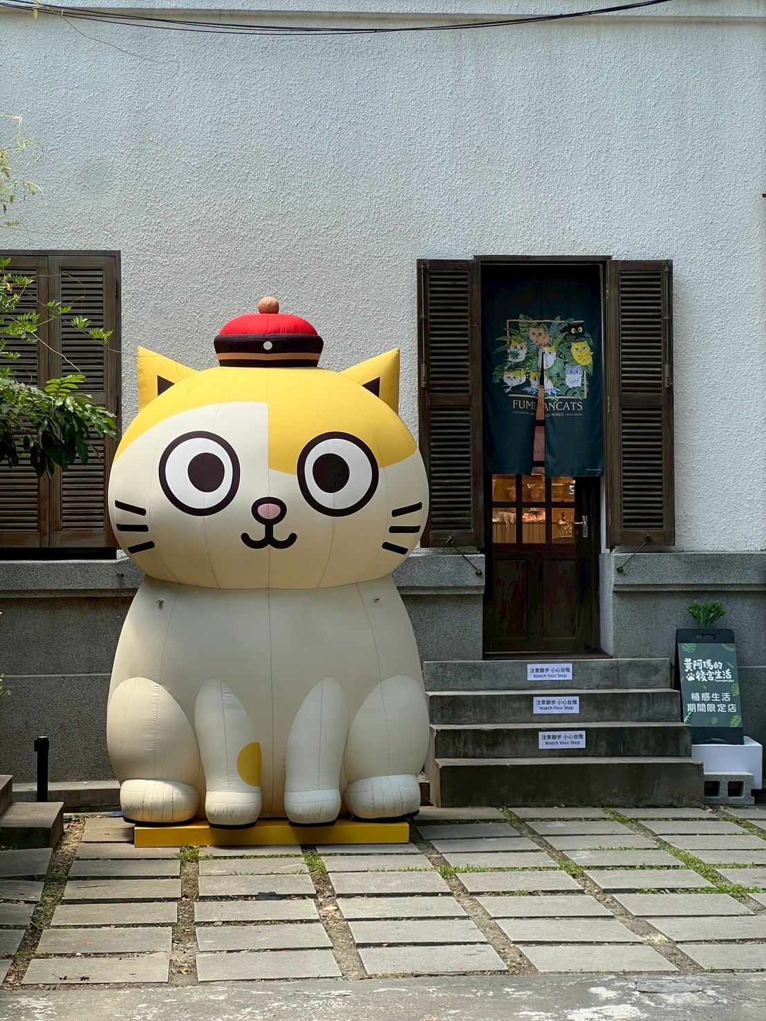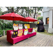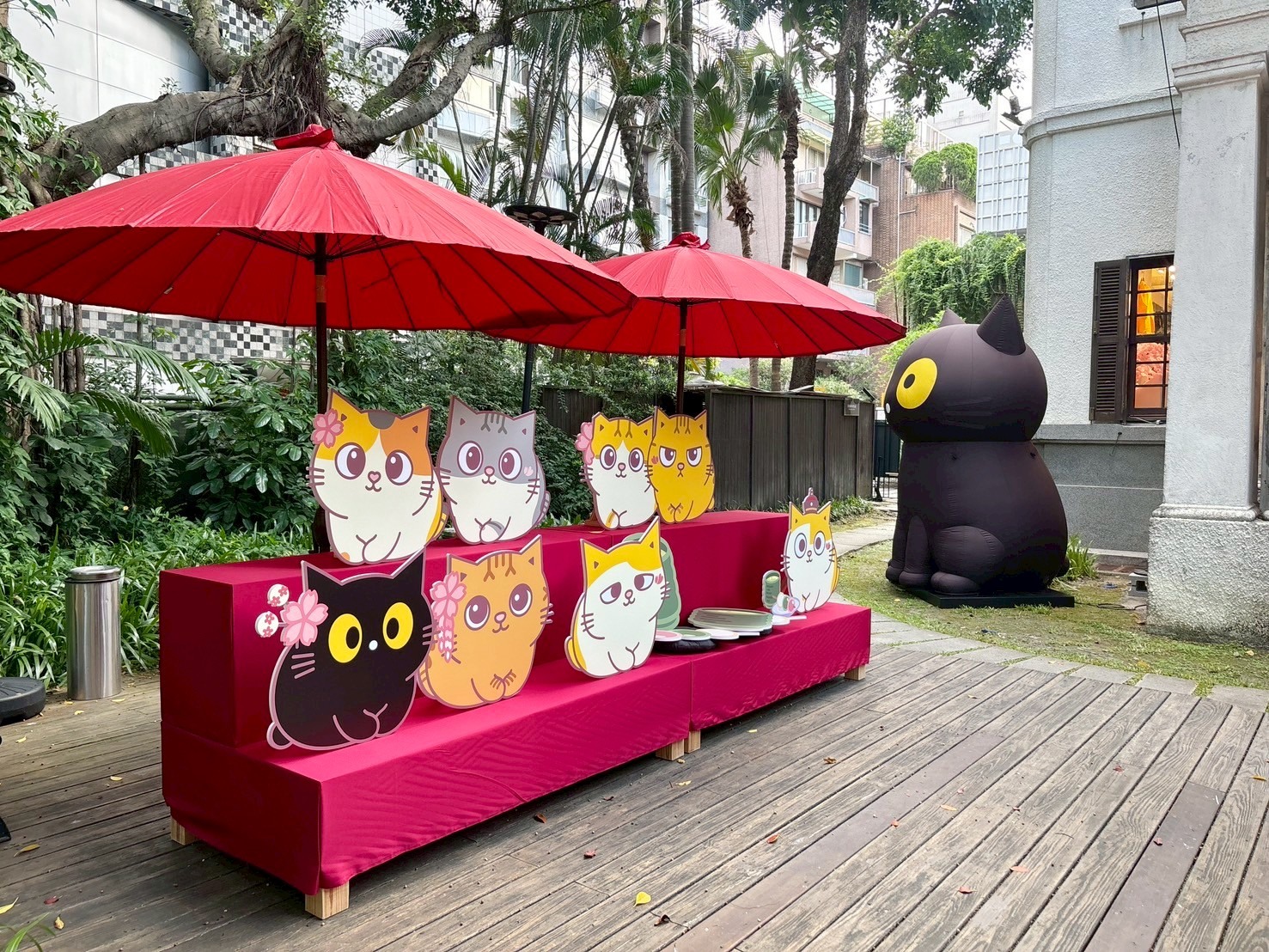 • 戶外木棧板區,八隻貓咪悠閒坐在紅色日式和傘下