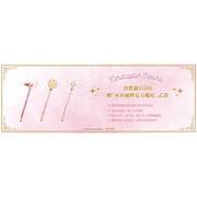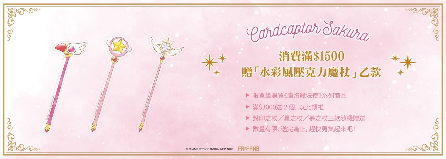 凡於現場單筆消費滿額 1,500 元,即可獲得期間限定贈禮。滿額贈禮(隨機一款):壓克力封印之杖、星之杖、夢之杖。此外,只要加入 FANFANS 粉粉 LINE 官方帳號,即可獲得線上 100 元優惠券以及線下快閃店的 100 元優惠券。凡於快閃店現場或 FANFANS 官網消費系列商品滿 1,000 元(不含餐點)即可折抵。