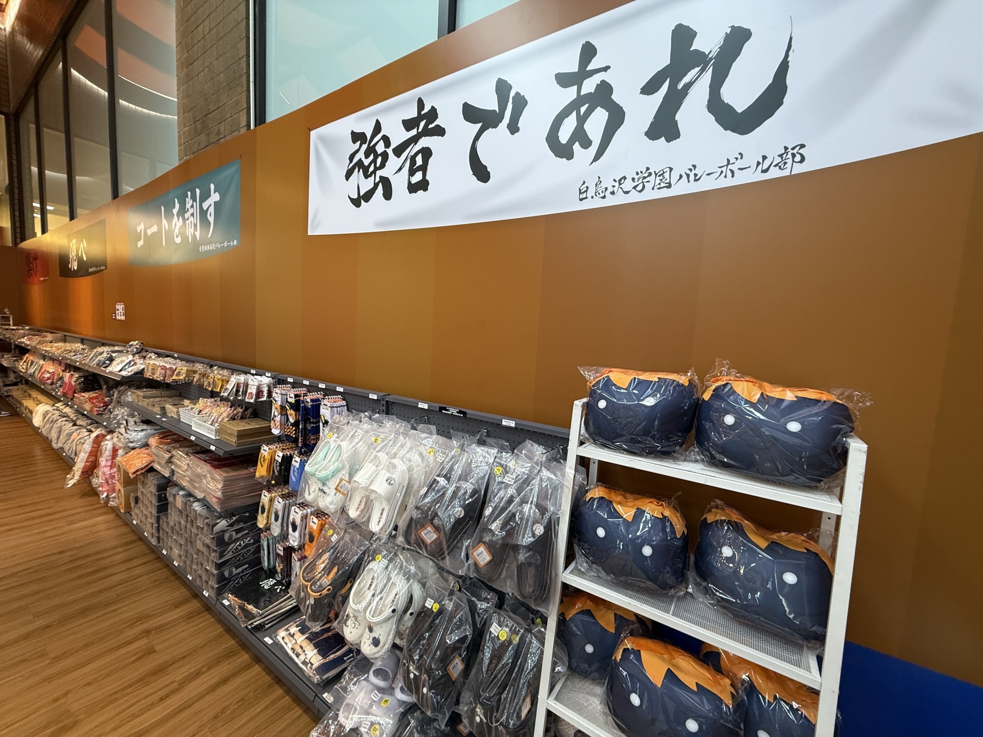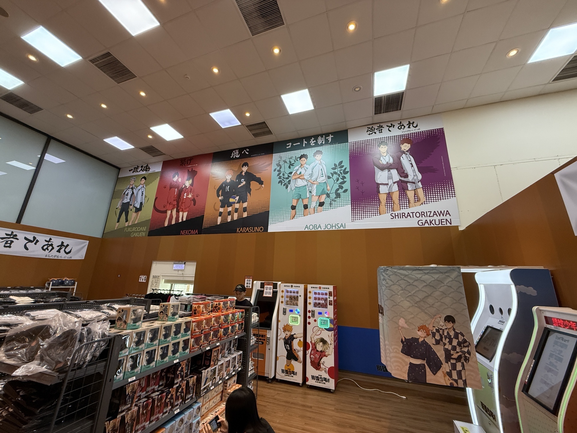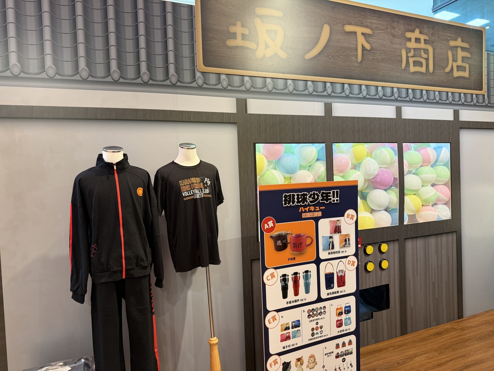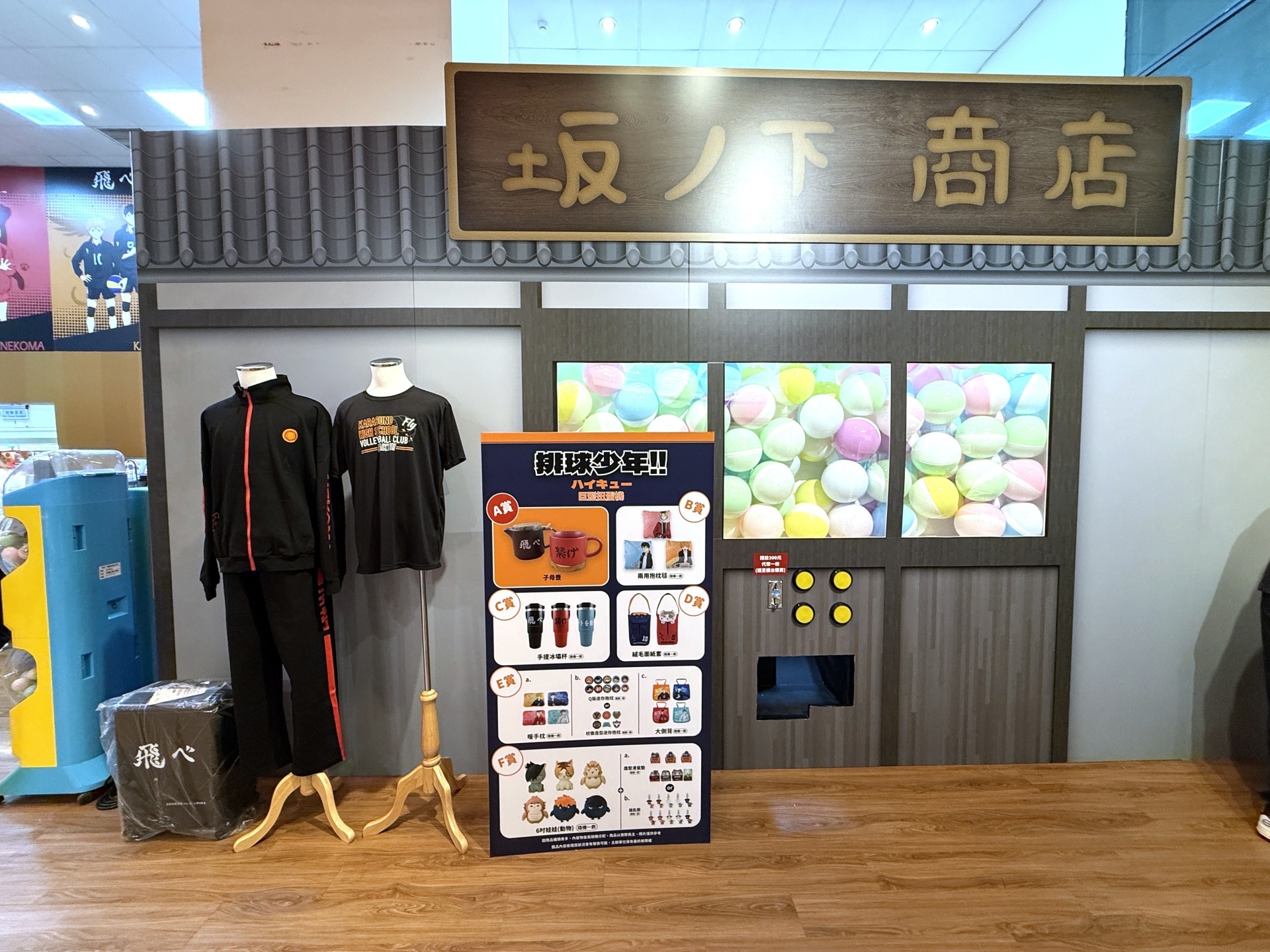 首先在打卡點的部分,一出電梯口就能看見快閃店主視覺在門口,而進入快閃店後將可以看到日向、影山高飛殺球,月島攔網等十位烏野高中選手的姿態化作立體造景呈現。抬頭牆上有五面學校應援旗,從青葉城西高中的「制霸球場」到音駒高中的「維繫」,另一面還有「一球入魂」的梟谷學園高中主將木兔及赤葦、白鳥澤學園的牛島和天童,打造成「坂之下商店」的大扭蛋機,同樣將會在本次快閃活動中登場。