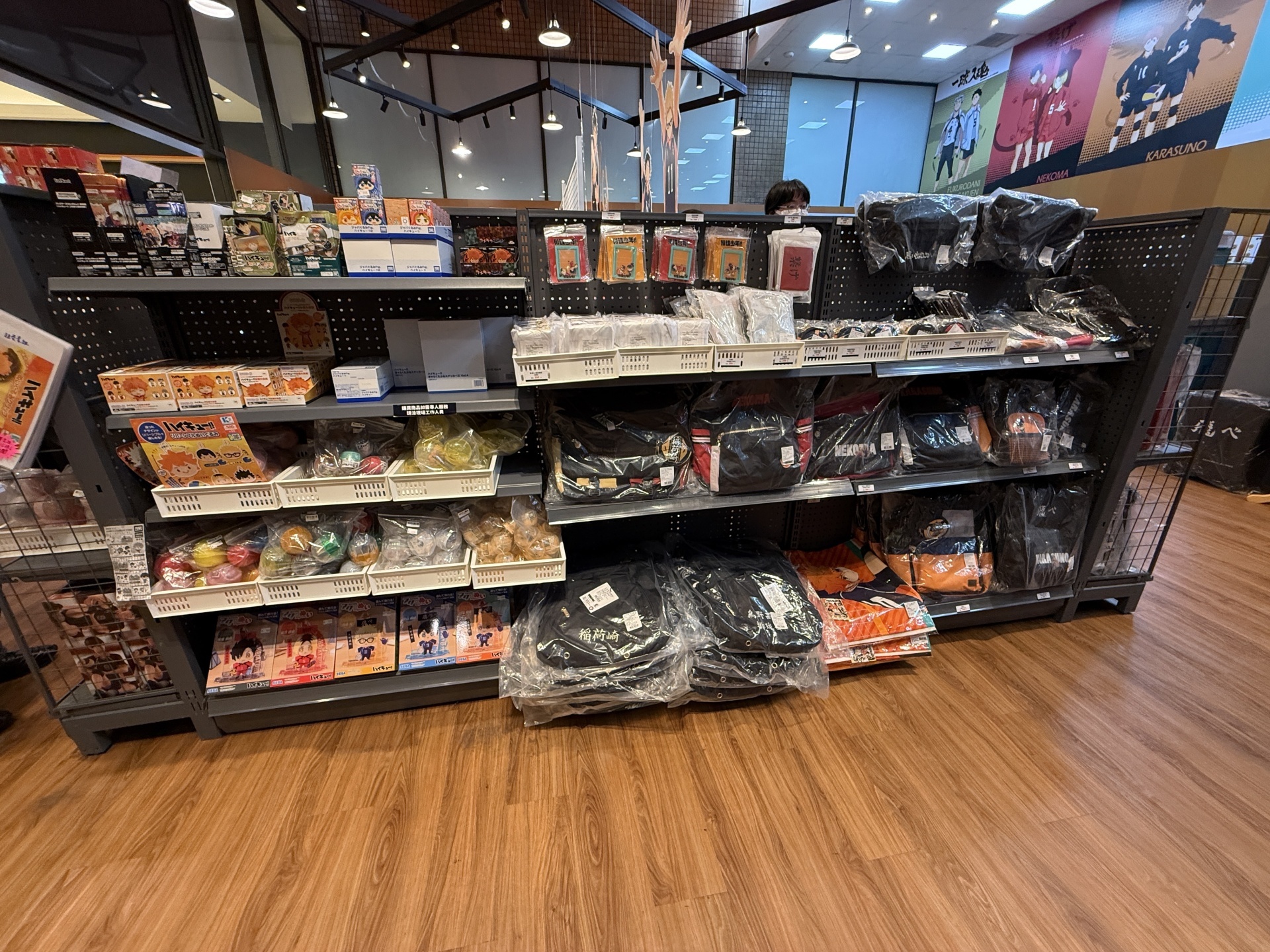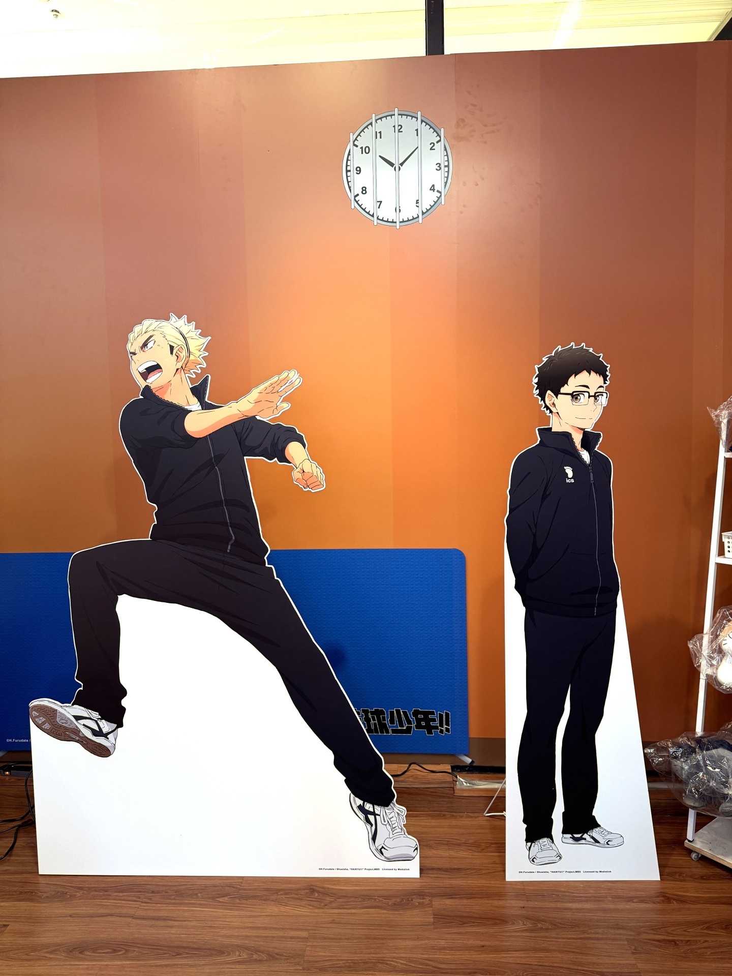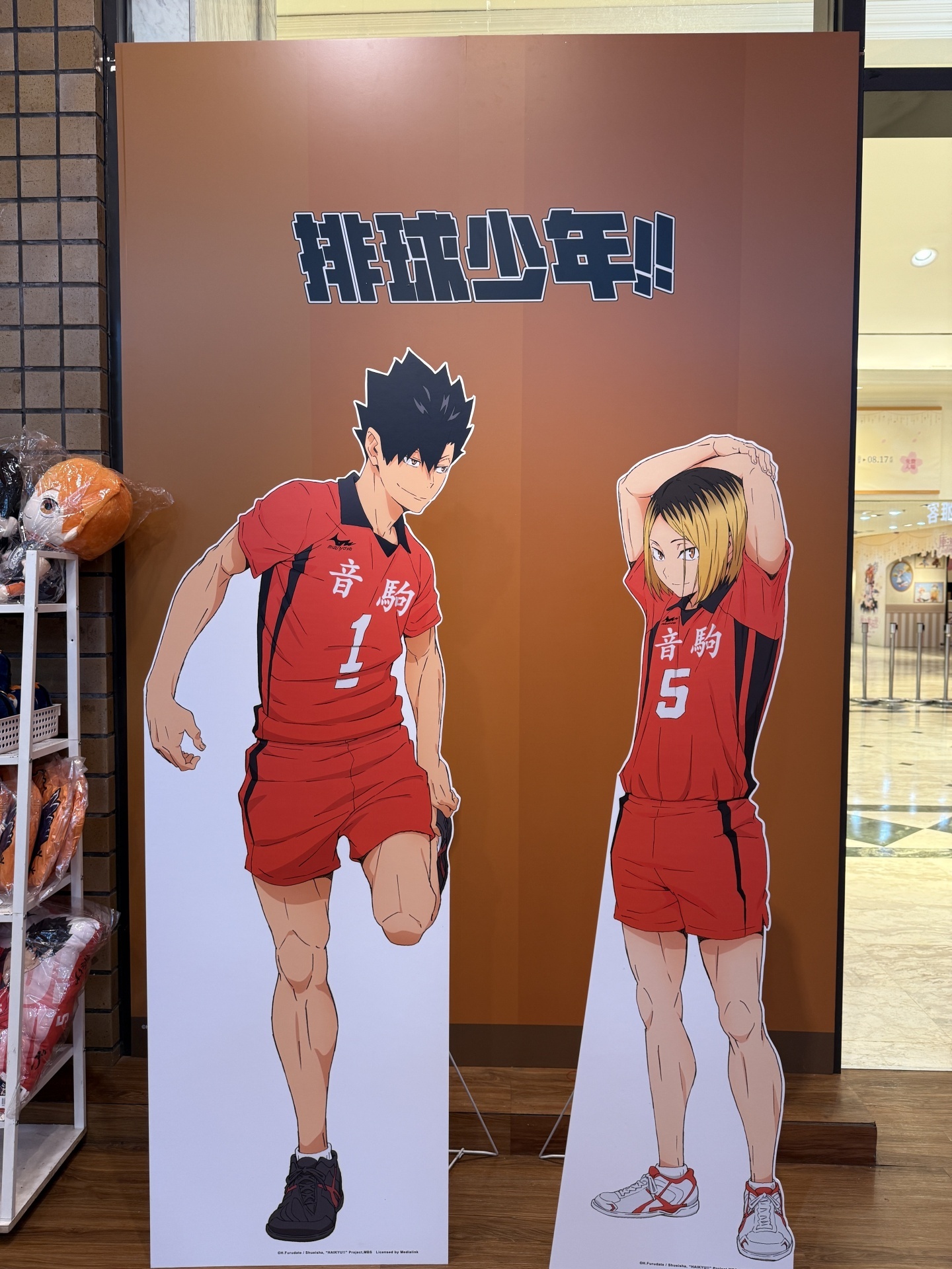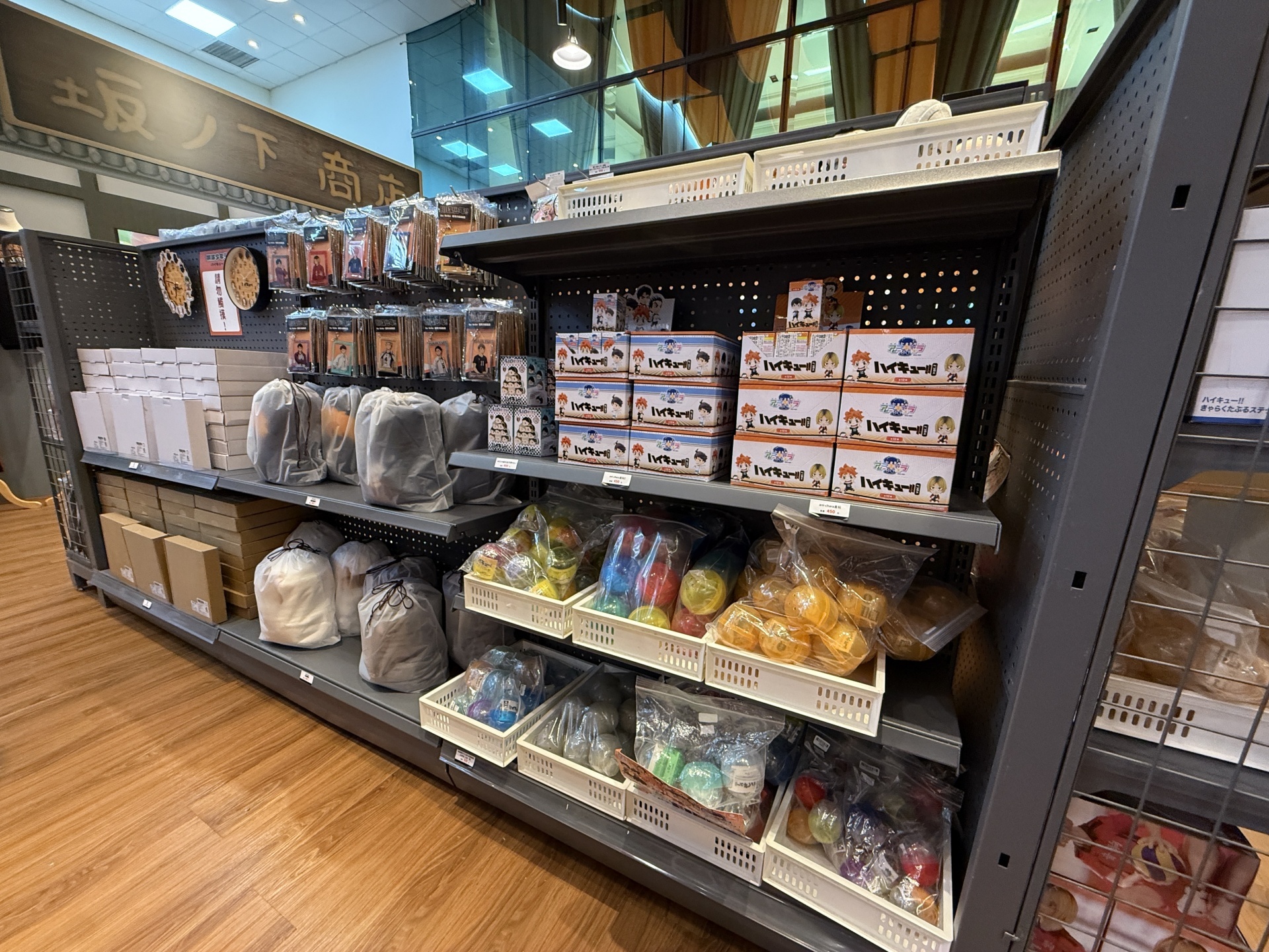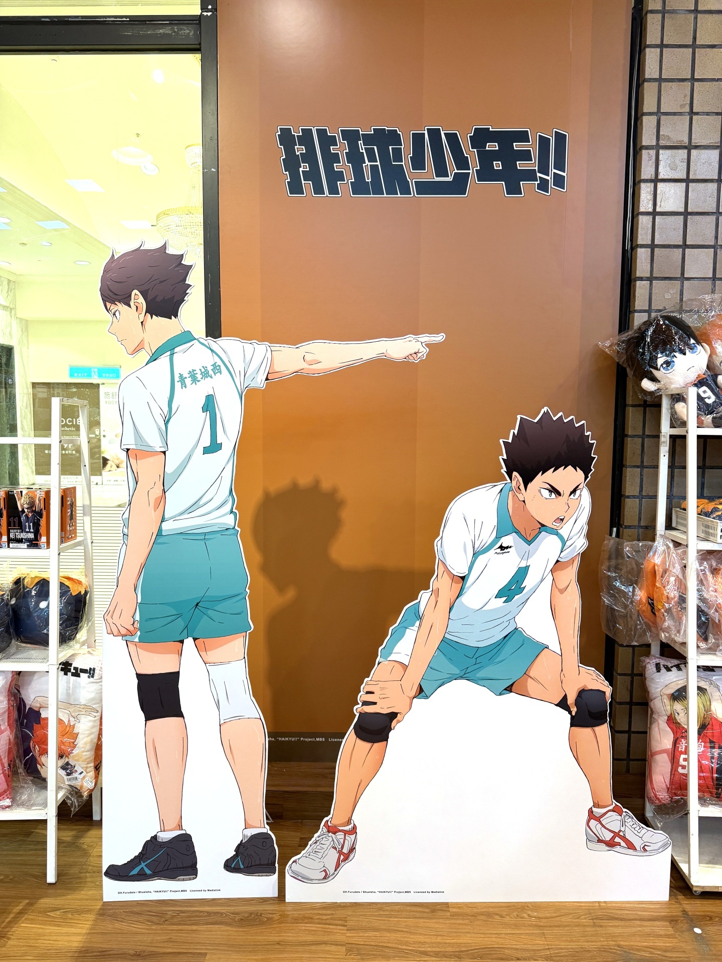 首先在打卡點的部分,一出電梯口就能看見快閃店主視覺在門口,而進入快閃店後將可以看到日向、影山高飛殺球,月島攔網等十位烏野高中選手的姿態化作立體造景呈現。抬頭牆上有五面學校應援旗,從青葉城西高中的「制霸球場」到音駒高中的「維繫」,另一面還有「一球入魂」的梟谷學園高中主將木兔及赤葦、白鳥澤學園的牛島和天童,打造成「坂之下商店」的大扭蛋機,同樣將會在本次快閃活動中登場。