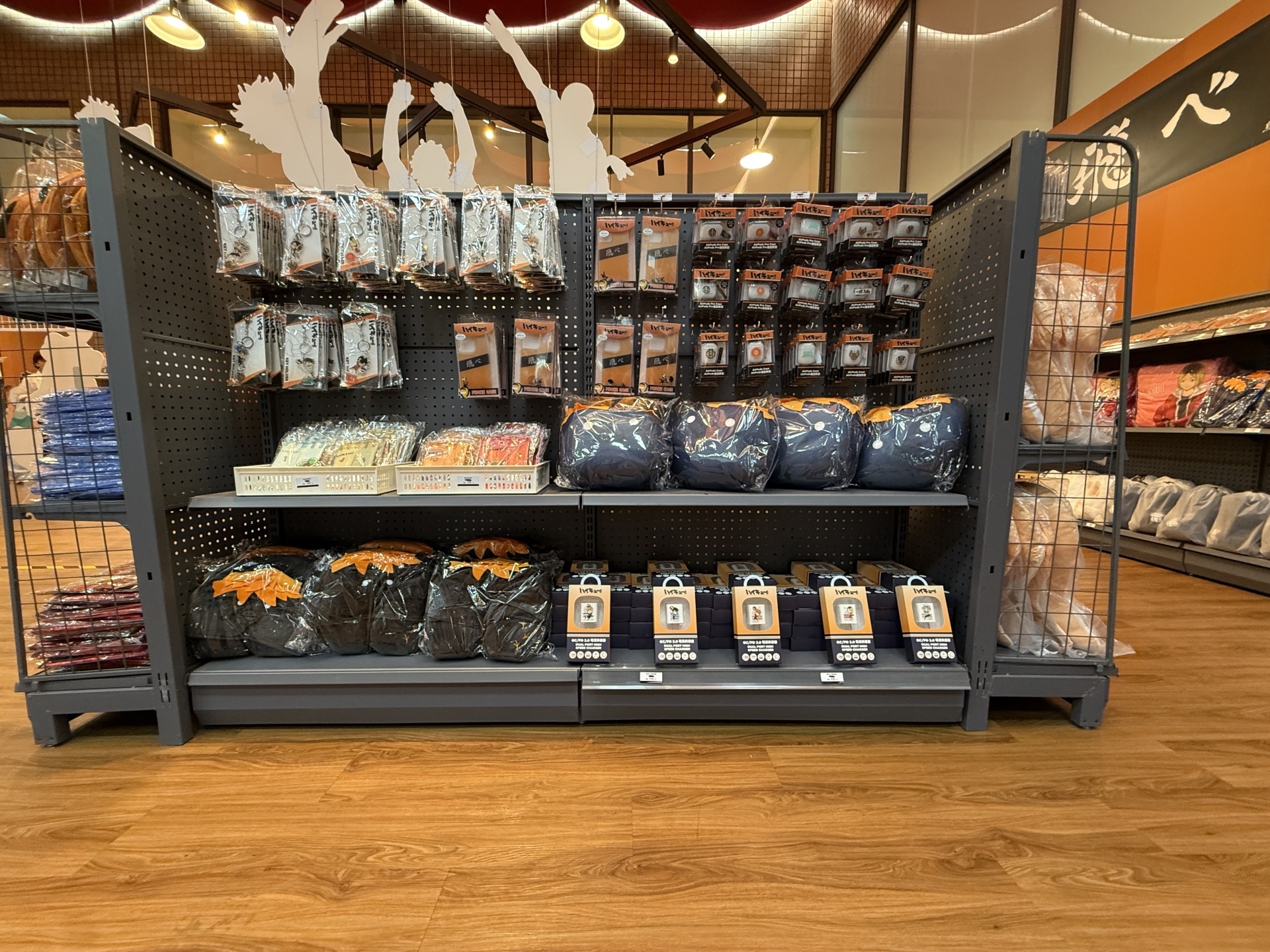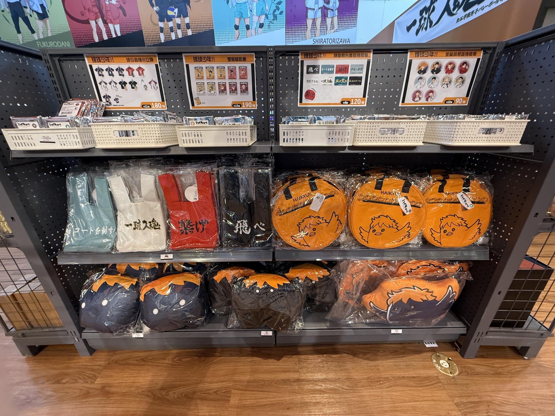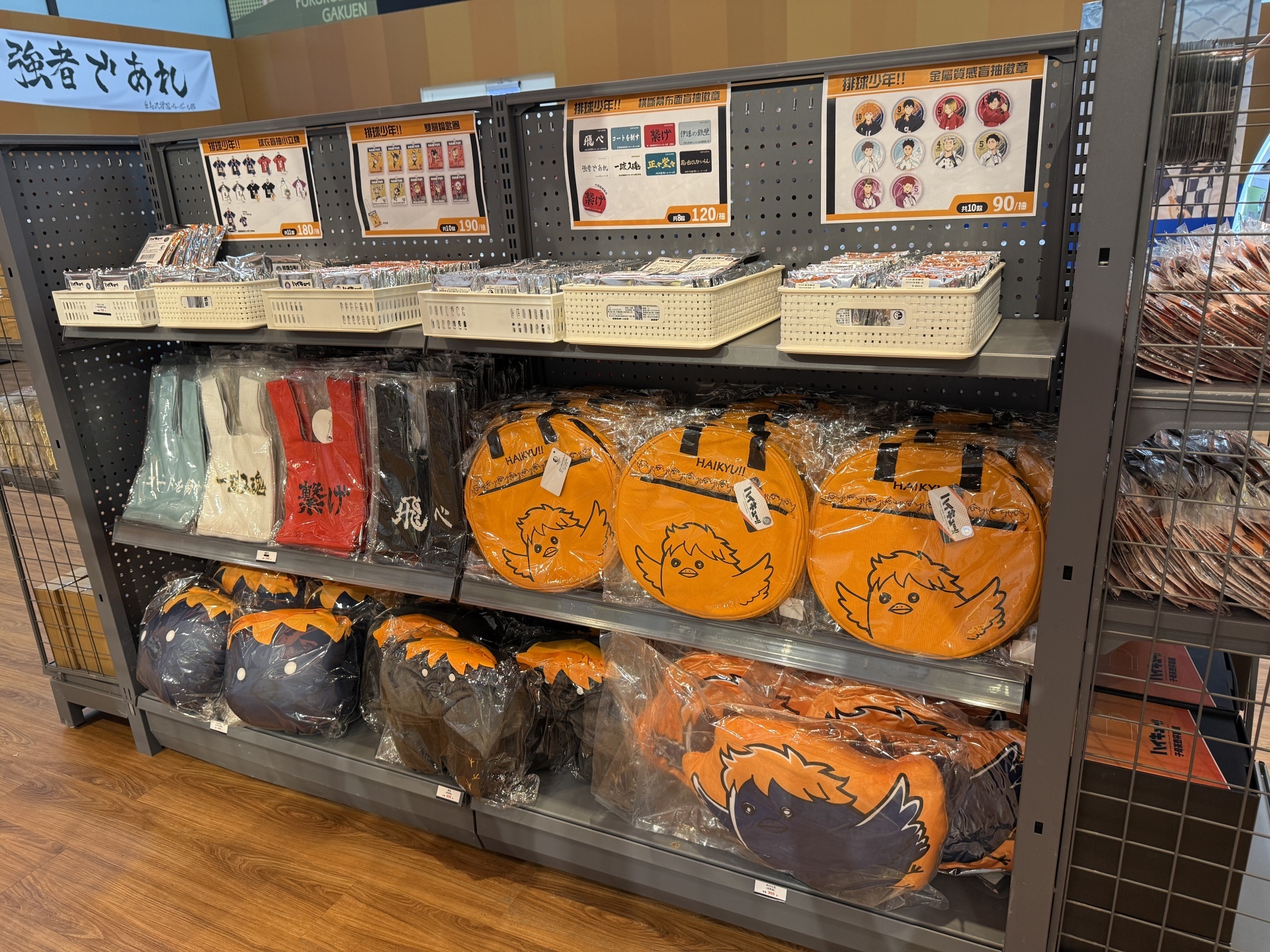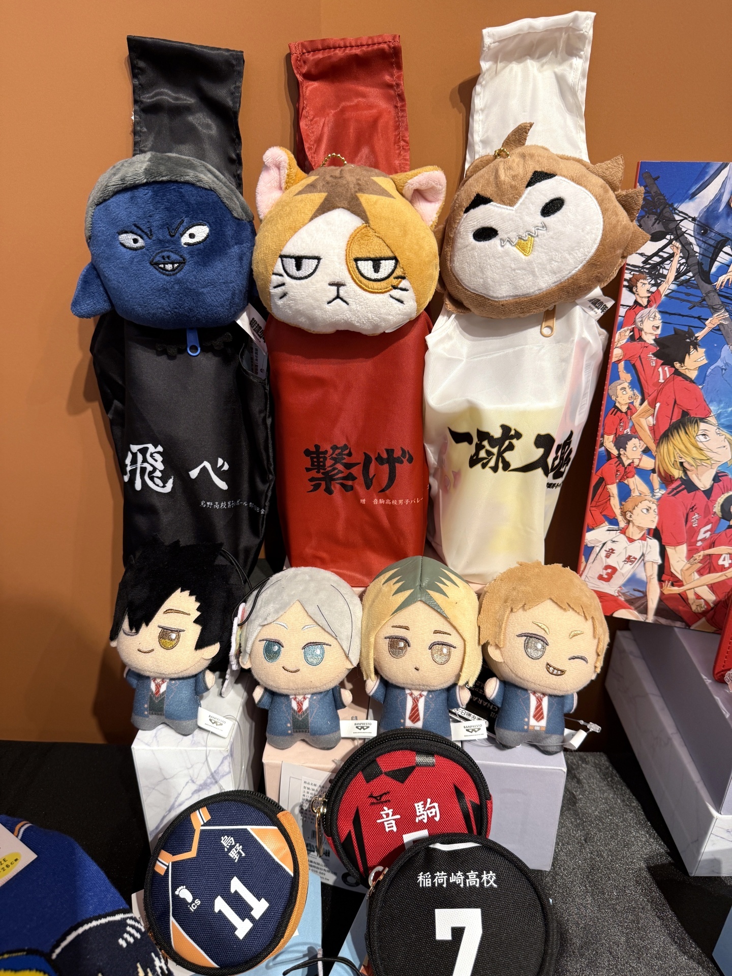 首先在打卡點的部分,一出電梯口就能看見快閃店主視覺在門口,而進入快閃店後將可以看到日向、影山高飛殺球,月島攔網等十位烏野高中選手的姿態化作立體造景呈現。抬頭牆上有五面學校應援旗,從青葉城西高中的「制霸球場」到音駒高中的「維繫」,另一面還有「一球入魂」的梟谷學園高中主將木兔及赤葦、白鳥澤學園的牛島和天童,打造成「坂之下商店」的大扭蛋機,同樣將會在本次快閃活動中登場。