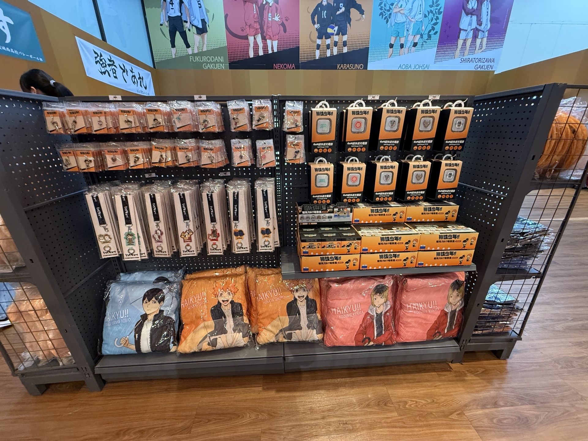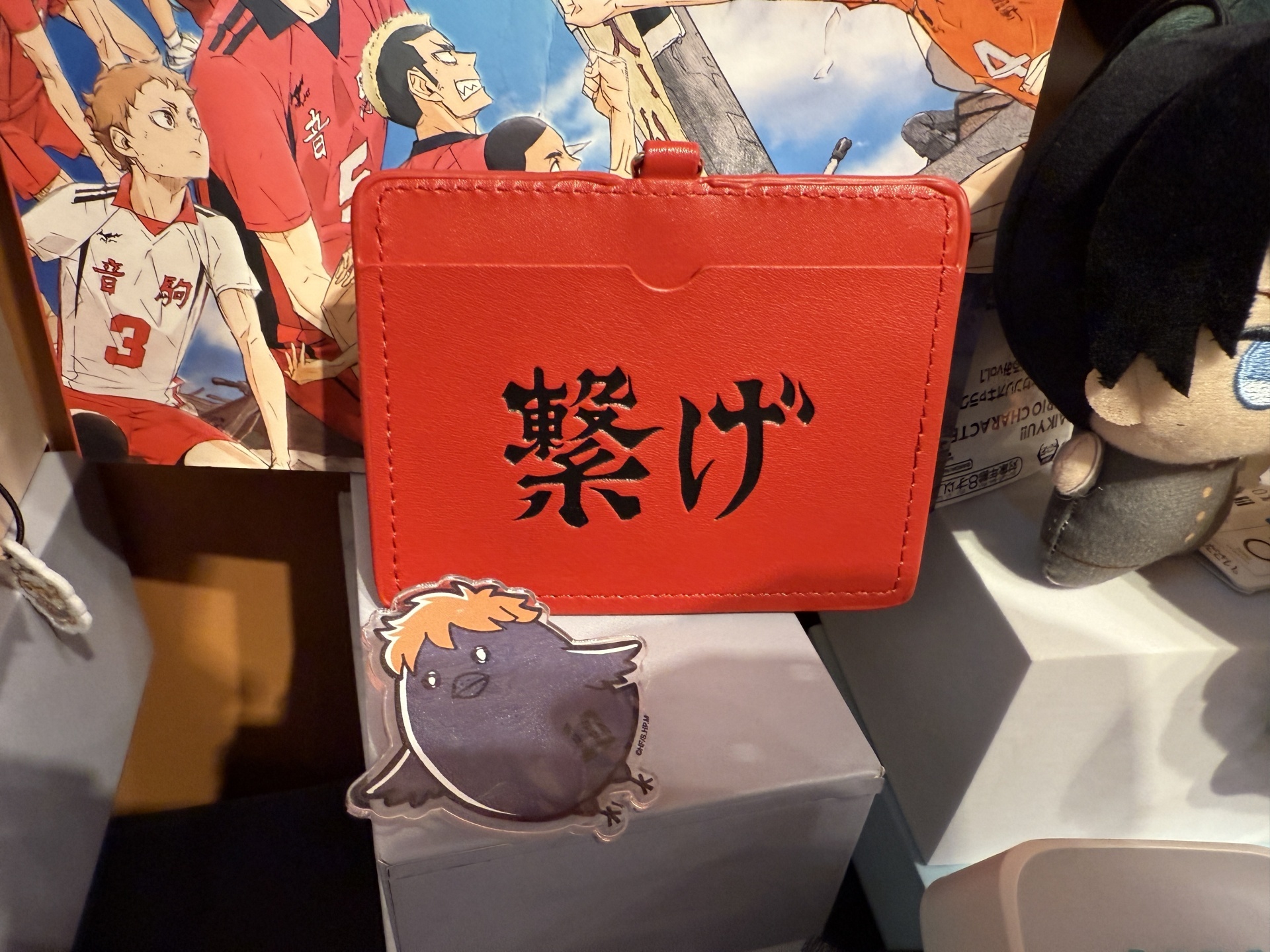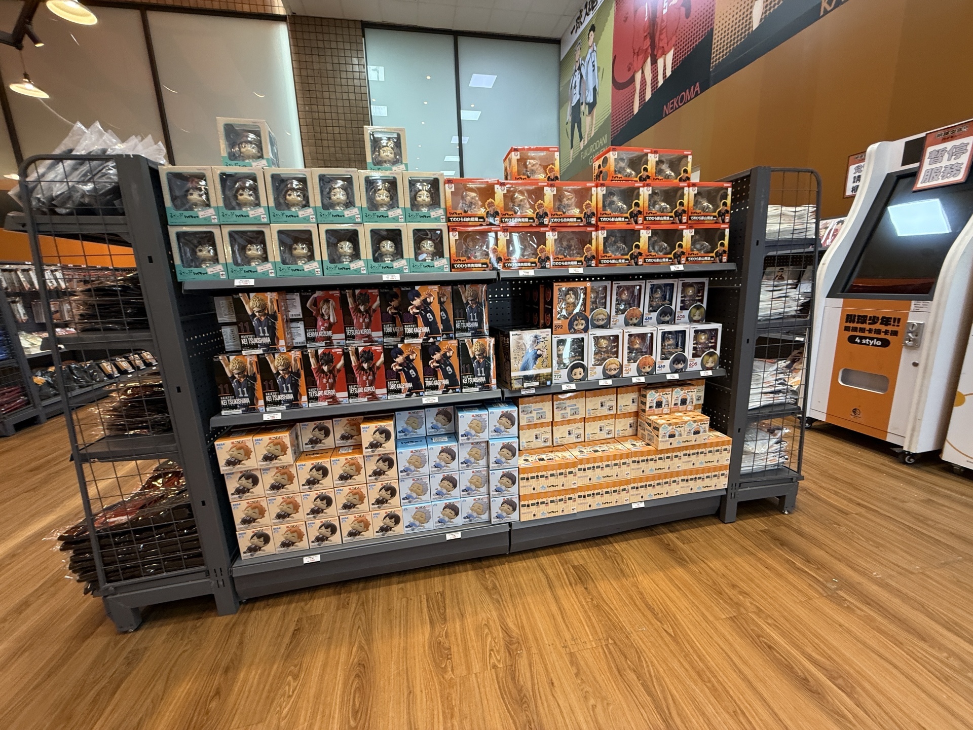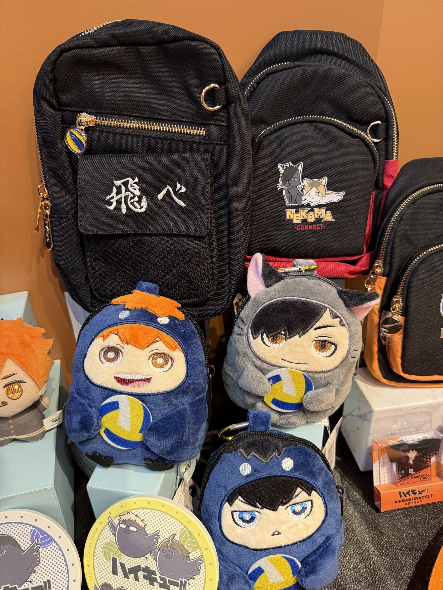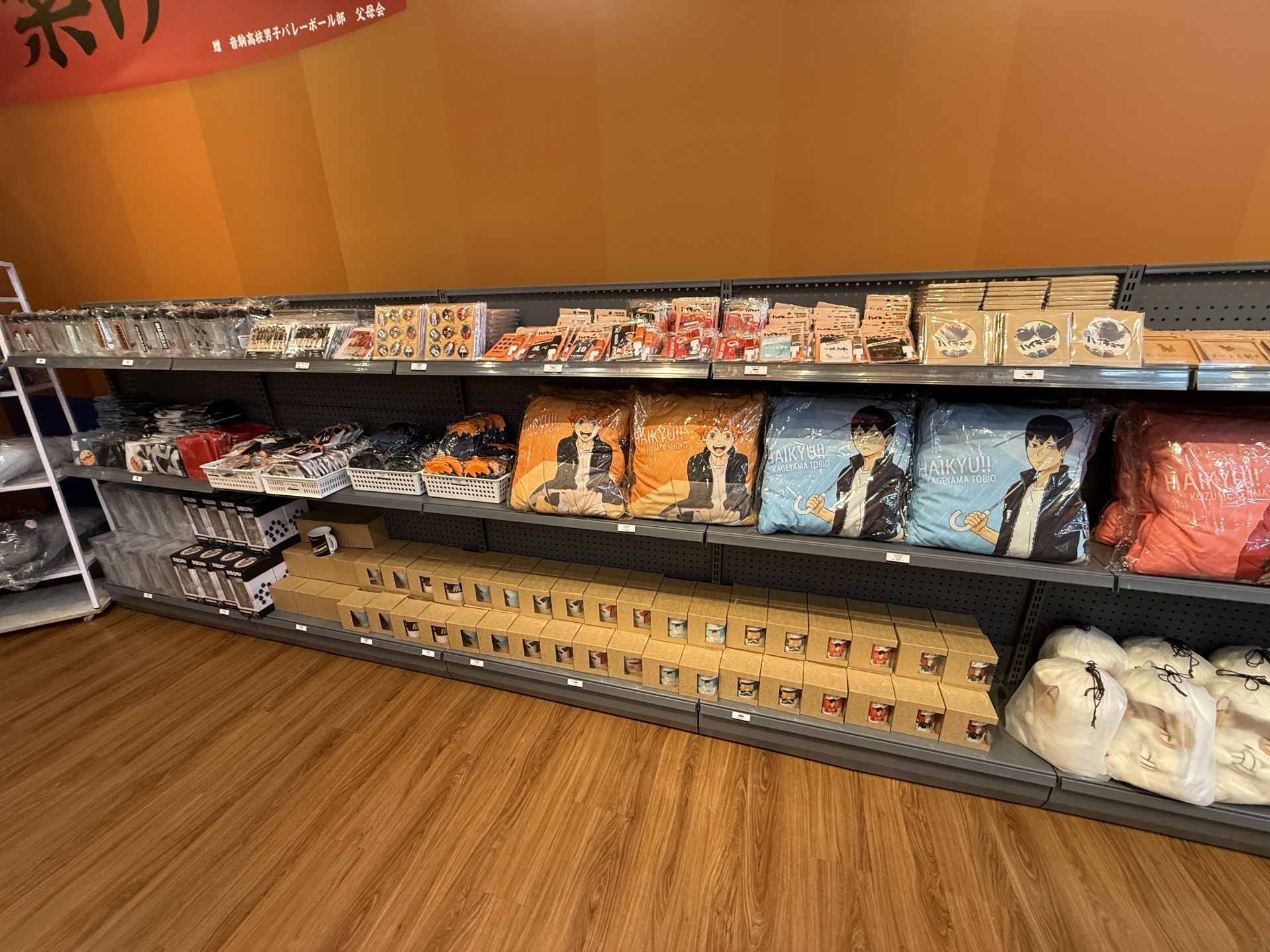 首先在打卡點的部分,一出電梯口就能看見快閃店主視覺在門口,而進入快閃店後將可以看到日向、影山高飛殺球,月島攔網等十位烏野高中選手的姿態化作立體造景呈現。抬頭牆上有五面學校應援旗,從青葉城西高中的「制霸球場」到音駒高中的「維繫」,另一面還有「一球入魂」的梟谷學園高中主將木兔及赤葦、白鳥澤學園的牛島和天童,打造成「坂之下商店」的大扭蛋機,同樣將會在本次快閃活動中登場。