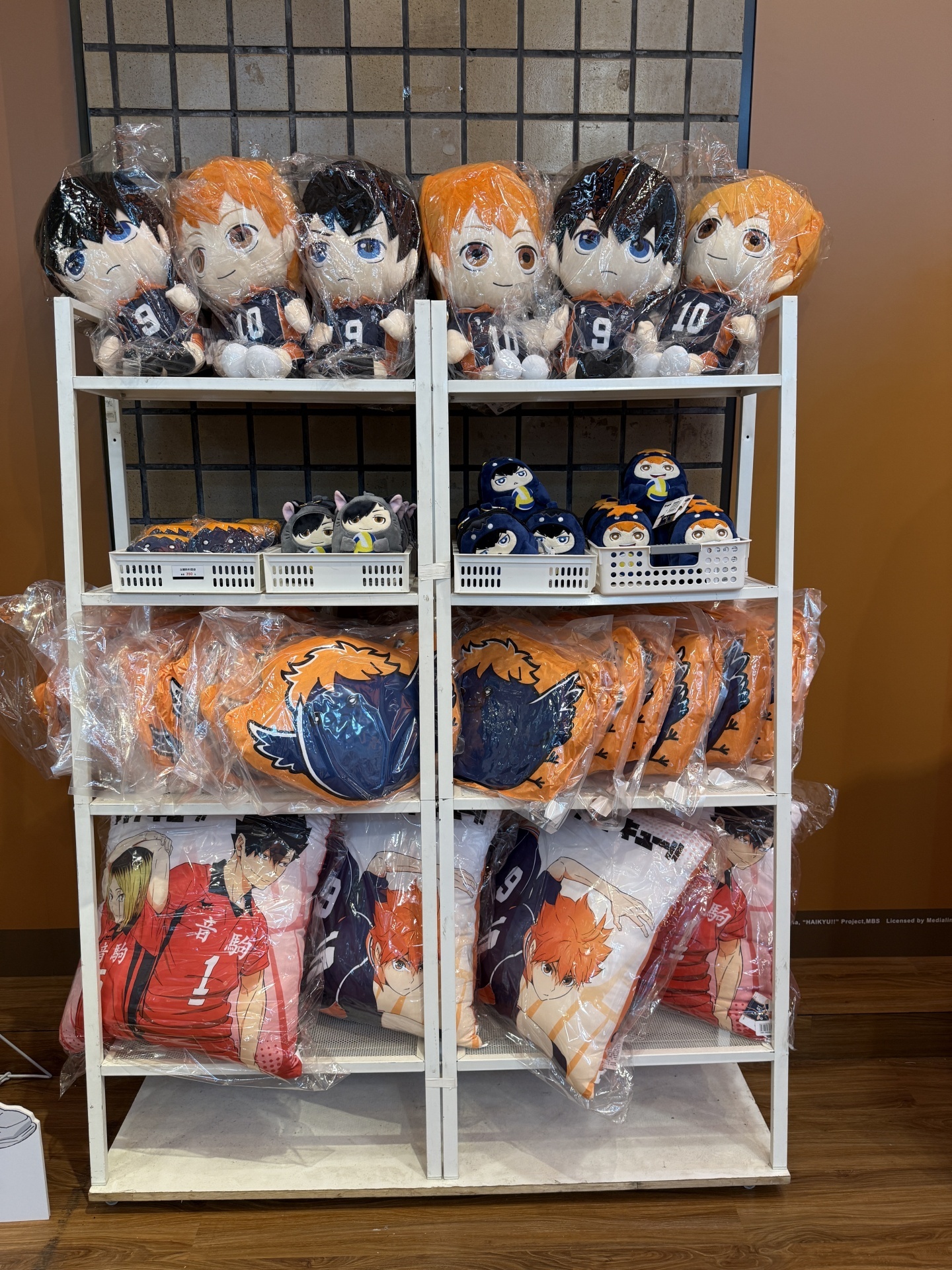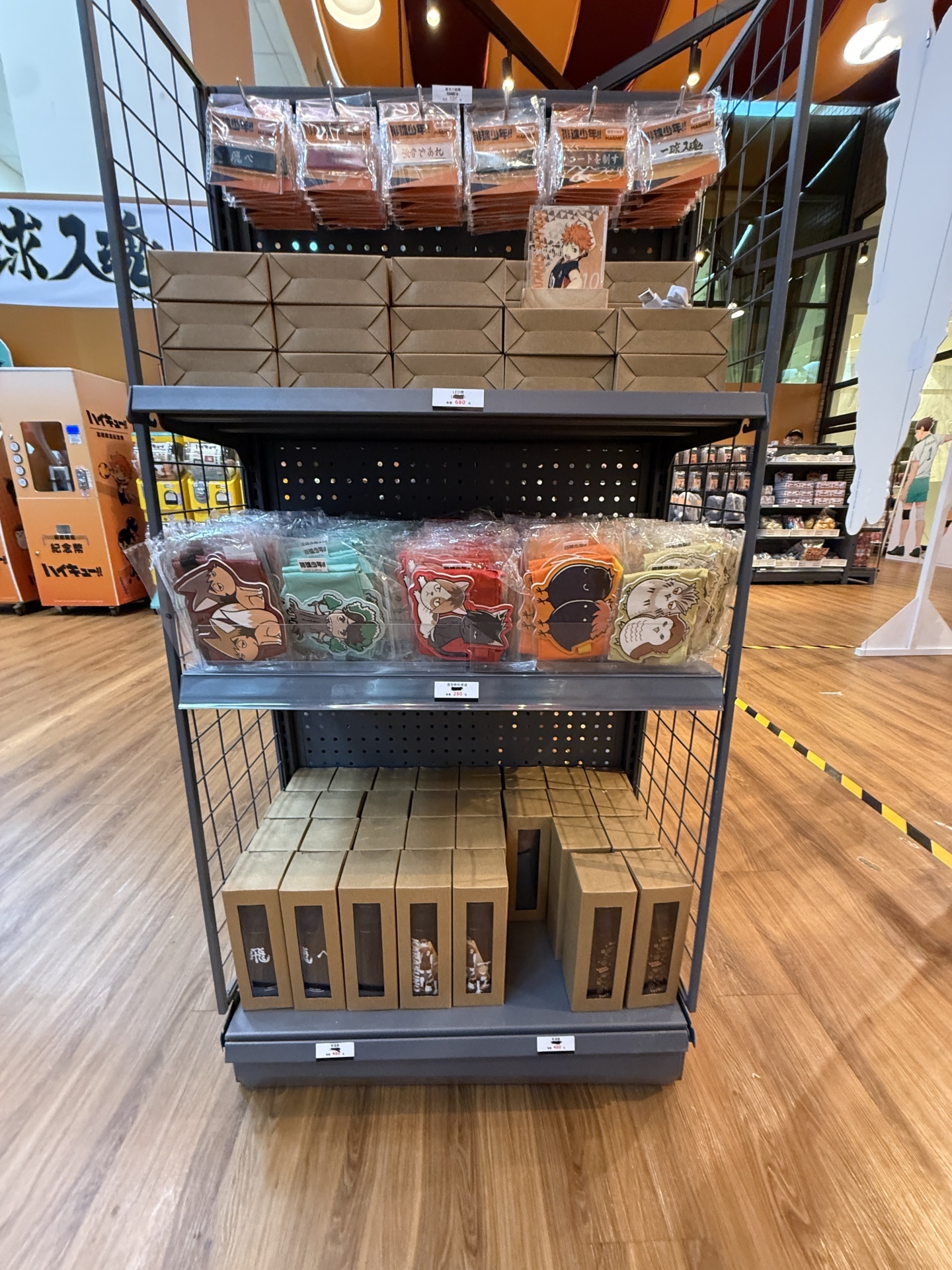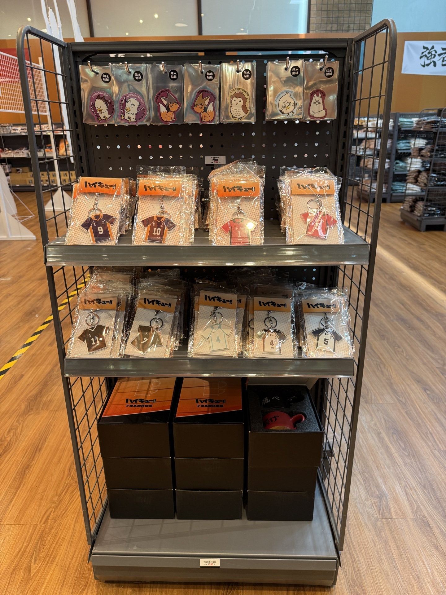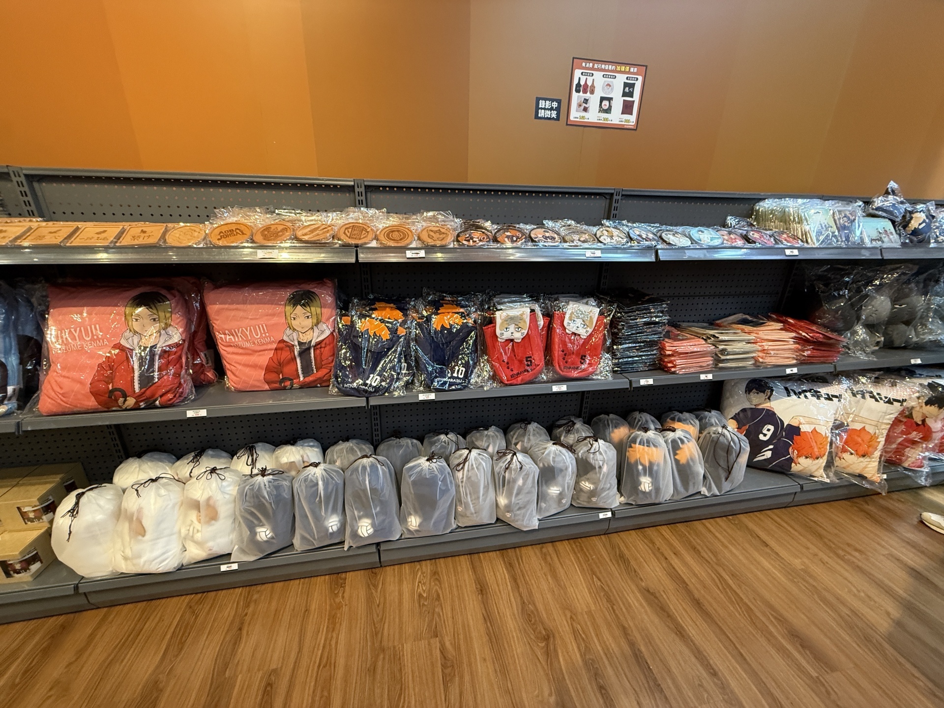 首先在打卡點的部分,一出電梯口就能看見快閃店主視覺在門口,而進入快閃店後將可以看到日向、影山高飛殺球,月島攔網等十位烏野高中選手的姿態化作立體造景呈現。抬頭牆上有五面學校應援旗,從青葉城西高中的「制霸球場」到音駒高中的「維繫」,另一面還有「一球入魂」的梟谷學園高中主將木兔及赤葦、白鳥澤學園的牛島和天童,打造成「坂之下商店」的大扭蛋機,同樣將會在本次快閃活動中登場。