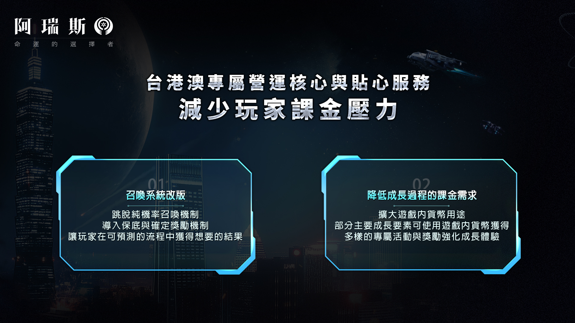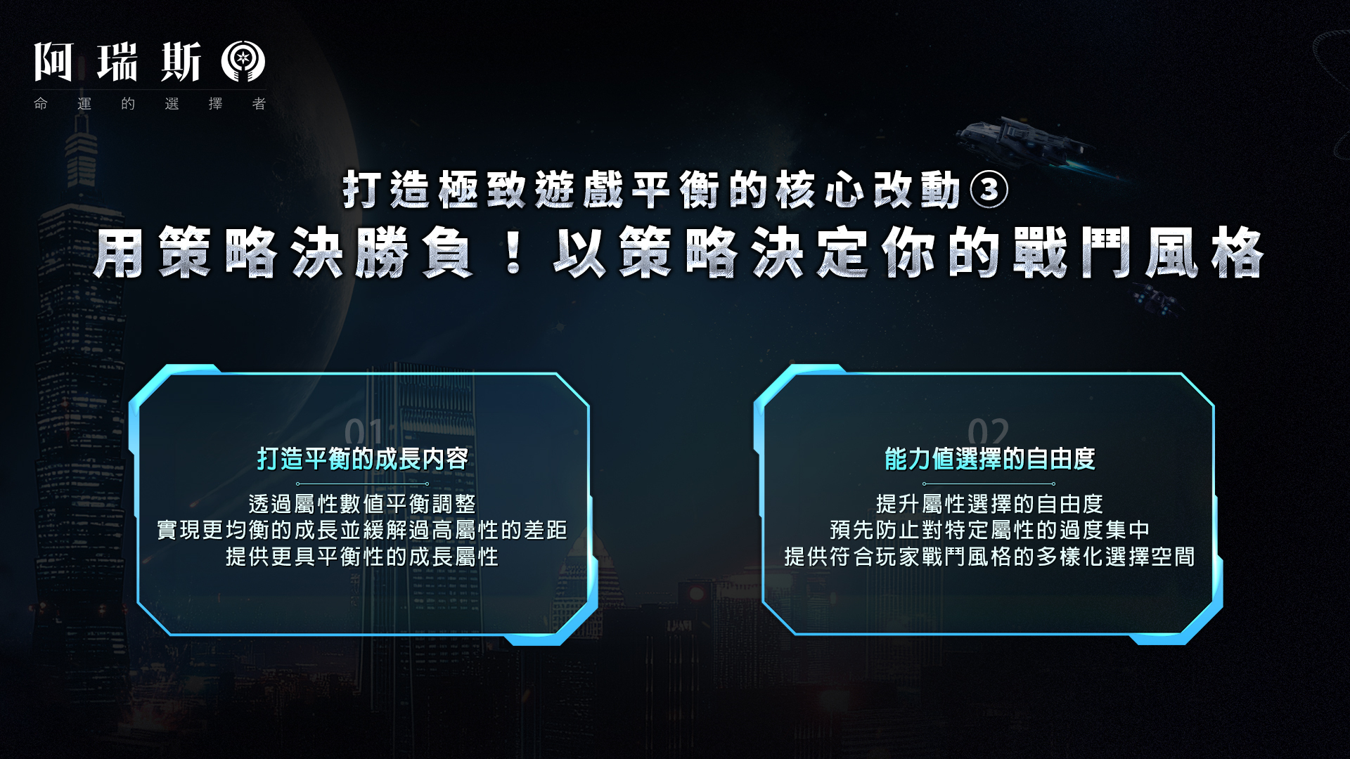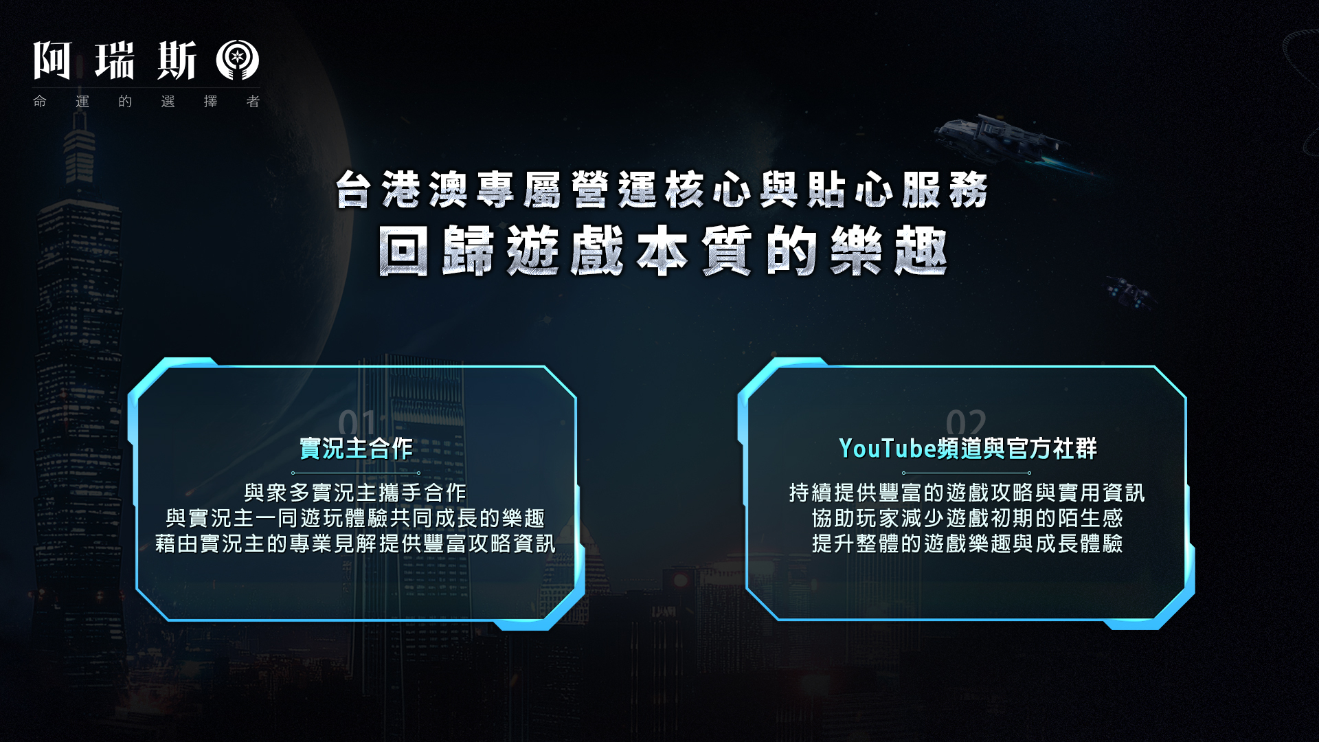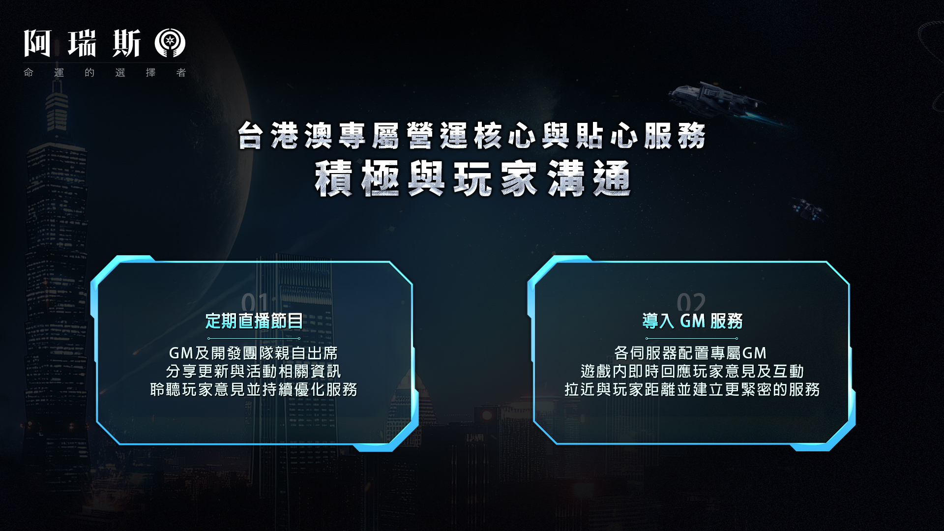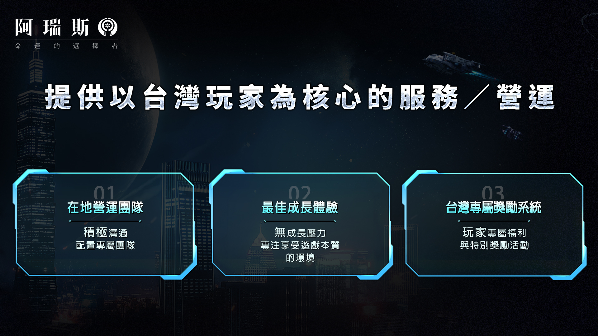 Com2uS Holdings 代表鄭哲浩表示:「《阿瑞斯:命運的選擇者》是一款超越傳統手遊水準的 MMORPG,不僅在遊戲性與系統設計上具備明顯差異,更開啟了 MMORPG 類型的新篇章。我們以高水準美術與完整世界觀,打造一個既科幻又貼近玩家的近未來宇宙,並透過獨特的戰鬥系統,帶來節奏緊湊、打擊感十足的戰場體驗。」另外,遊戲開發商 Second Dive 代表潘承哲則是希望透過空地雙戰場、高速戰甲切換與細膩美術,呈現出獨特的未來戰爭舞台,讓玩家體驗到前所未有過的科幻戰鬥快感。