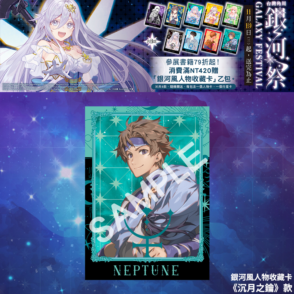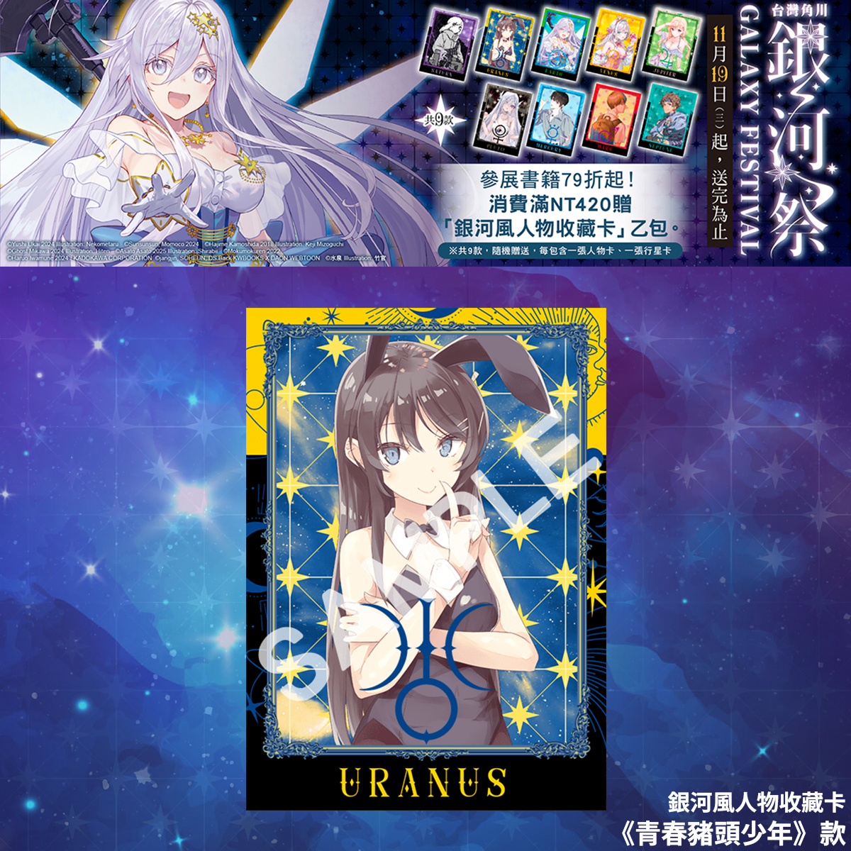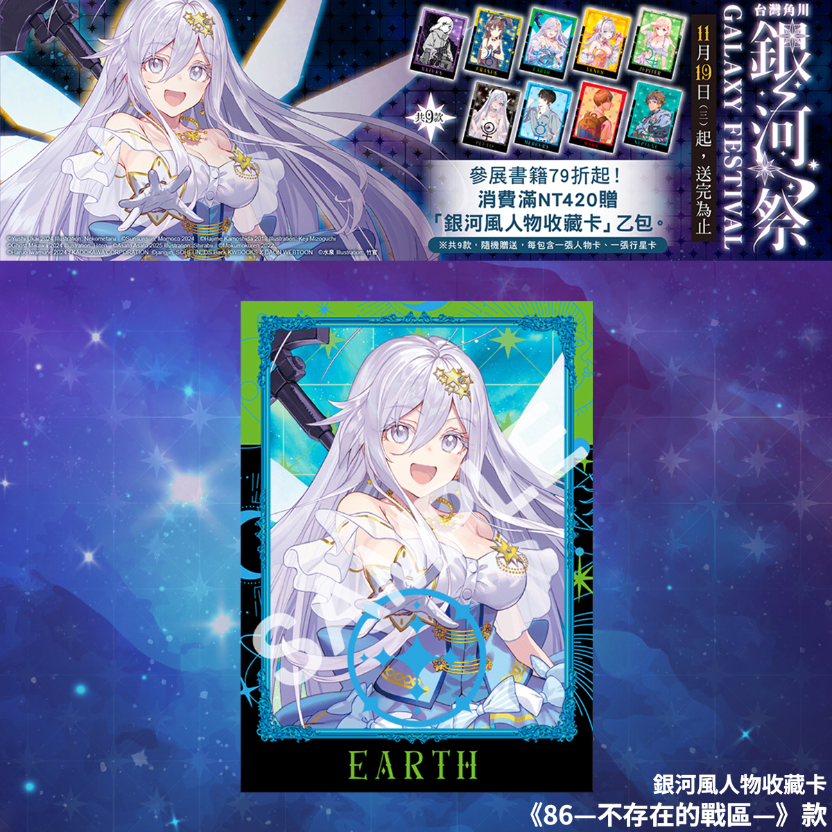凡於台灣角川官網及指定通路購買台灣角川出版之漫畫、輕小說、畫冊、華人原創、輕.文學、精品,單筆消費滿 420 元,即可獲得散發星河之光的「銀河風人物收藏卡」乙包。※ 共 9 款,隨機贈送,送完為止。