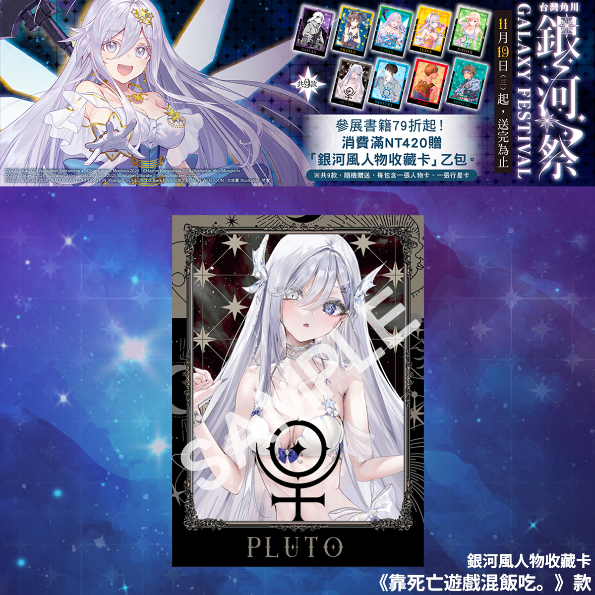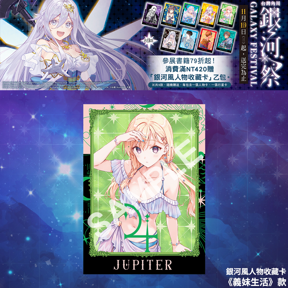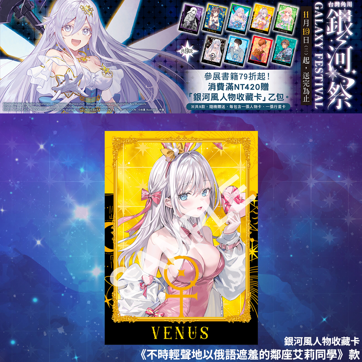 凡於台灣角川官網及指定通路購買台灣角川出版之漫畫、輕小說、畫冊、華人原創、輕.文學、精品,單筆消費滿 420 元,即可獲得散發星河之光的「銀河風人物收藏卡」乙包。※ 共 9 款,隨機贈送,送完為止。