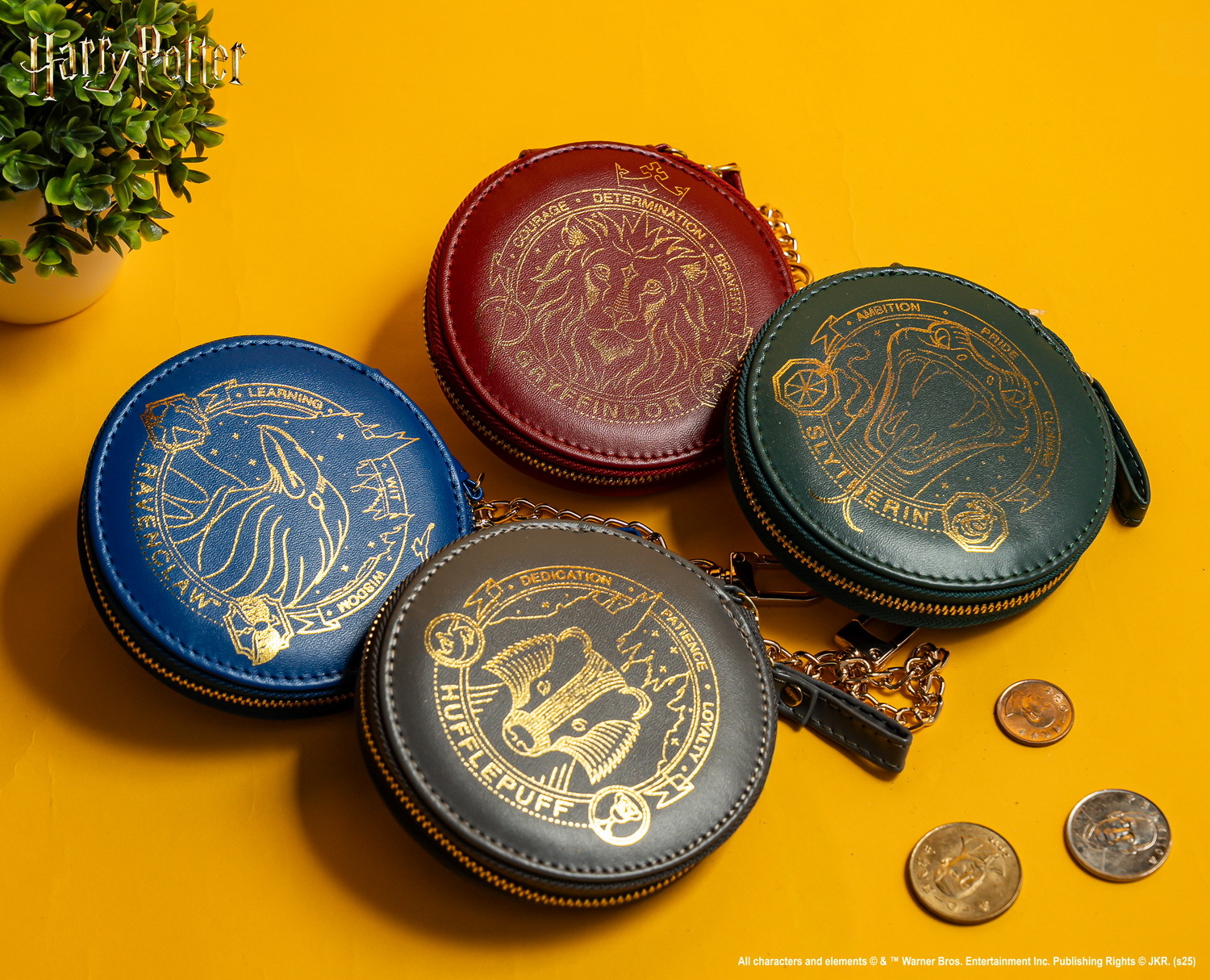 做工超精緻的紅、棕及藍三款「皮革側背包」,以學院徽章與金屬釦環設計,側背或手提都有滿滿學院感啊!飲料不離手的粉絲們,就缺一個不一樣的「飲料提袋」,有粉綠、海軍藍及米白色三款奶油啤酒圖樣選擇!以紅、藍、綠及黑等霍格華茲四學院色為基調的八款「燙金零錢包」,結合燙金徽章設計與皮革質感,粉絲隨身攜帶把零錢收好好,還能掛在包包上當掛飾呢!而以多比與嘿美為靈感打造出圓潤可愛立體造型的「存錢筒」,回家就把零錢丟進去,不僅幫你存下錢錢,更是居家擺設的療癒亮點。