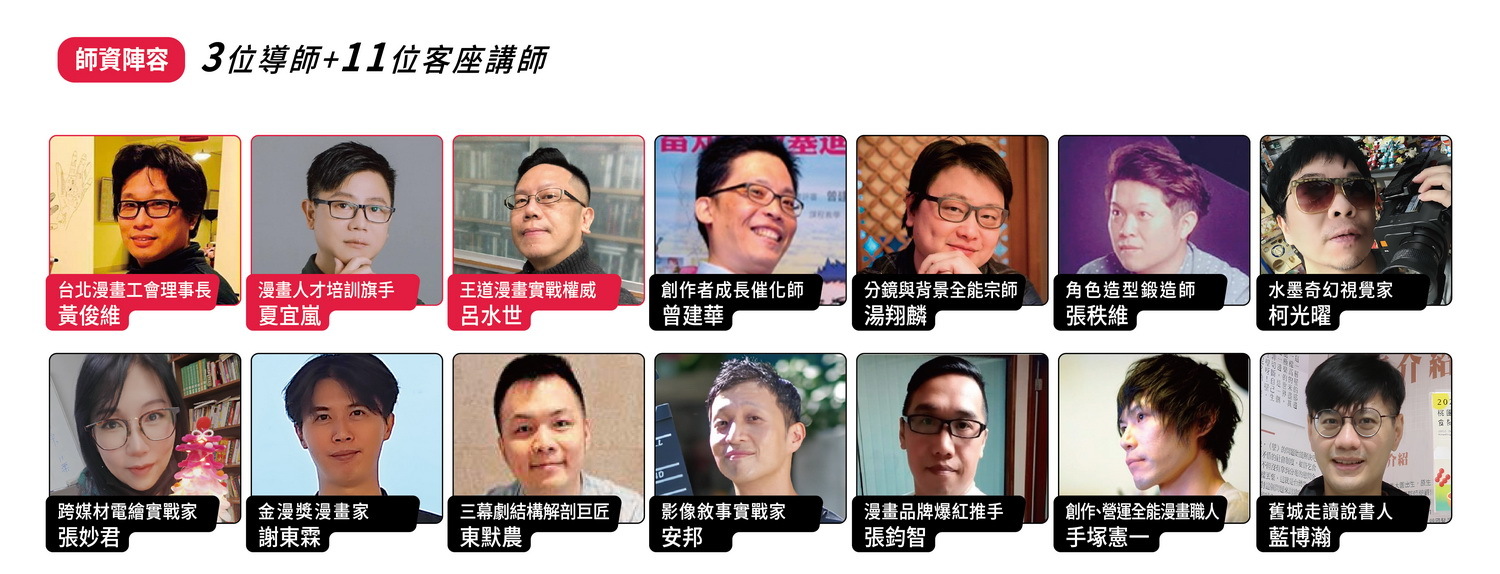 同時集結出版、編劇、分鏡、電繪與完稿實務等專業講師,提供從「訓練」到「完成」的一站式支援;並特別邀請 日本全方位漫畫職人——手塚憲一 授課,分享日本漫畫市場觀點與職人工作法,協助學員以更國際化的視角打磨作品、強化提案競爭力。