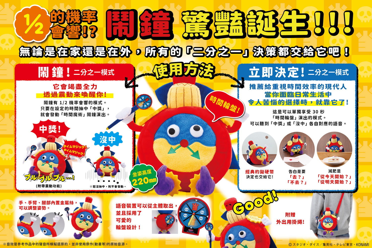 最不可靠、卻最有靈魂的鬧鐘。設定時間一到,時間魔術師會啟動他的「命運轉盤」,只有 50% 的機率成功發動效果——成功?震動+語音叫醒你。失敗?很抱歉,命運選擇讓你繼續睡。1/2 即決模式同步收錄,猶豫不決的時候,就交給時間魔術師吧!按下按鈕,轉盤聲響起,成功或失敗,全憑運氣,超適合玩家日常使用。不只是語音鬧鐘,更是一款懂《遊戲王》的粉絲收藏品。擺在床頭、書桌或展示櫃,都存在感滿滿。海外首發售價 1850 元。