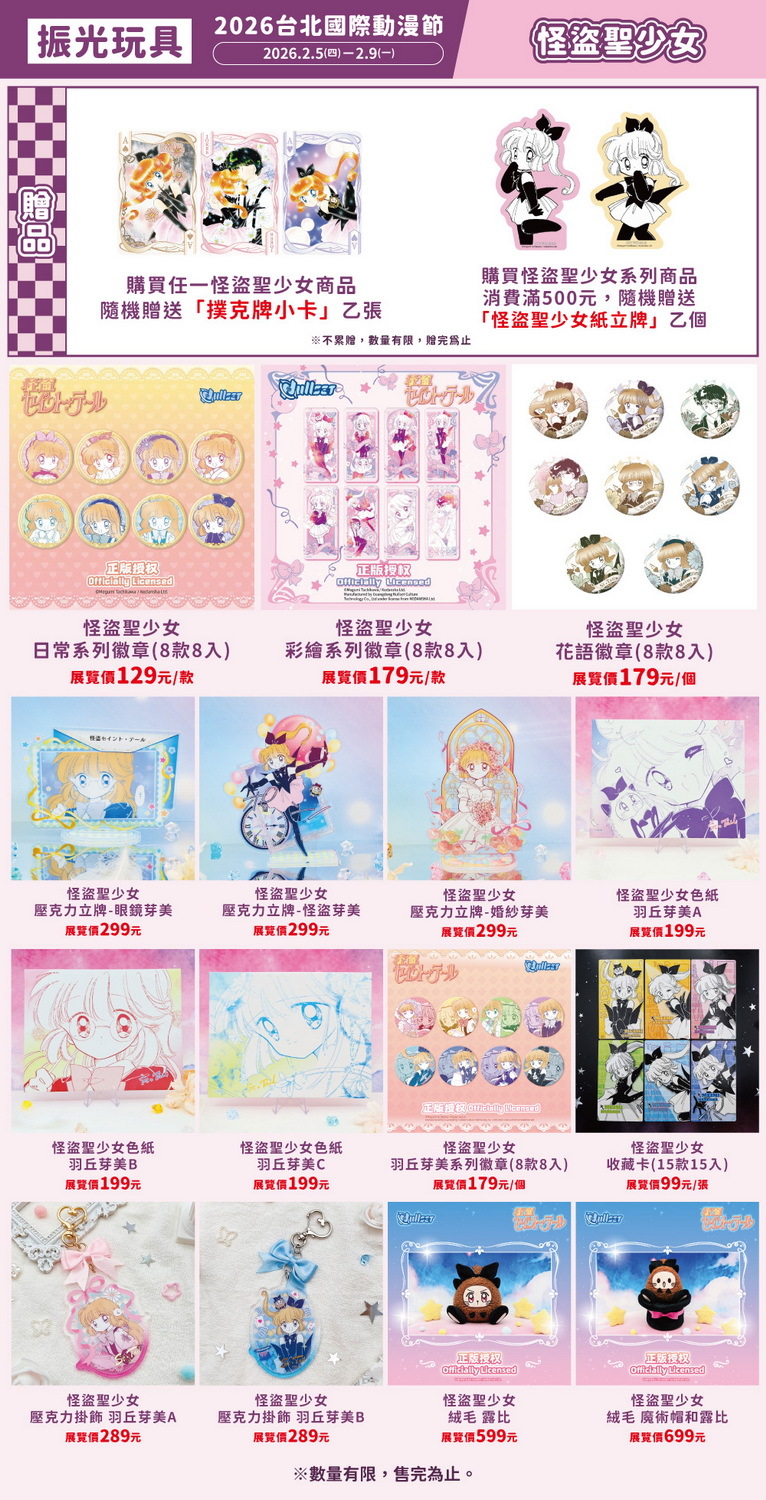 而本次振光玩具於動漫節推出的《怪盜聖少女》授權商品,設計風格延續作品的柔和色調與浪漫氣息,將角色魅力化為值得珍藏的周邊收藏。從可愛又富有辨識度的圖像設計,到細節用心的印刷與配色,無論是老粉絲或初次接觸作品的觀眾,都能感受到《怪盜聖少女》獨有的溫柔與悸動。