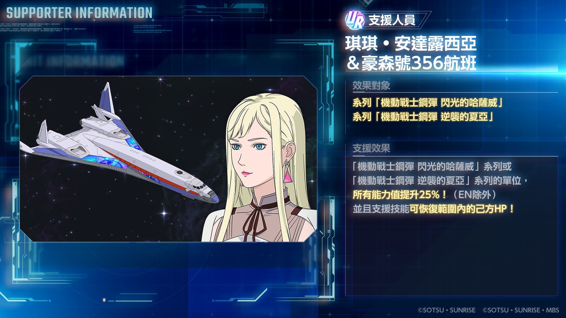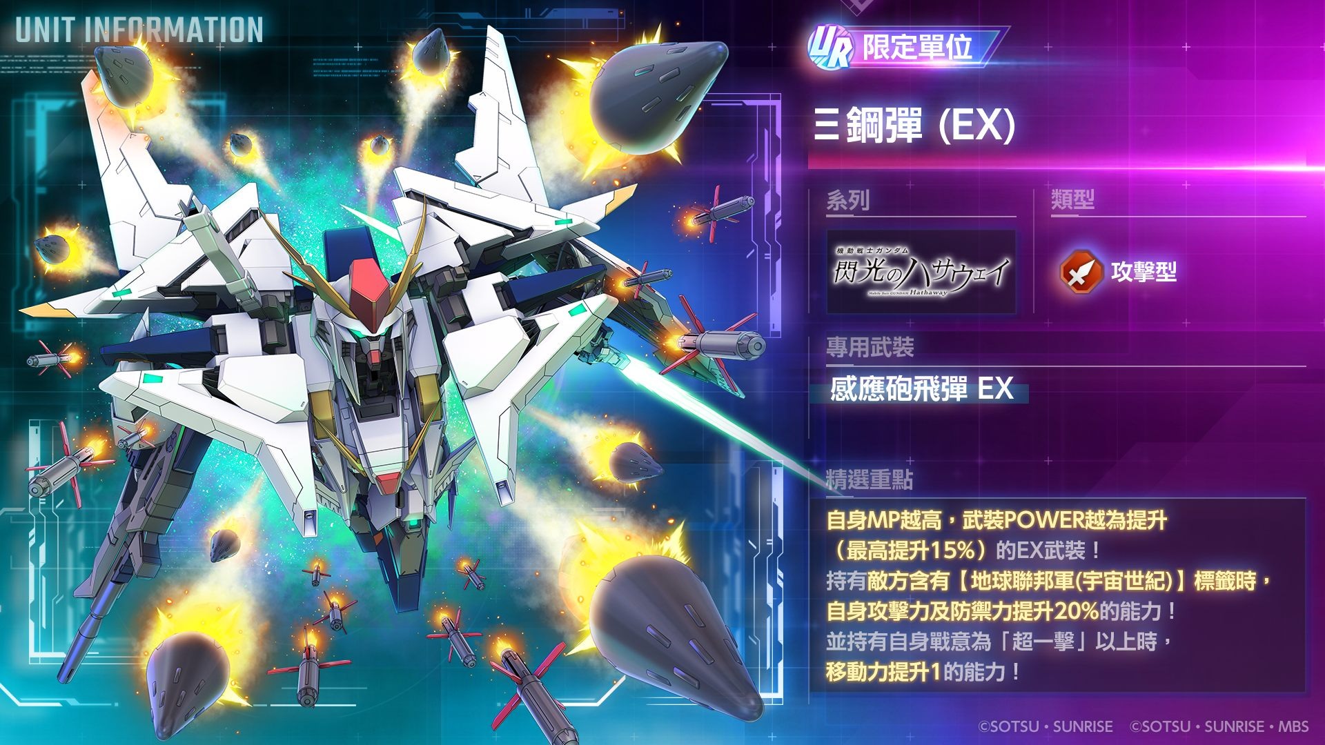 《機動戰士鋼彈 閃光的哈薩威 喀耳刻的魔女》的單位和角色正於精選機體補給中登場,限期登場單位 UR「Ξ 鋼彈(EX)」/UR「哈薩威・諾亞」隆重亮相!並有 UR「佩涅羅珀(EX)」/UR「連恩・艾姆」以及 UR 支援人員「琪琪・安達露西亞&豪森號 356 航班」一併登場。SSR「梅薩 F 型裸裝(指揮官機)」的出現機率同步提升中。