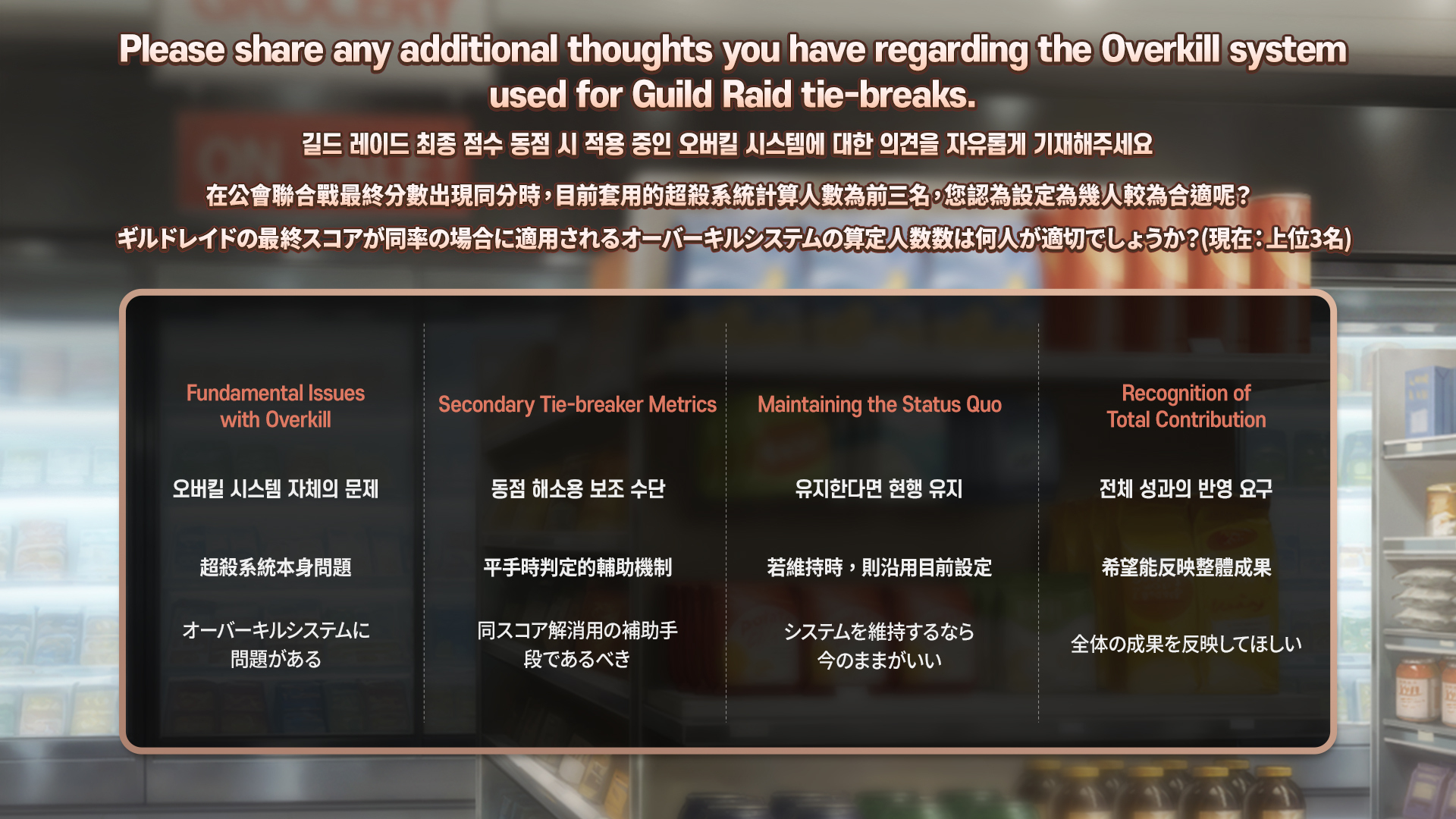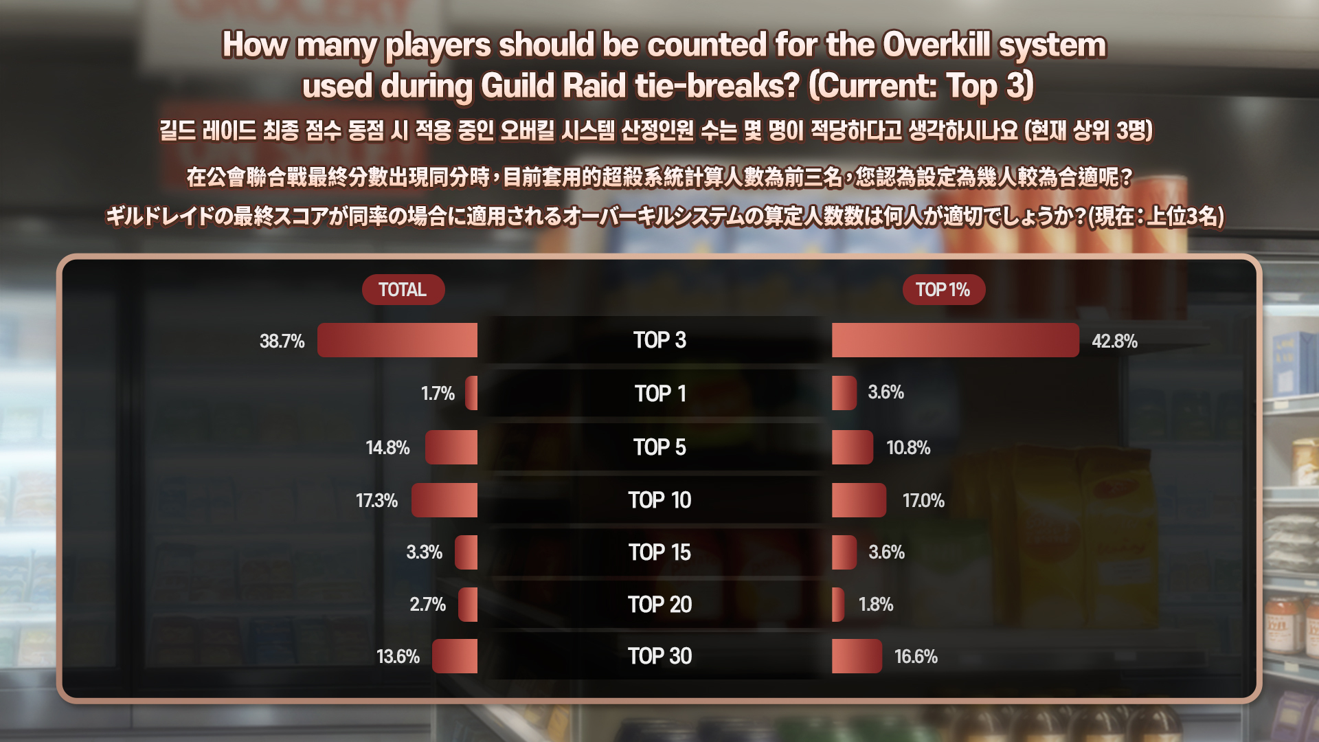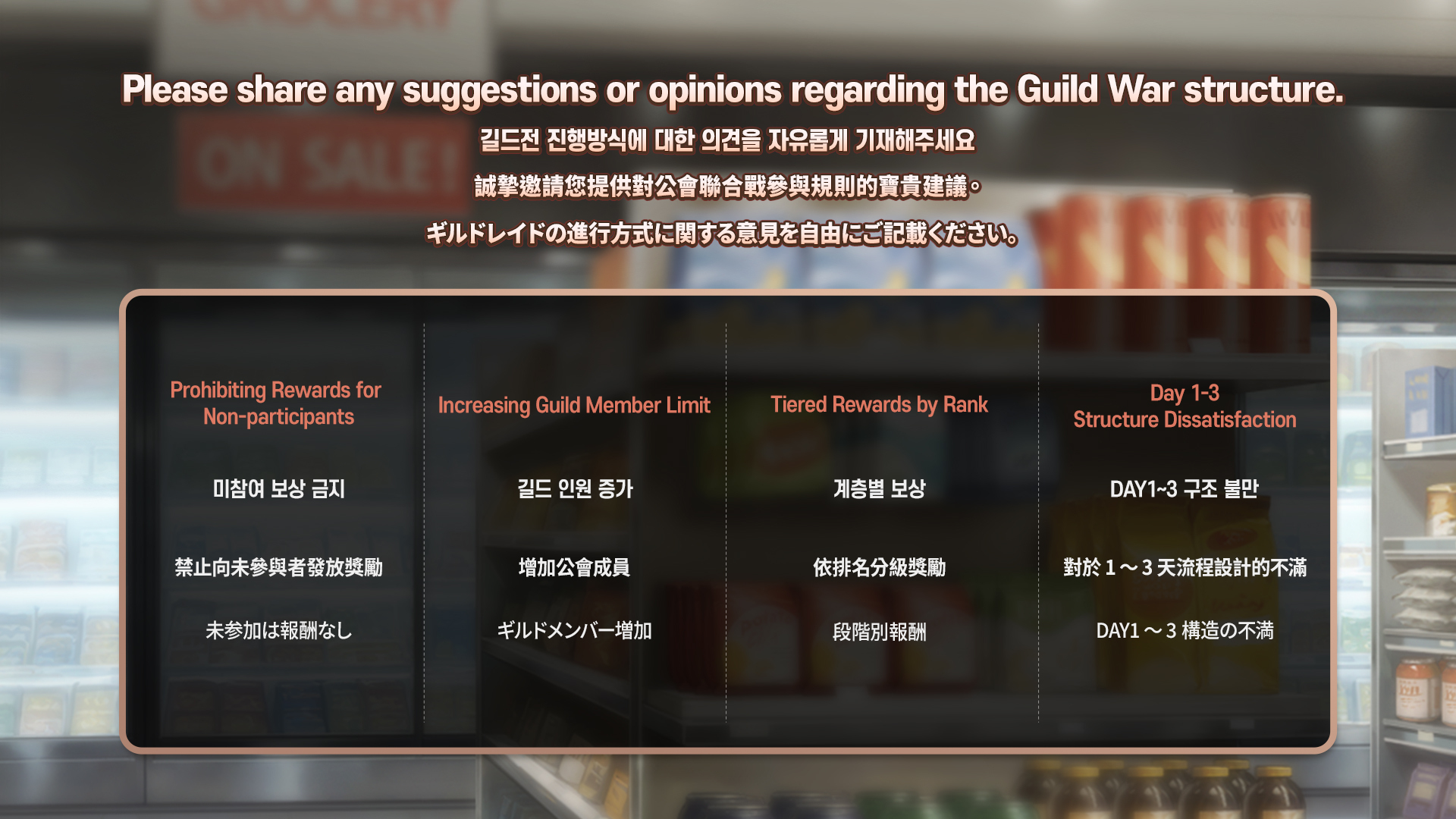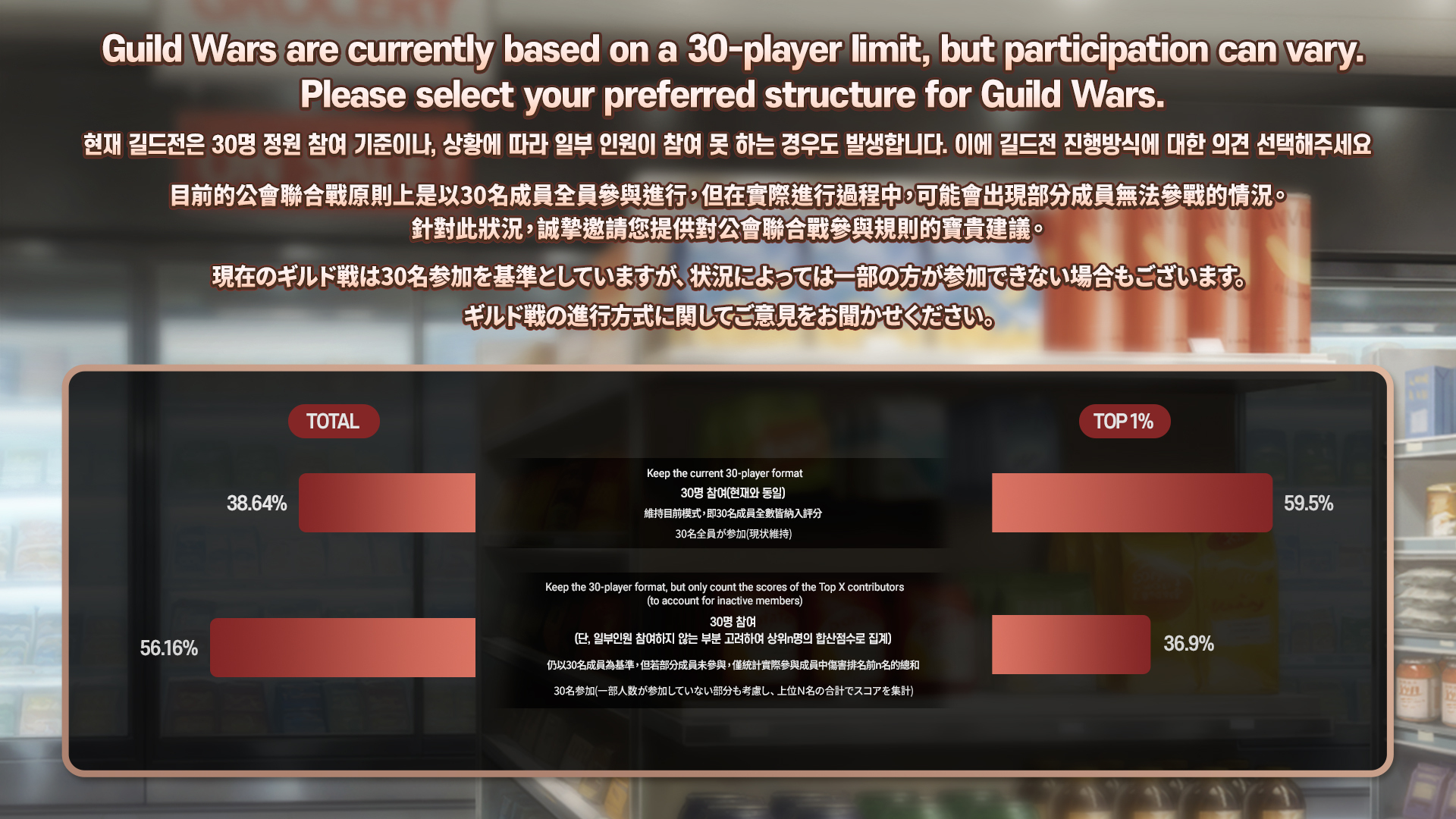 A: 我們在這次公會聯合戰問卷中也再次確認到這點。關於提高公會人數上限、或新增預備成員制度,我們會積極研究。不過在做決定前,也會先綜合評估「只反映前 n 名分數」可能帶來的其他