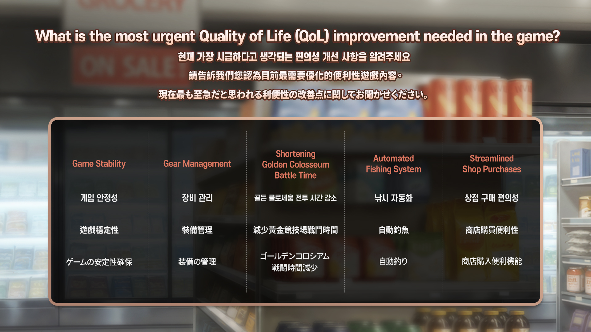 A: 針對角色裝備預設,有玩家希望新增「刪除預設」按鈕。除此之外,還有之前問卷提到的:在戰鬥準備畫面直接換裝、依物理/魔法自動穿戴、一次煉製等多項便利性改善。這些回饋我們也很有感,已列入待辦清單,會再依優先度逐步改善。