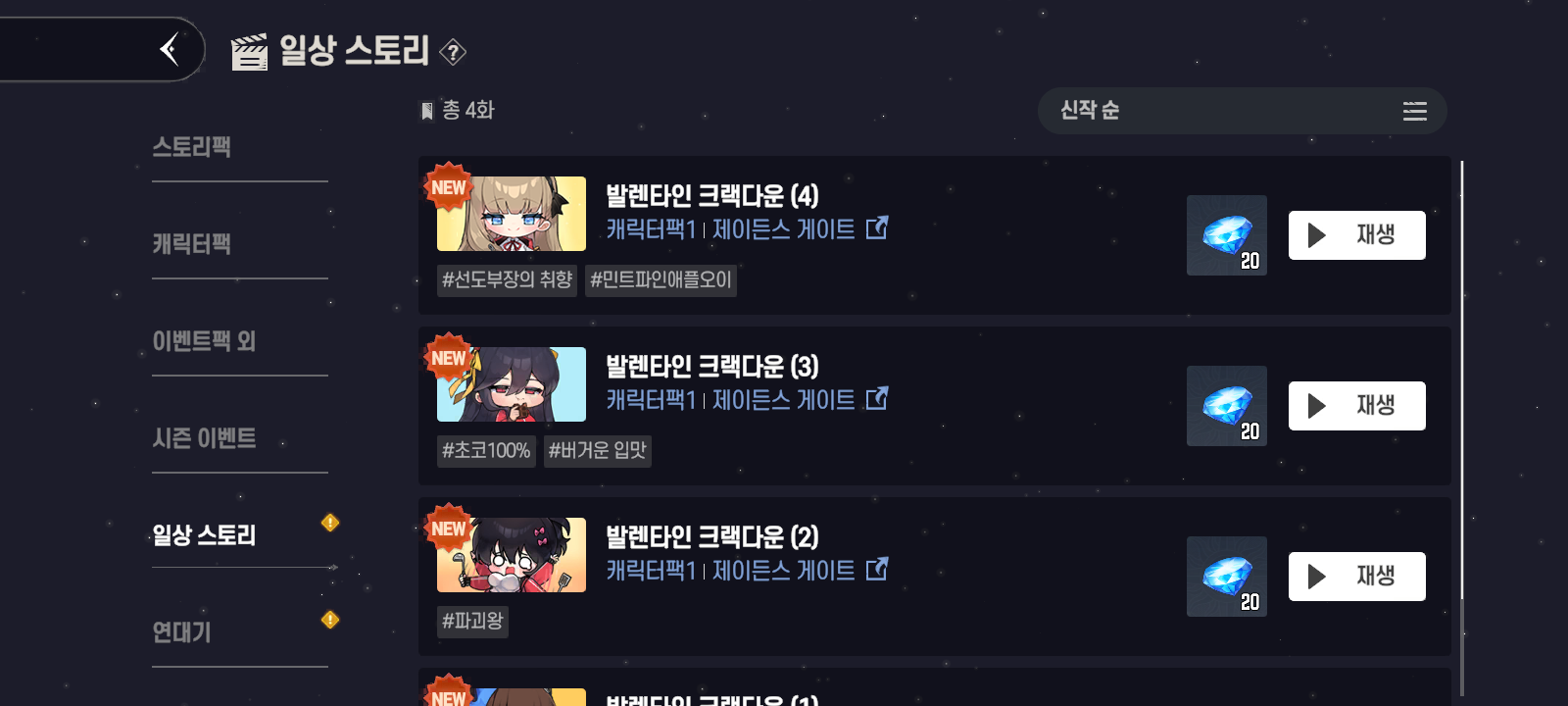 日常故事收錄了登場人物們更加輕鬆、生活化的日常篇章,這些都是主線故事中無法見到的內容。可以在故事選單內的「日常故事」分頁中確認,由於不涉及與現有故事相關的劇透要素,盡可安心地觀看。前面提到的迷你賽季活動的故事,也可以在日常故事選單中重新觀看。日常故事是由短篇集形式的篇章組成,並會以視覺小說的方式來呈現。
