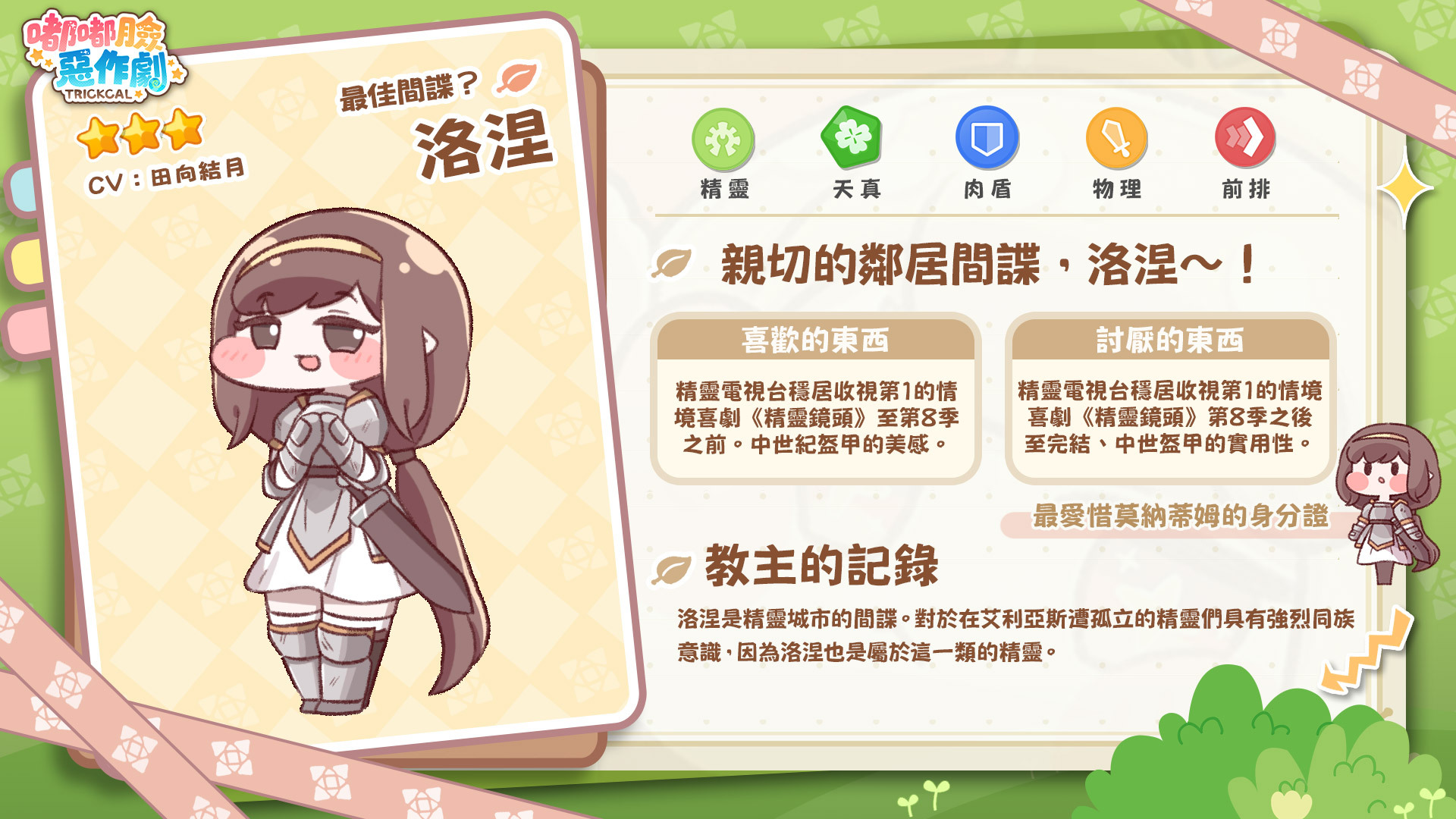 在遊戲玩法方面則採自走棋相關機制與回合制的融合玩法,系統皆搭配自動戰鬥與掃蕩功能,將遊玩難度及作業感降到最低最低,使不小心睡過頭或會議時間過長也不會影響到各種收益,即便再忙都可以輕鬆遊玩。而官方也在近期釋出「最佳間諜?」洛涅(CV:田向結月)使者檔案,供玩家們先睹為快。洛涅是精靈城市的間諜。洛涅在從事這份職業時,常常出現許多傻乎乎的行為舉止,不,也有可能是因為她長期以來只受到間諜相關的教育,不了解其他領域。