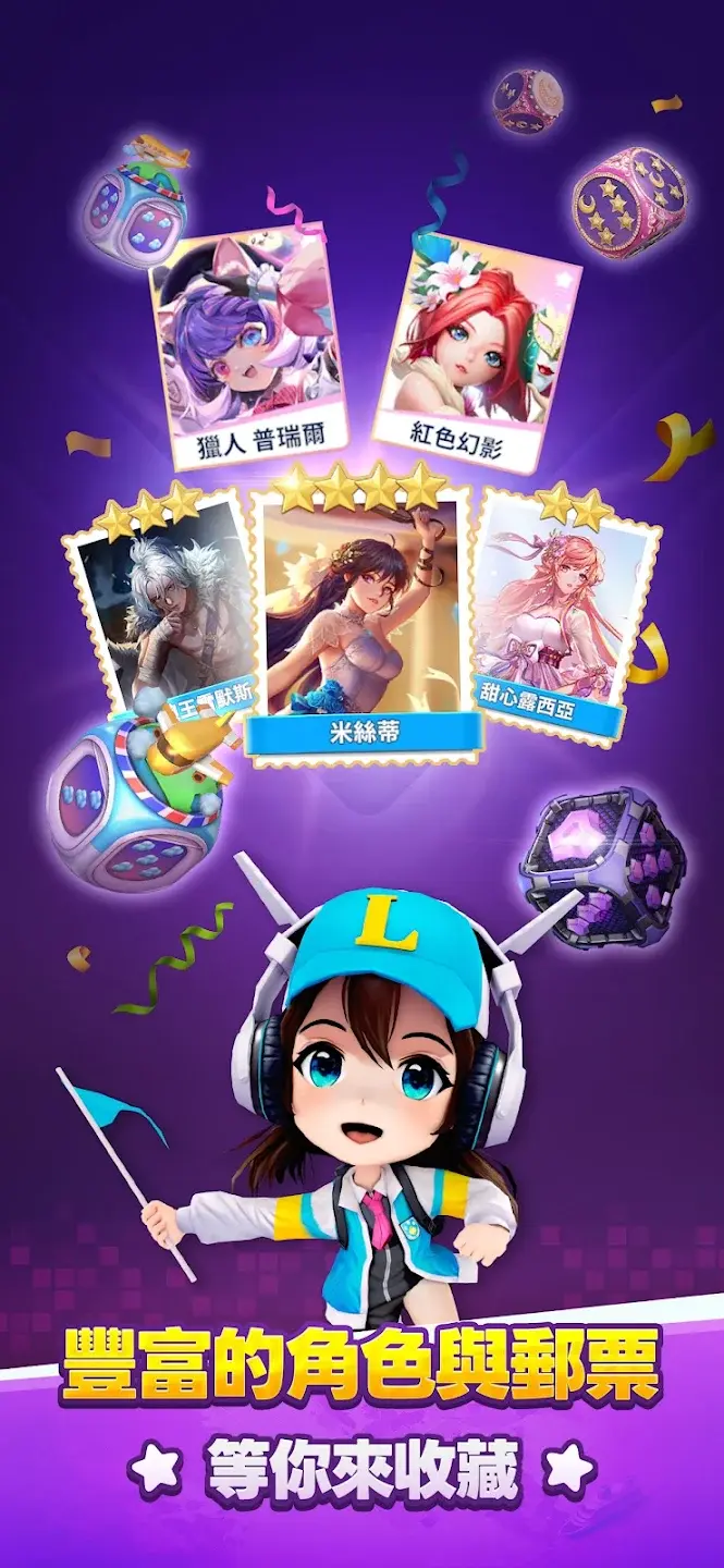 LINE 大亨向前衝 》中,玩家可以穿梭於多樣的遊戲世界,隨著每一次擲骰做出戰術決策。簡單的遊戲機制讓玩家能在各種主題關卡中競爭,在過程中用特殊技能來蒐集獨特可愛的角色、郵票與骰子等,為每場對戰增添策略深度與個人化特色。此外,玩家將可以透過趣味十足的迷你遊戲放鬆身心,並贏得遊戲內的道具與獎勵。