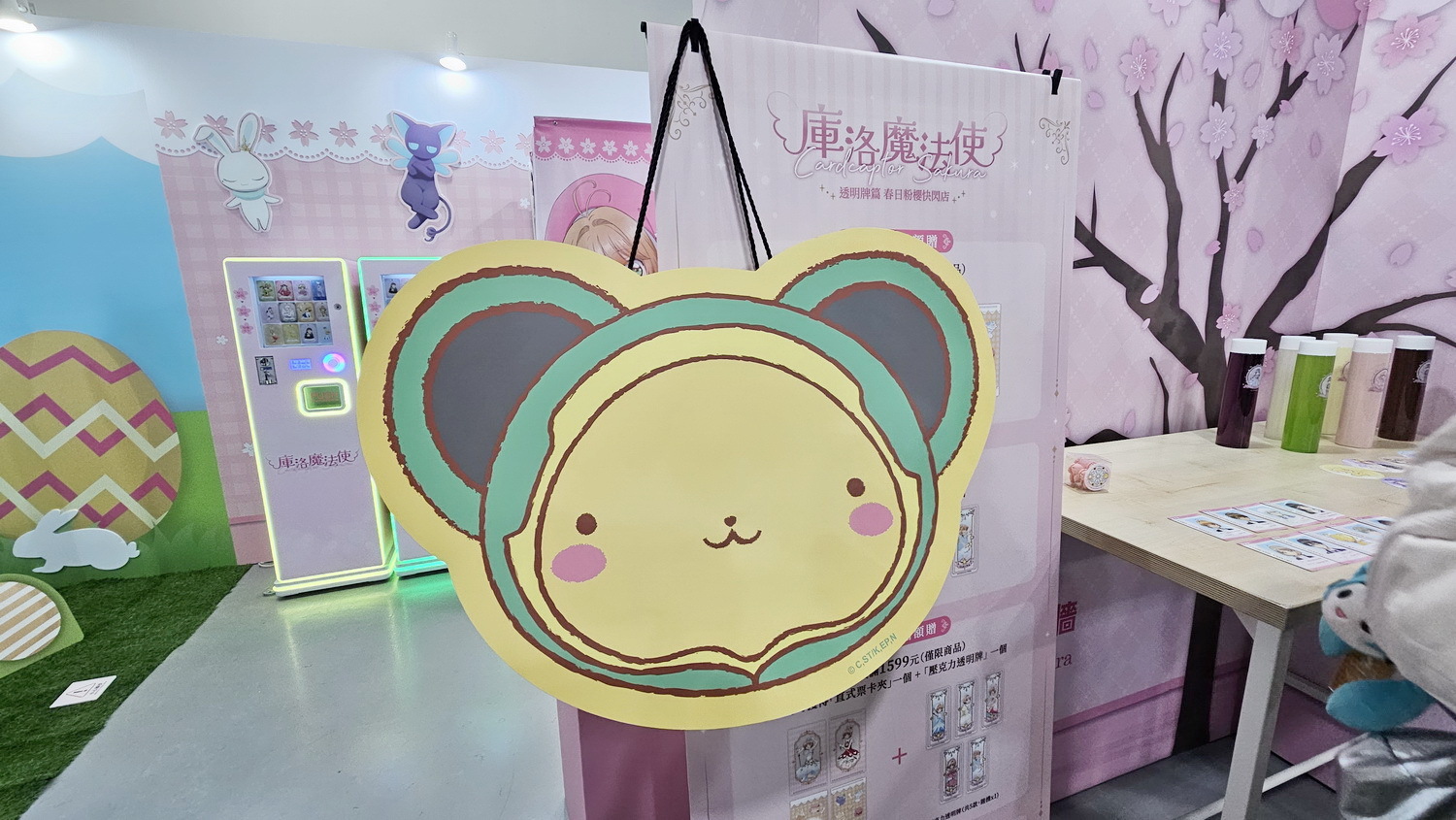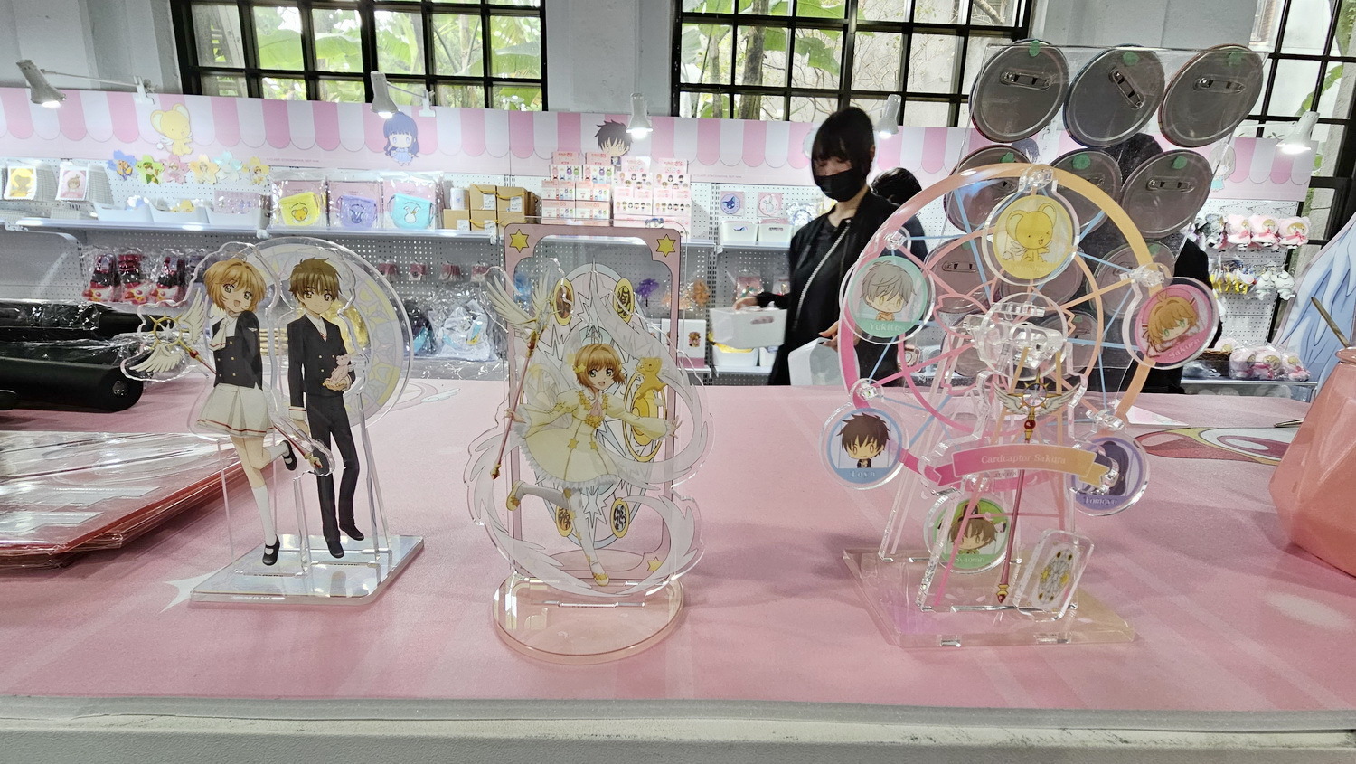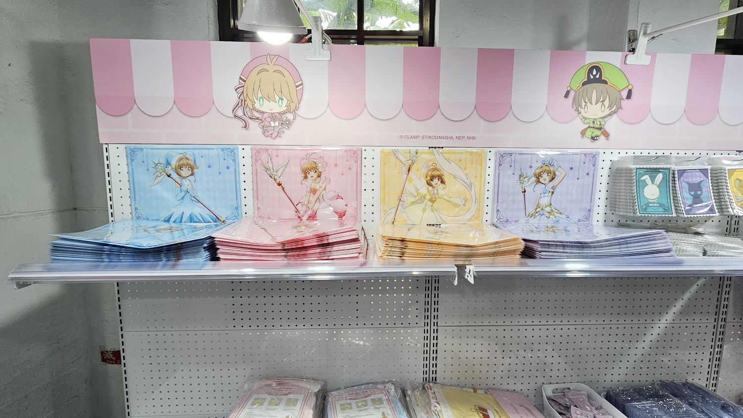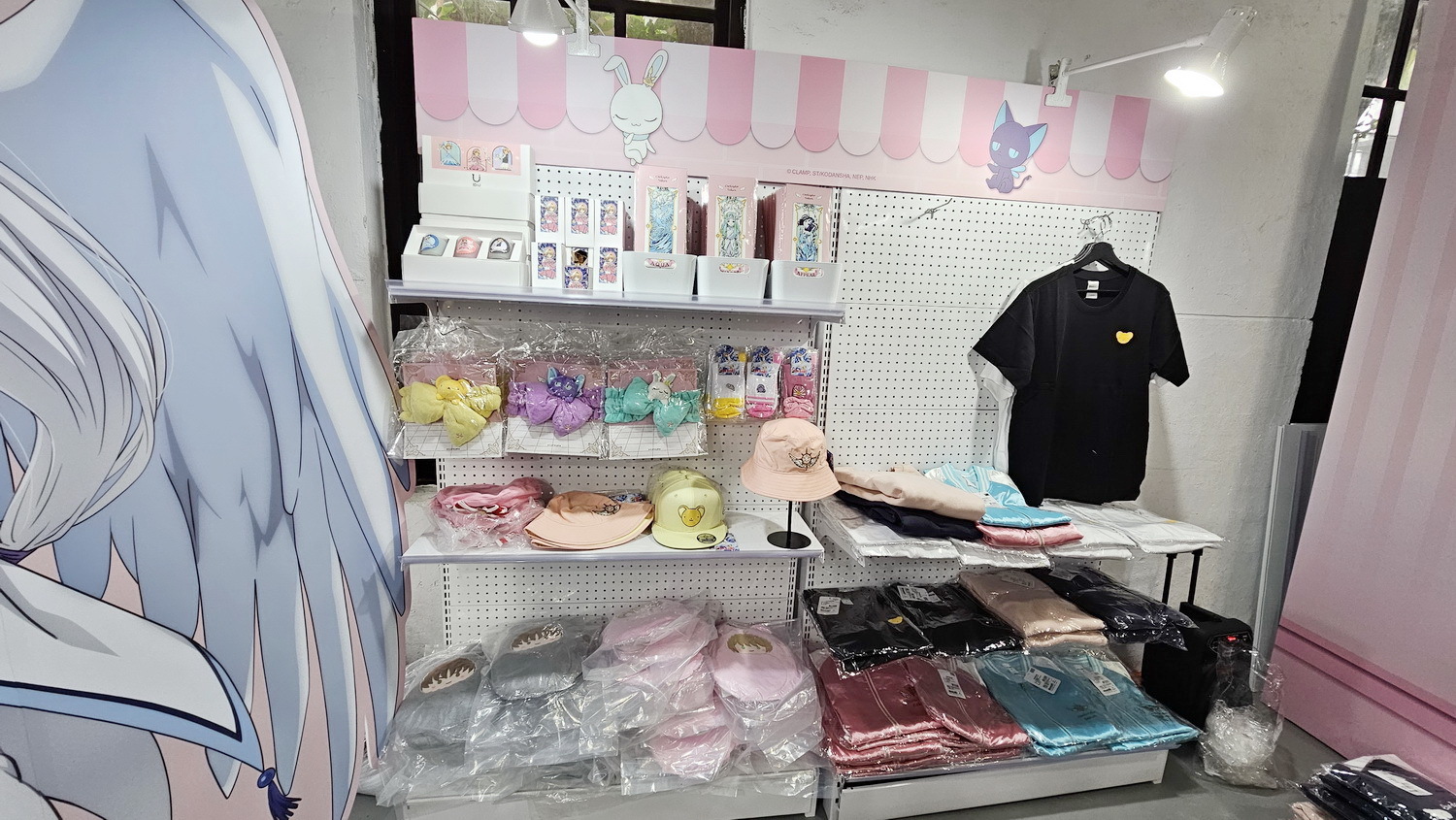 周邊部分也推出多款限定商品,包含愛心造型盲抽徽章(10 款)、可轉動的摩天輪造型壓克力立牌、小可卡套、A4 橫式資料夾(4 款配色,搭配小櫻不同戰鬥服)、銀箔材質郵票造型明信片,以及透紗刺繡 T 恤、短版 T 恤與多款摺疊購物袋。凡於快閃店內消費滿 999 元,即可以 129元 加價購青蛙裝小可造型大紙袋。